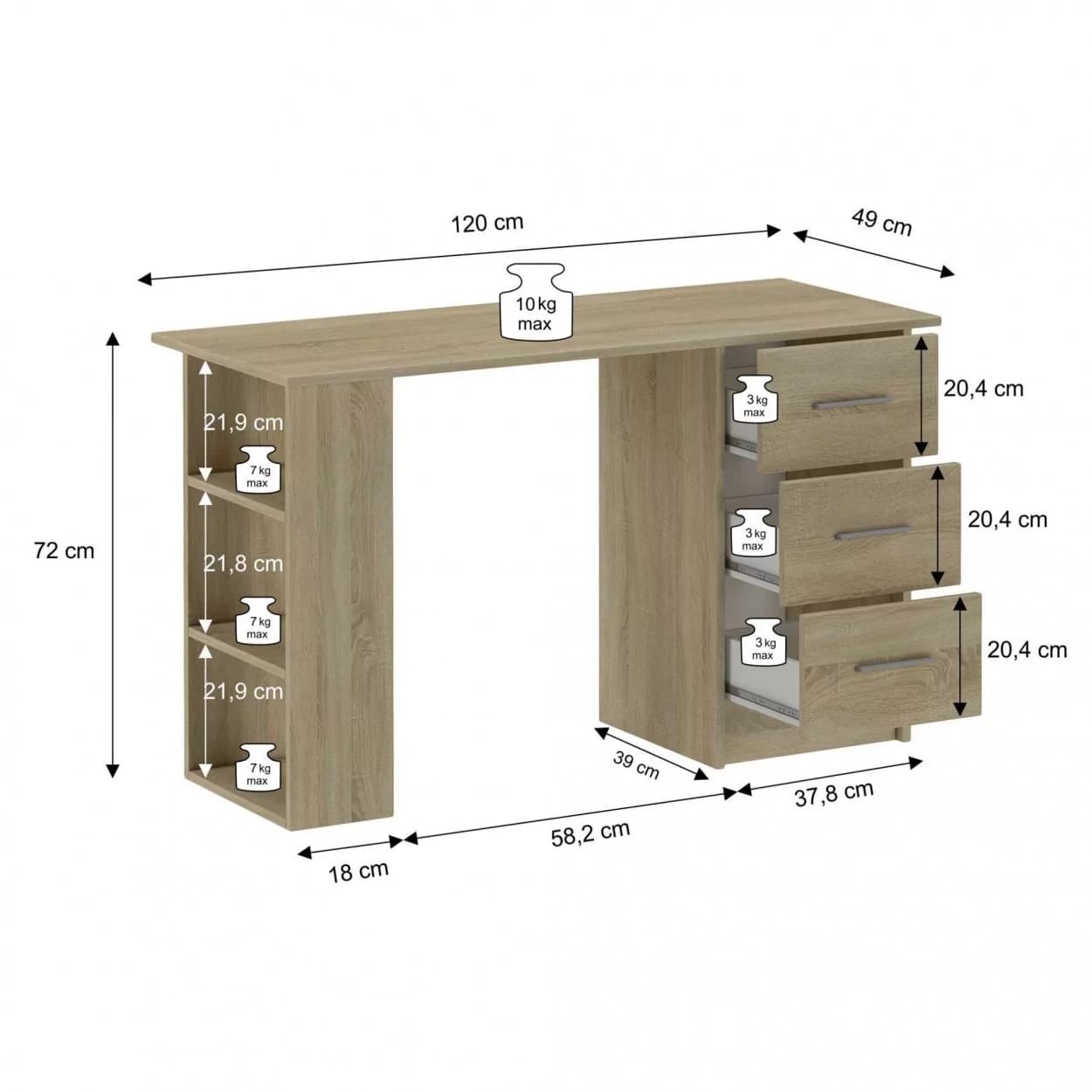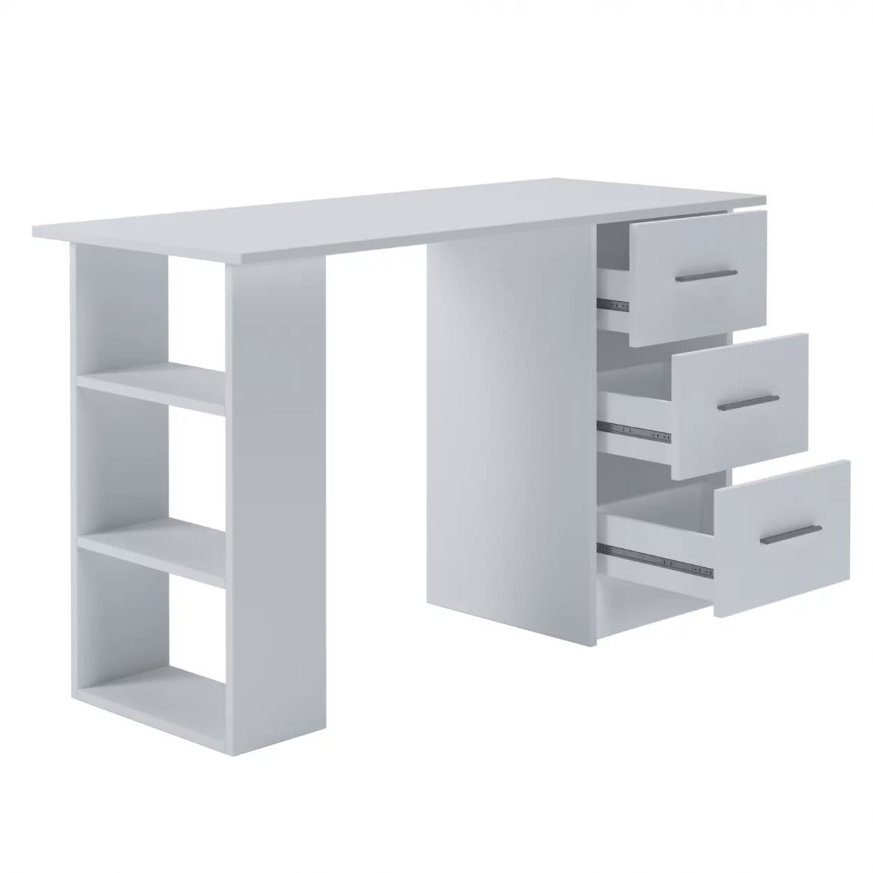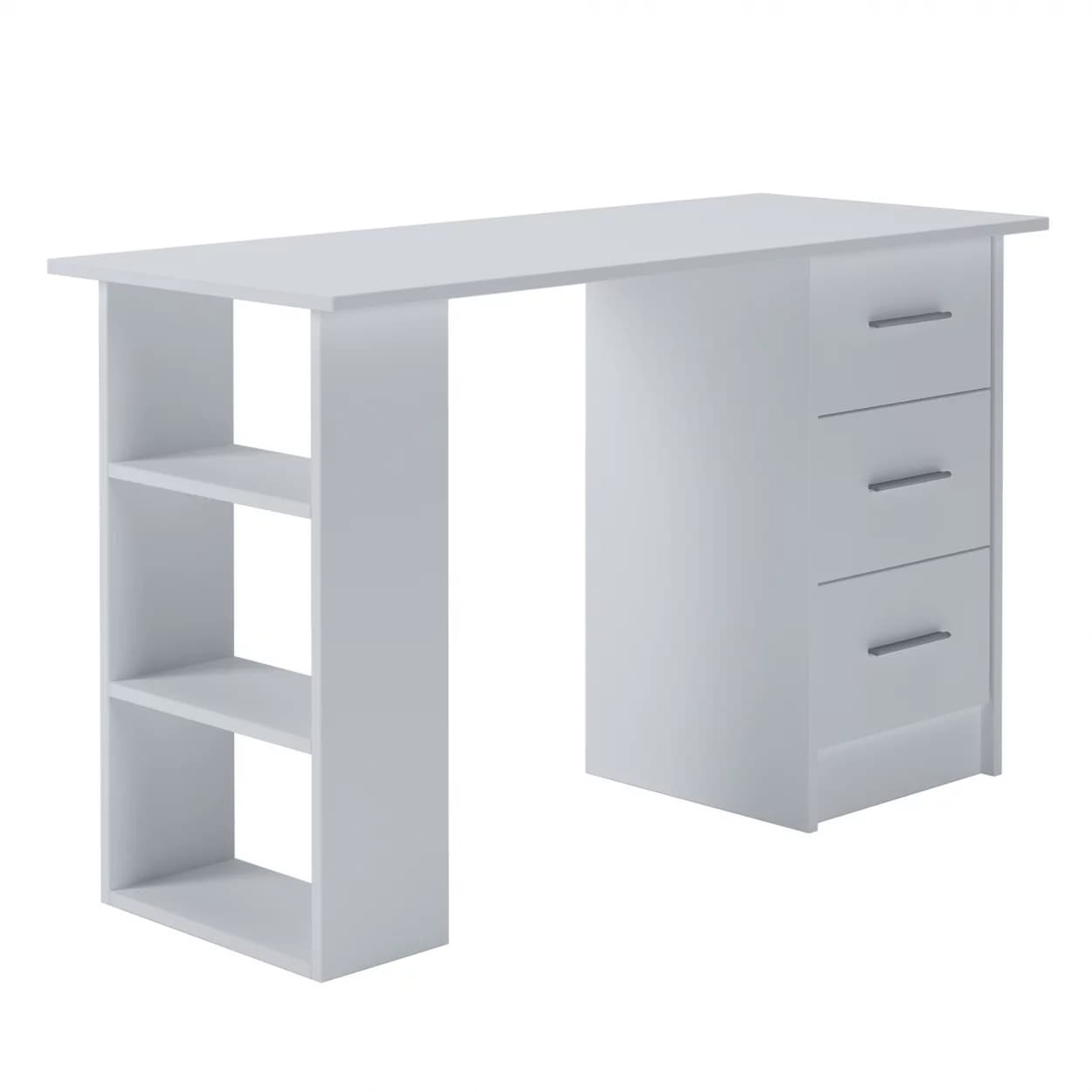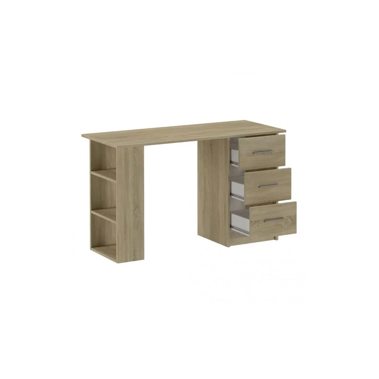 Funkcjonalne biurko SMART z trzema szufladami i półkami, dostępne w kolorze biały mat lub dąb sonoma – idealne do nauki, pracy i codziennego użytku.