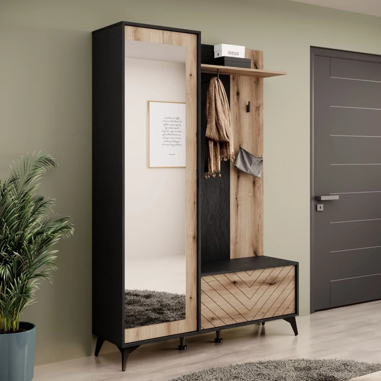 Garderoba KELLY z frezowanym frontem w jodełkę i tapicerowanym siedziskiem to praktyczny i elegancki mebel do przedpokoju, oferujący funkcjonalność oraz nowoczesny design.