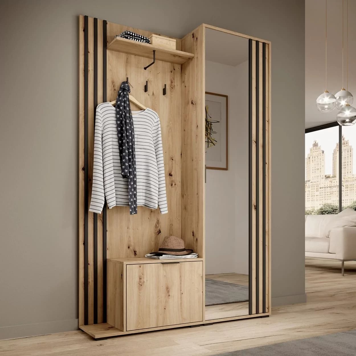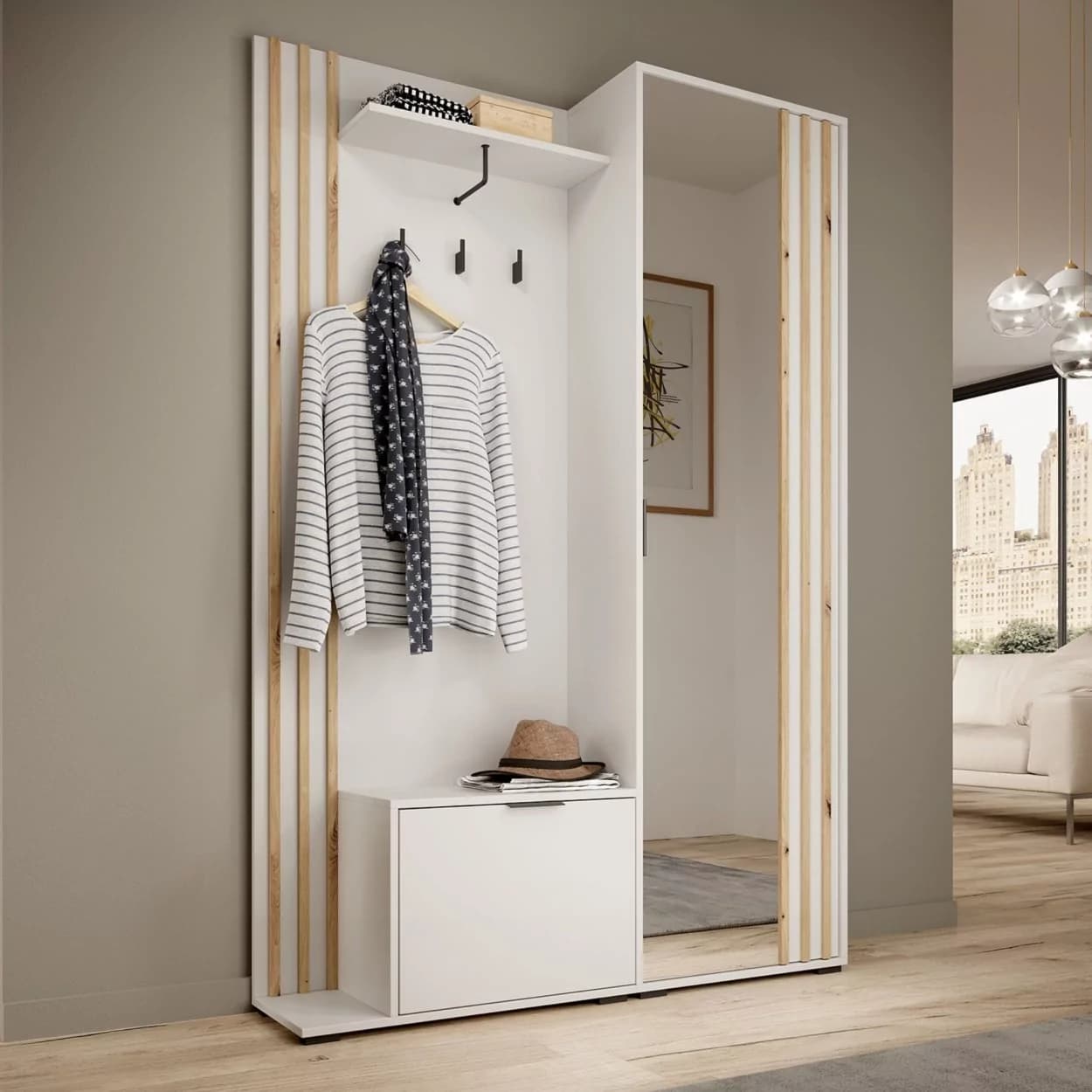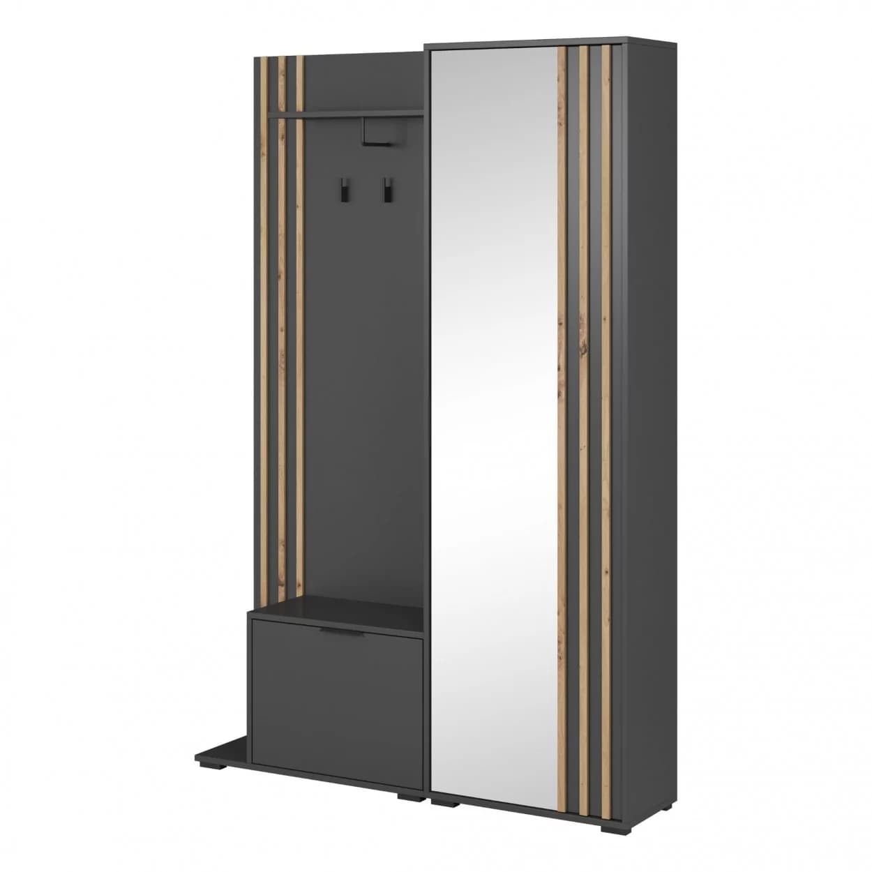 Garderoba NELI to idealne rozwiązanie do przechowywania ubrań i obuwia. Wyposażona w szafkę na buty, szafę z lustrem, wieszakami i półką, oferuje dużo miejsca na porządek w Twoim wnętrzu. Dodatkowo, możliwość wyboru montażu siedziska po lewej lub prawej stronie sprawia, że jest w pełni dostosowana do Twoich potrzeb.