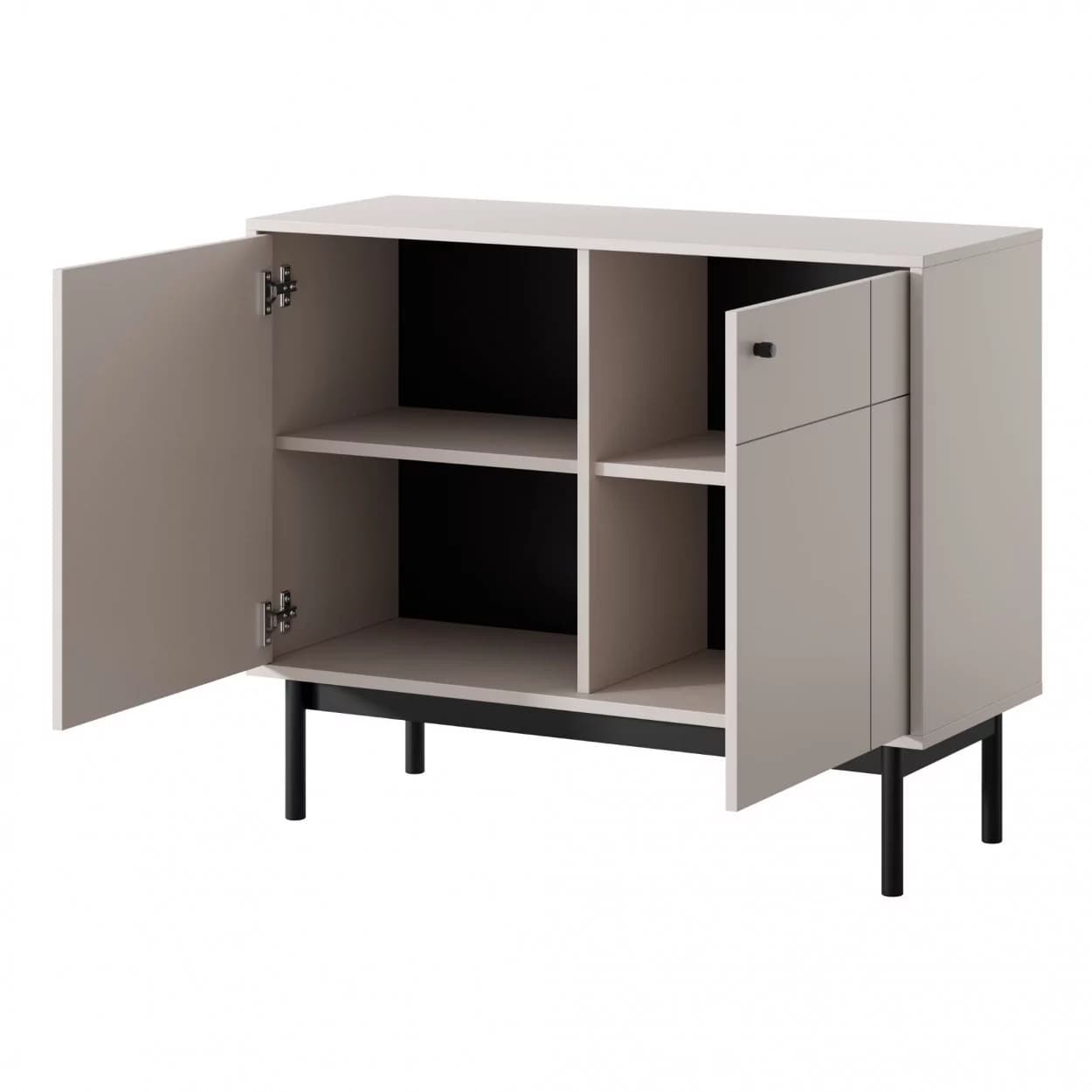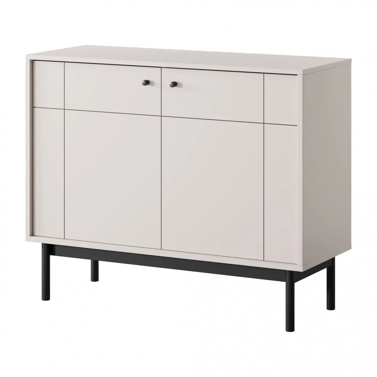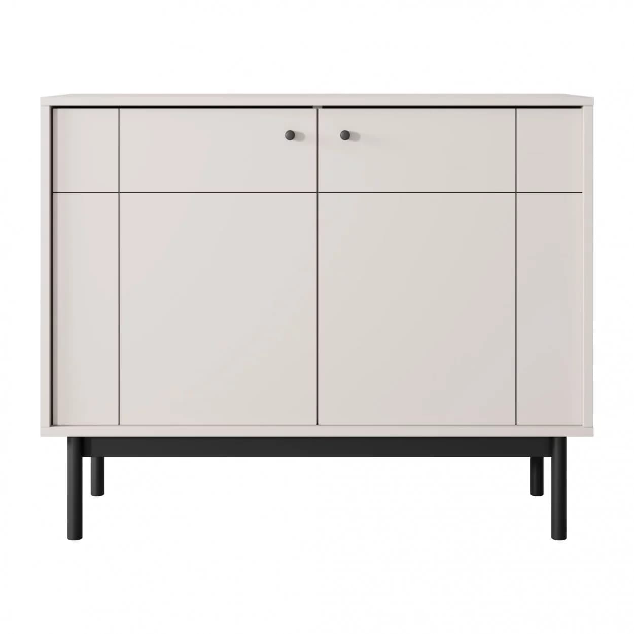 Komoda dwudrzwiowa SCALA w kolorze kaszmiru to funkcjonalny mebel o drewnianym stelażu i czarnych metalowych uchwytach, który łączy praktyczność z nowoczesnym stylem. Czarny frez na froncie dodaje szyku, a przestronna powierzchnia do przechowywania sprawia, że komoda świetnie sprawdzi się w każdym wnętrzu.
