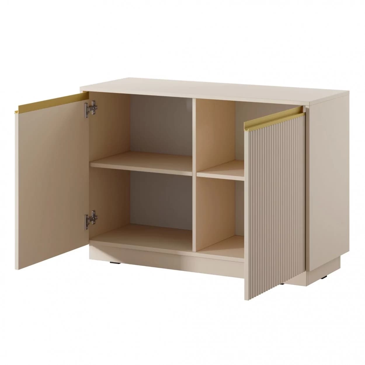 Nowoczesna komoda dwudrzwiowa z frezowanym frontem i złotymi uchwytami listwowymi. Wyposażona w półki i cichy domyk, łączy funkcjonalność z elegancją.