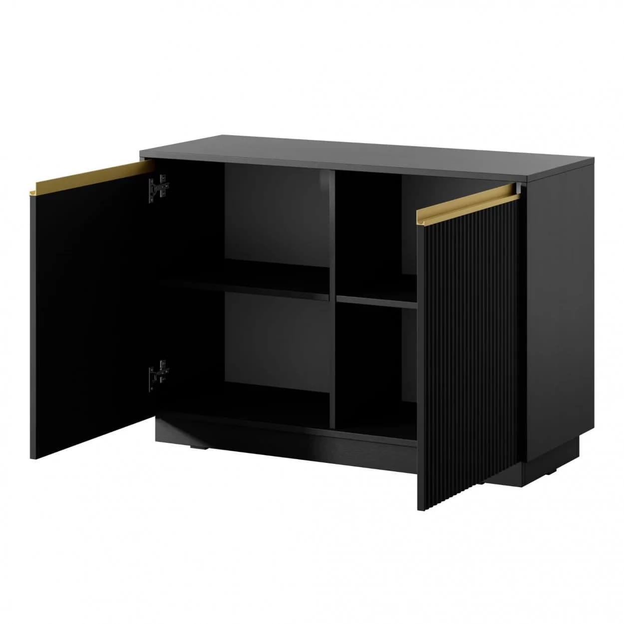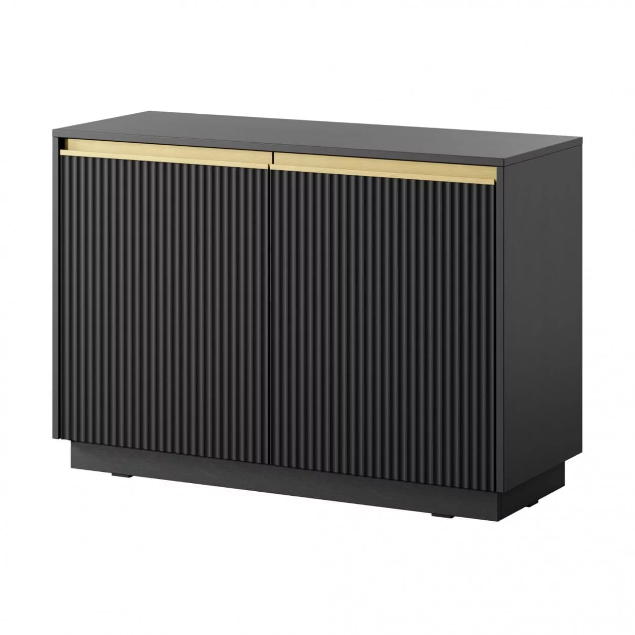 Komoda SHINE w czarnym kolorze z frezowanym frontem i złotymi uchwytami listwowymi. Na cokole, z dwiema pojemnymi półkami i cichymi zawiasami — funkcjonalna i stylowa do nowoczesnych wnętrz.