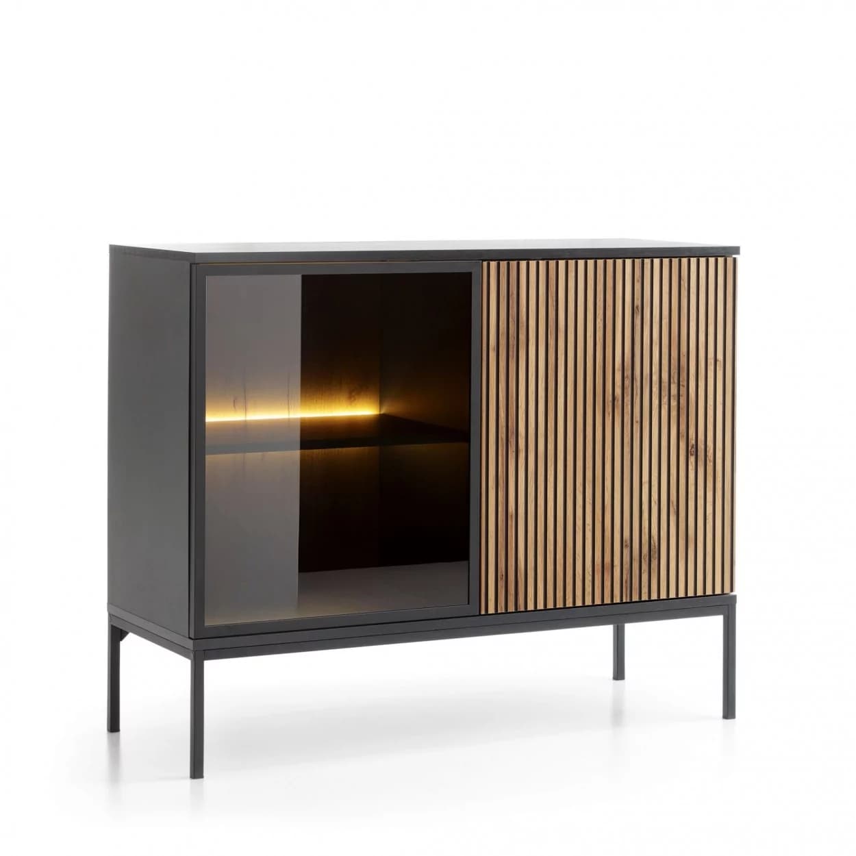 Komoda SORENTO w eleganckiej czerni z oświetleniem LED i lamelami 3D w odcieniu dębu wotan to nowoczesny i efektowny element każdego wnętrza. Osadzona na metalowych nóżkach, łączy trwałość z wyjątkowym designem, zapewniając także praktyczne rozwiązania do przechowywania.