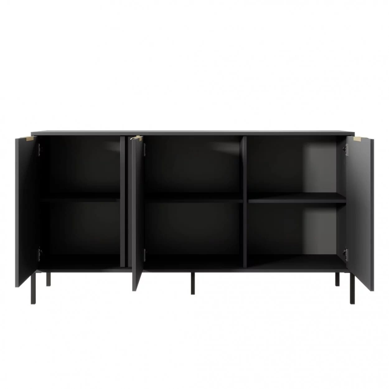Komoda RISCO trzydrzwiowa w antracytowym kolorze z złotymi uchwytami to elegancki i funkcjonalny mebel. Przestronne szafki oraz solidne metalowe nogi zapewniają wygodę i trwałość. Idealna do nowoczesnych wnętrz.