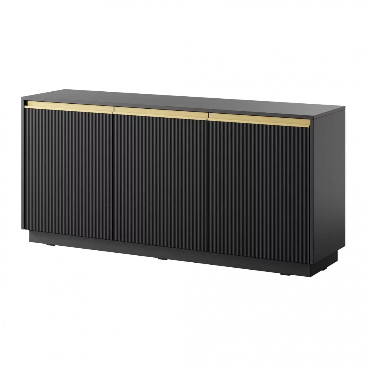 Komoda SHINE w kolorze czarnym to połączenie nowoczesnego designu i funkcjonalności. Wyposażona w frezowane fronty, złote uchwyty i trzy pojemne półki, doskonale sprawdzi się w każdym wnętrzu.