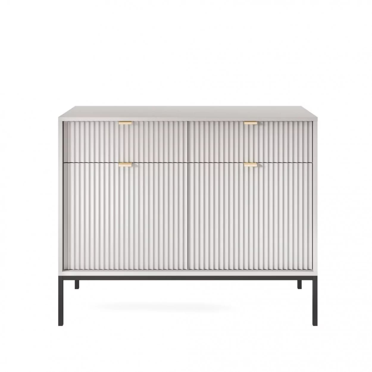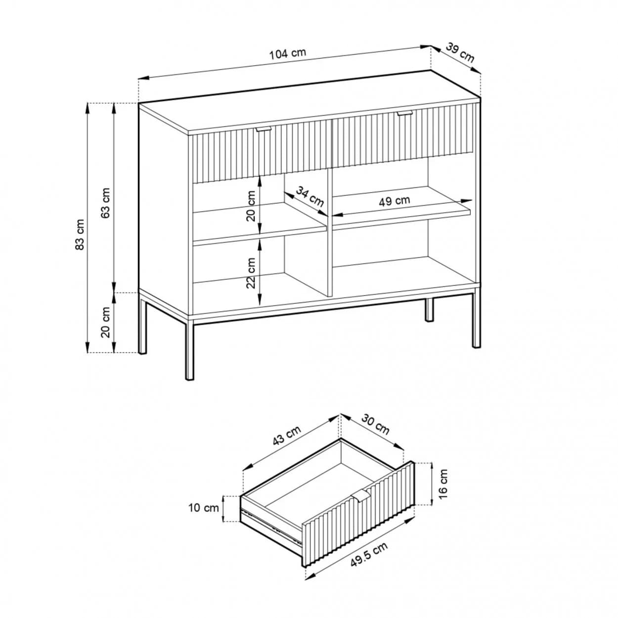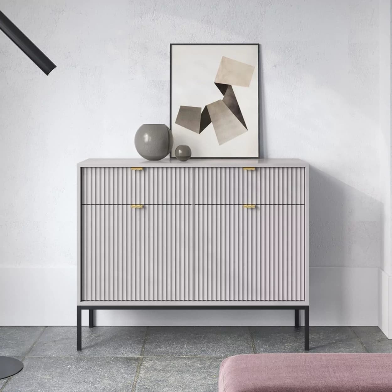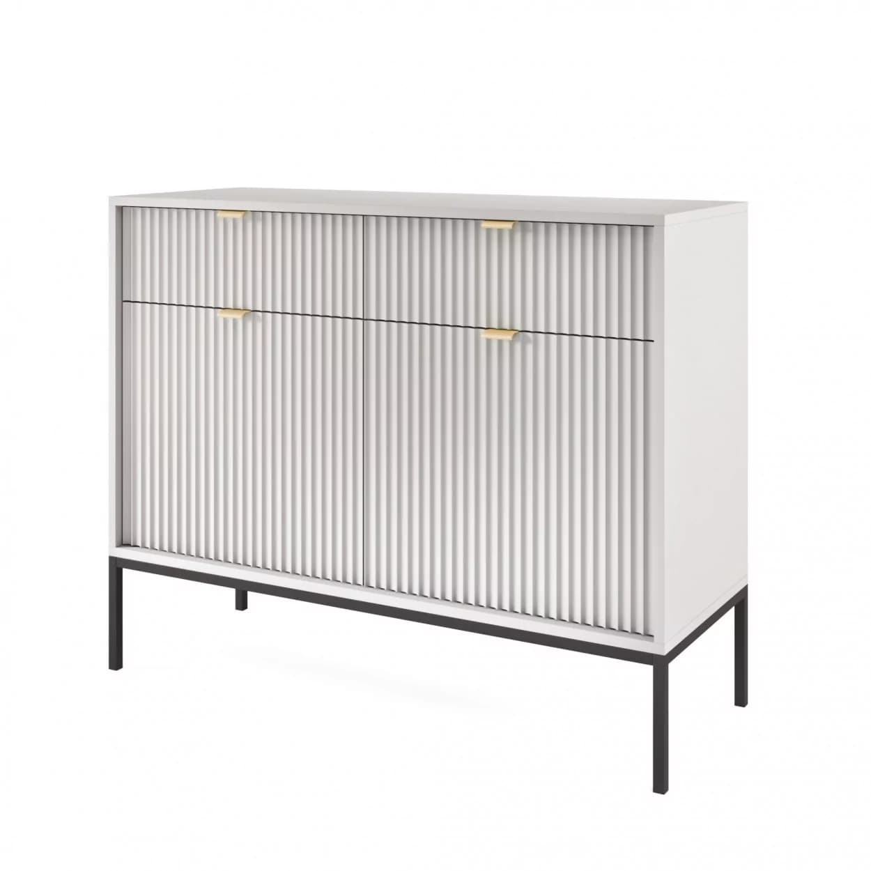 Nowoczesna komoda z ryflowanymi frontami i metalowymi nóżkami. Pojemne szuflady i szafki zapewniają funkcjonalność, a stylowy design uzupełnia każde wnętrze.