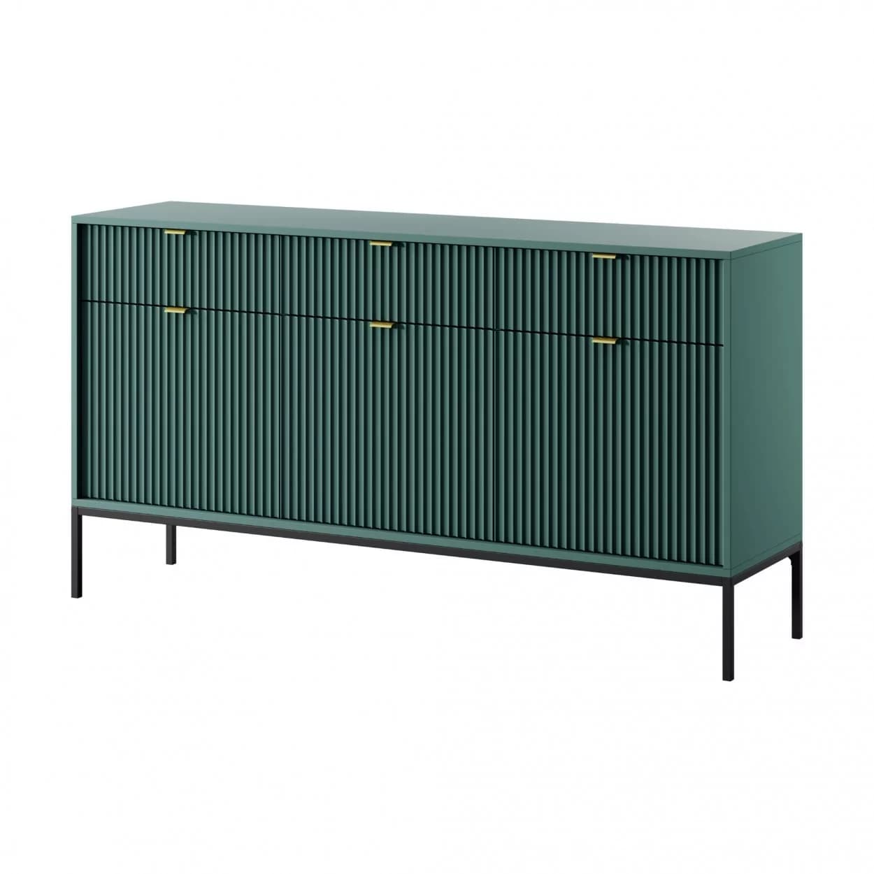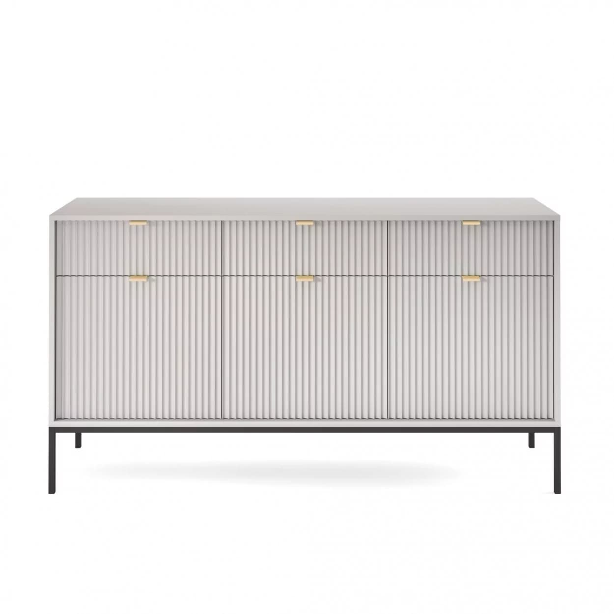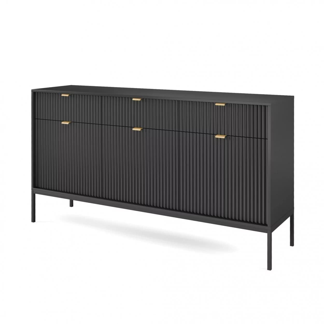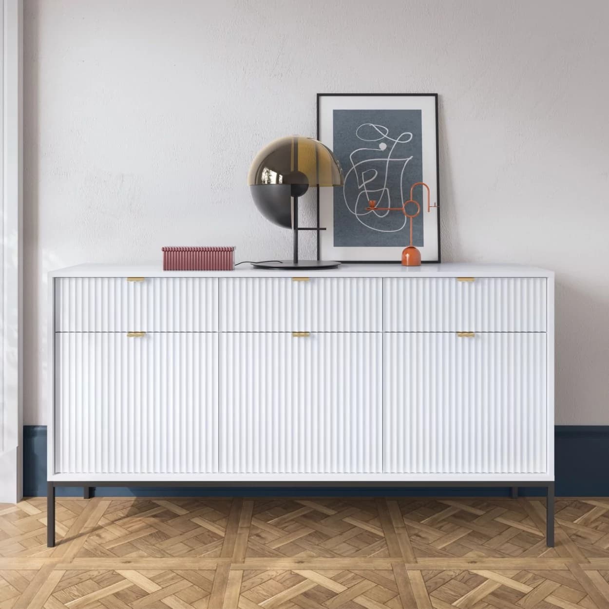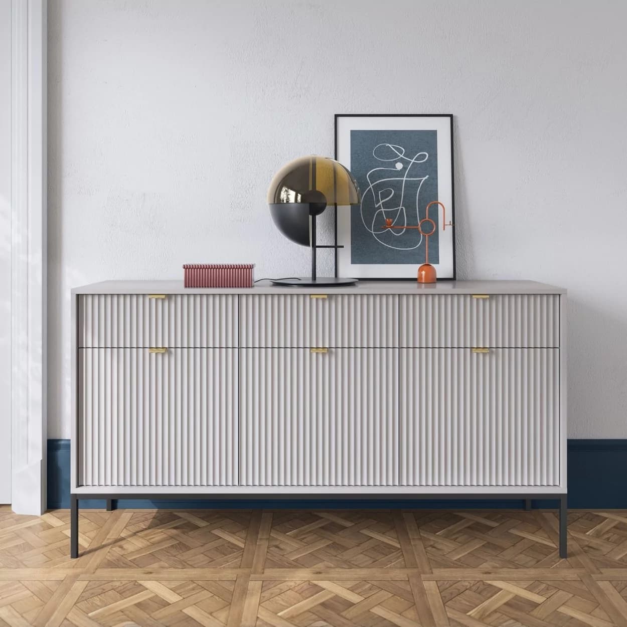 Komoda VESTA dostępna w czterech wariantach kolorystycznych wyróżnia się efektownymi ryflowanymi frontami oraz solidnymi metalowymi nóżkami. Wyposażona w trzy pojemne szuflady i szafki, oferuje przestronność i świetną organizację.