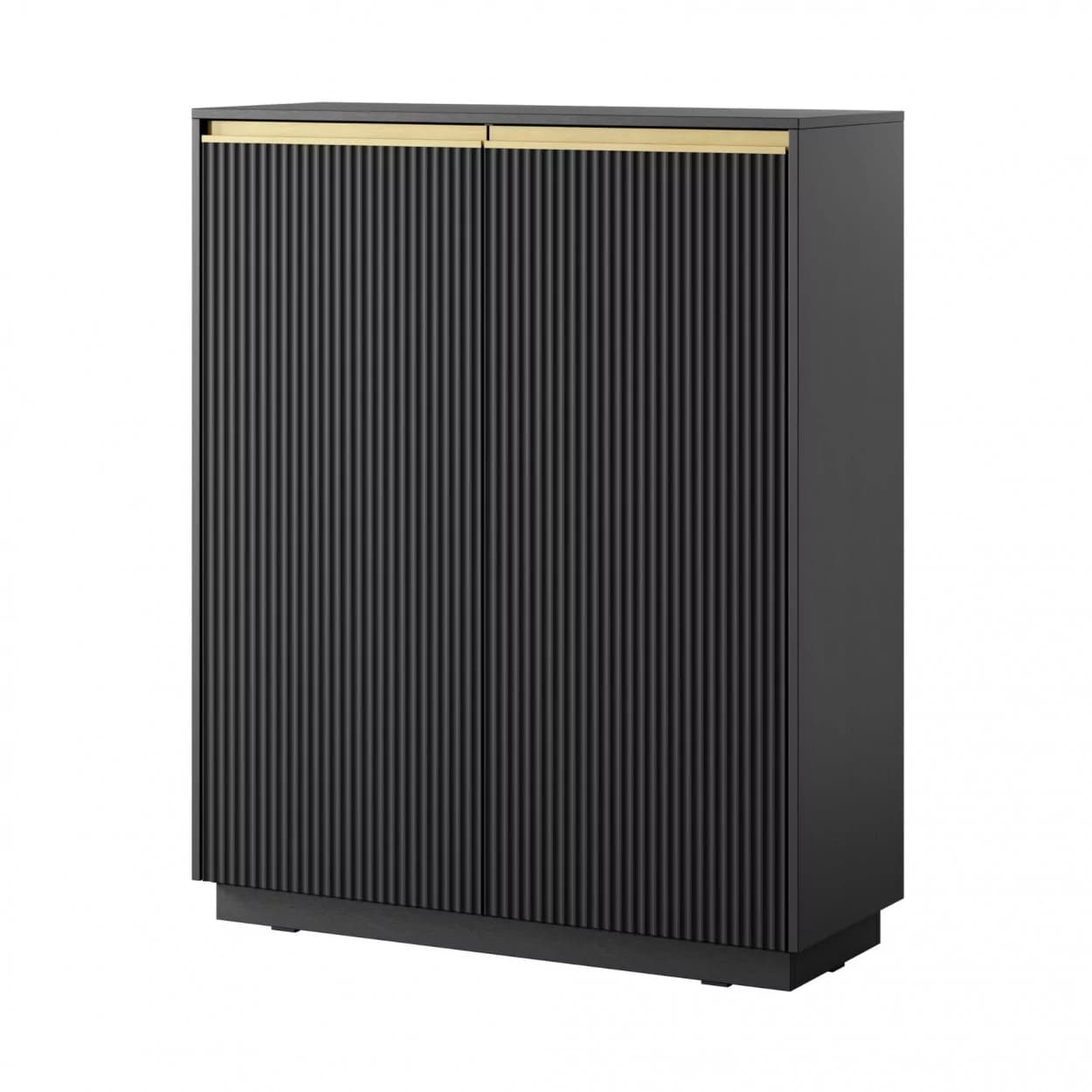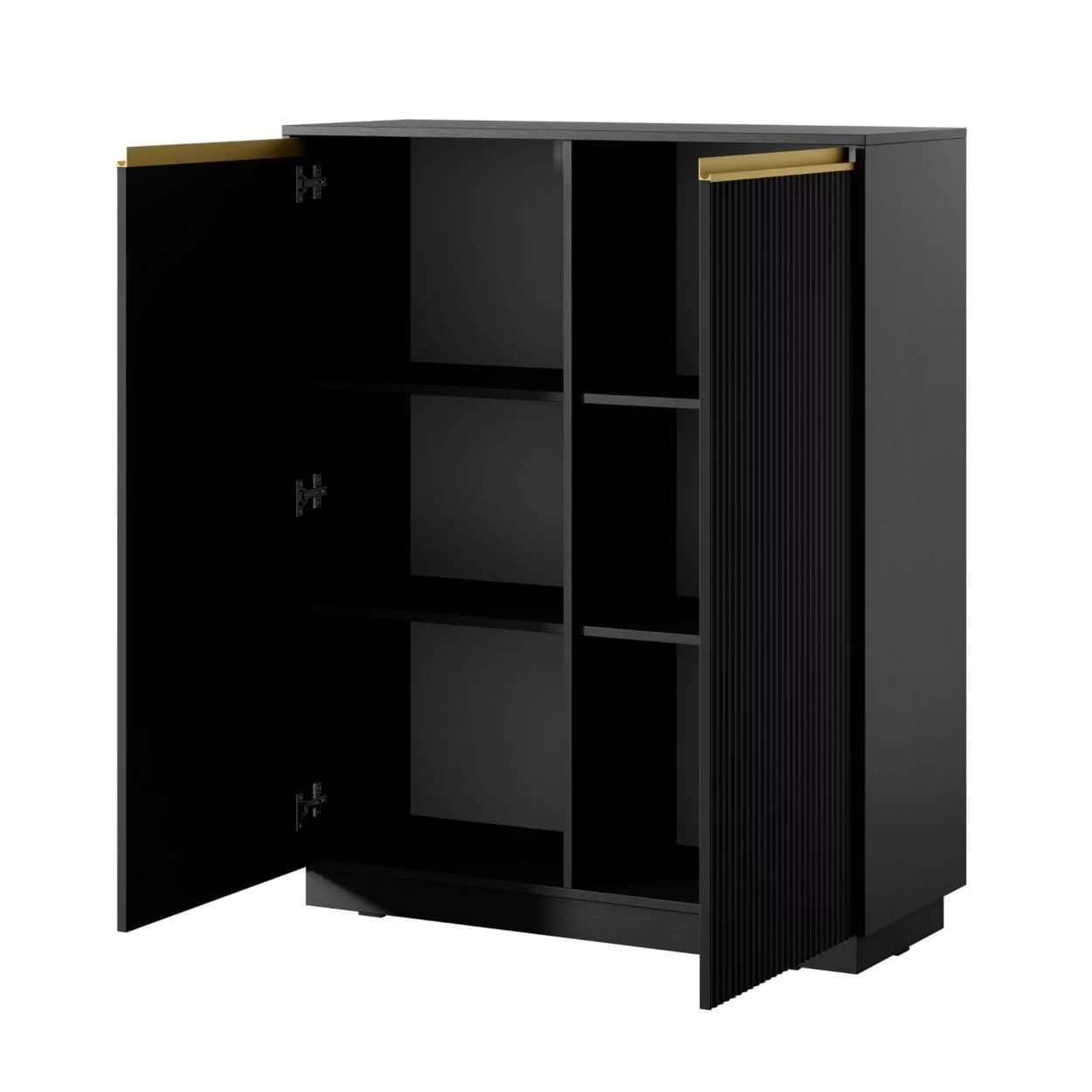Wysoka komoda SHINE w czarnym kolorze to połączenie elegancji i funkcjonalności. Frezowany front i złote uchwyty w formie listwy dodają subtelnego uroku, a stabilny cokół podkreśla solidność. Cztery półki i zawiasy z cichym domykiem zapewniają wygodę, a dwudrzwiowa konstrukcja świetnie sprawdza się w nowoczesnych i klasycznych aranżacjach.