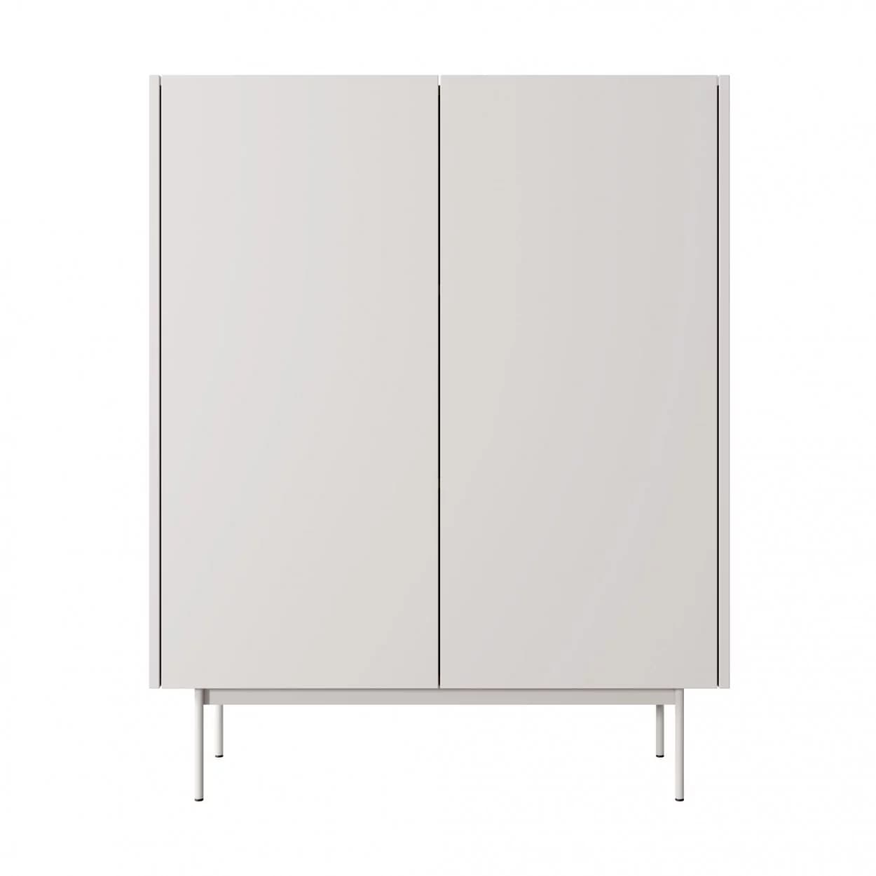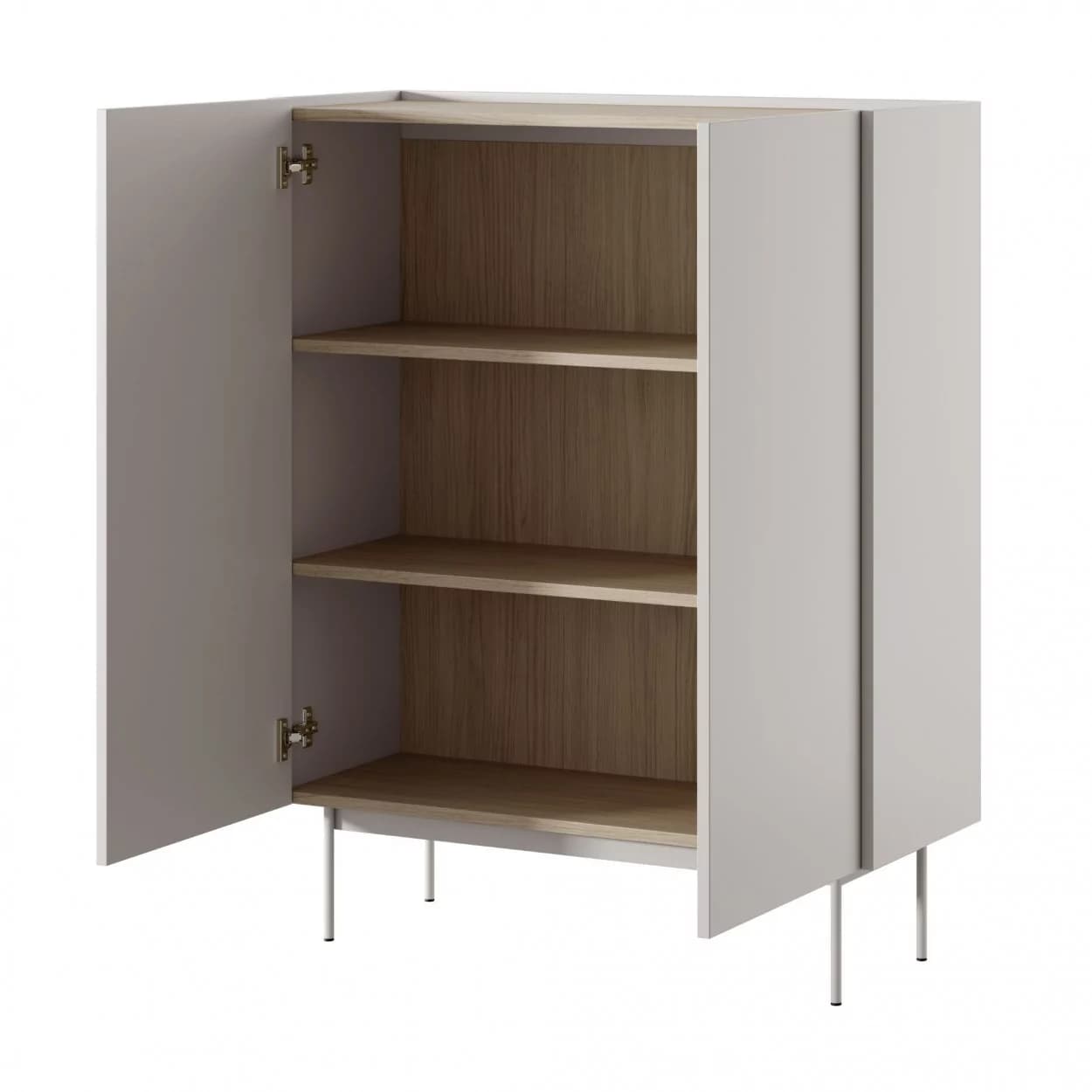 Komoda Lumia dwudrzwiowa w kolorze Kaszmiru z wstawkami Dąb Linea to połączenie nowoczesnego stylu i funkcjonalności, z bezuchwytowym otwieraniem i wpuszczonym blatem.