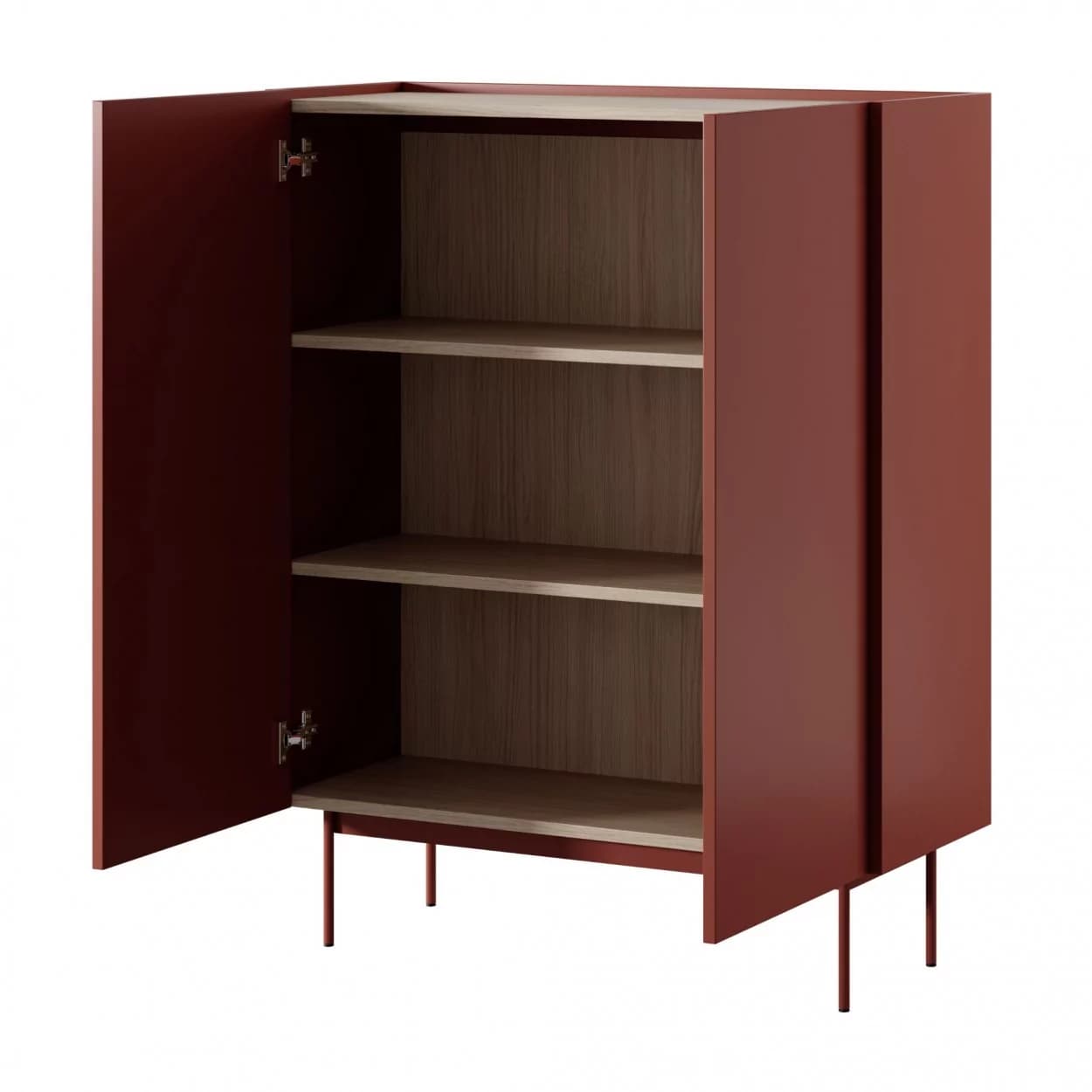 Dwudrzwiowa komoda Lumina to stylowy mebel w kolorze Ceramic Red / Dąb Linea, łączący estetykę z praktycznością. Dzięki bezuchwytowemu systemowi i metalowym nogom dopasowanym do frontu zapewnia minimalistyczny i funkcjonalny wygląd. Świetny wybór do nowoczesnych aranżacji salonu.
