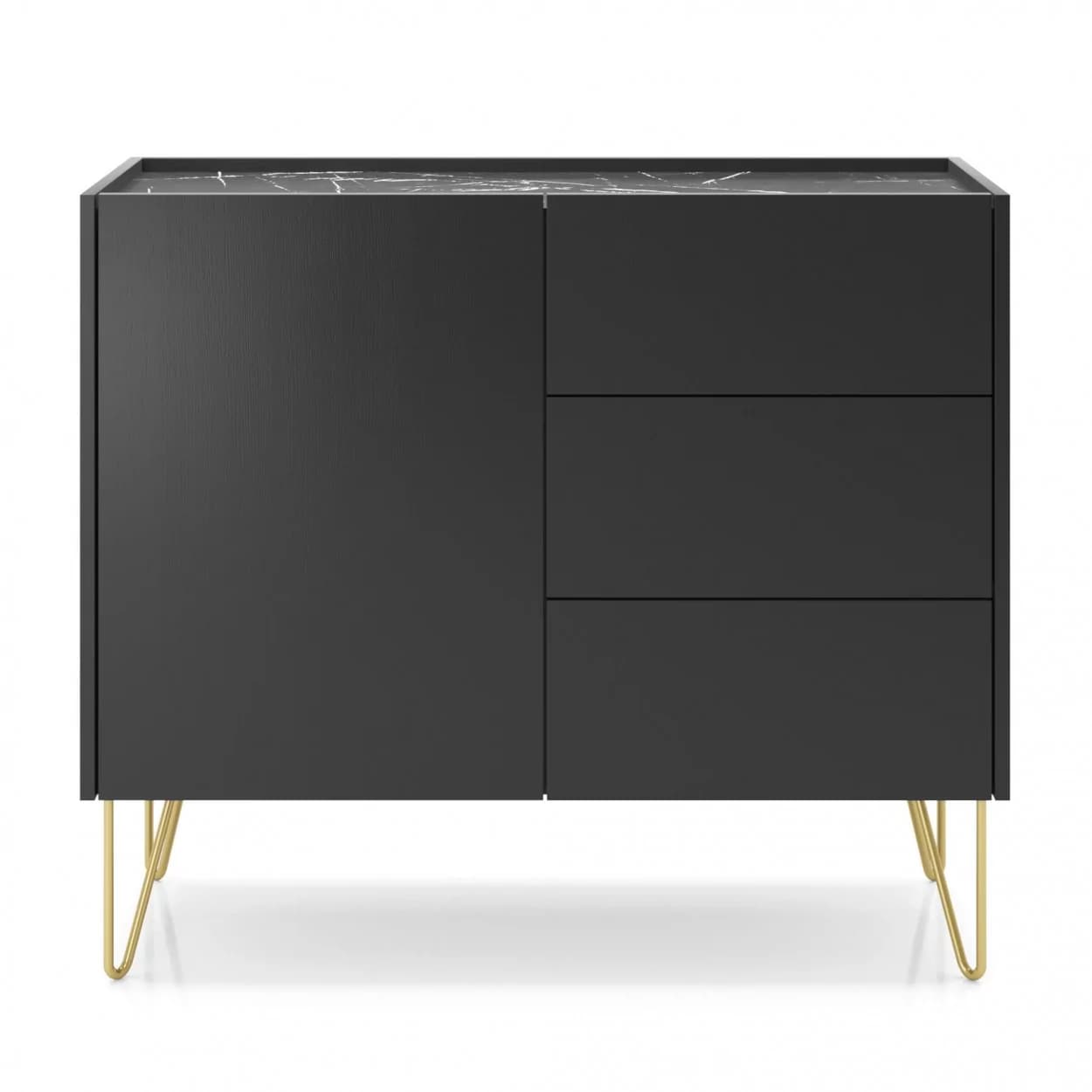 Komoda HILTON to połączenie wyrafinowanego designu i funkcjonalności. Złote gięte nogi, marmurowy blat i system push to open nadają jej elegancki charakter. Idealna do stylowych, nowoczesnych wnętrz.