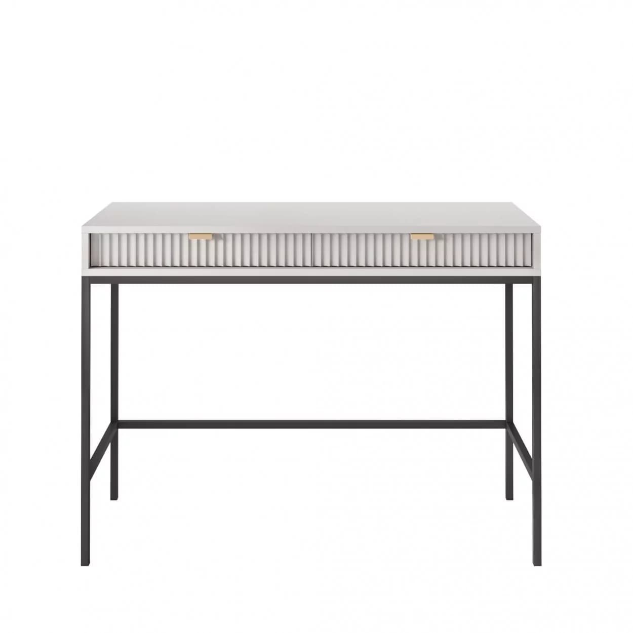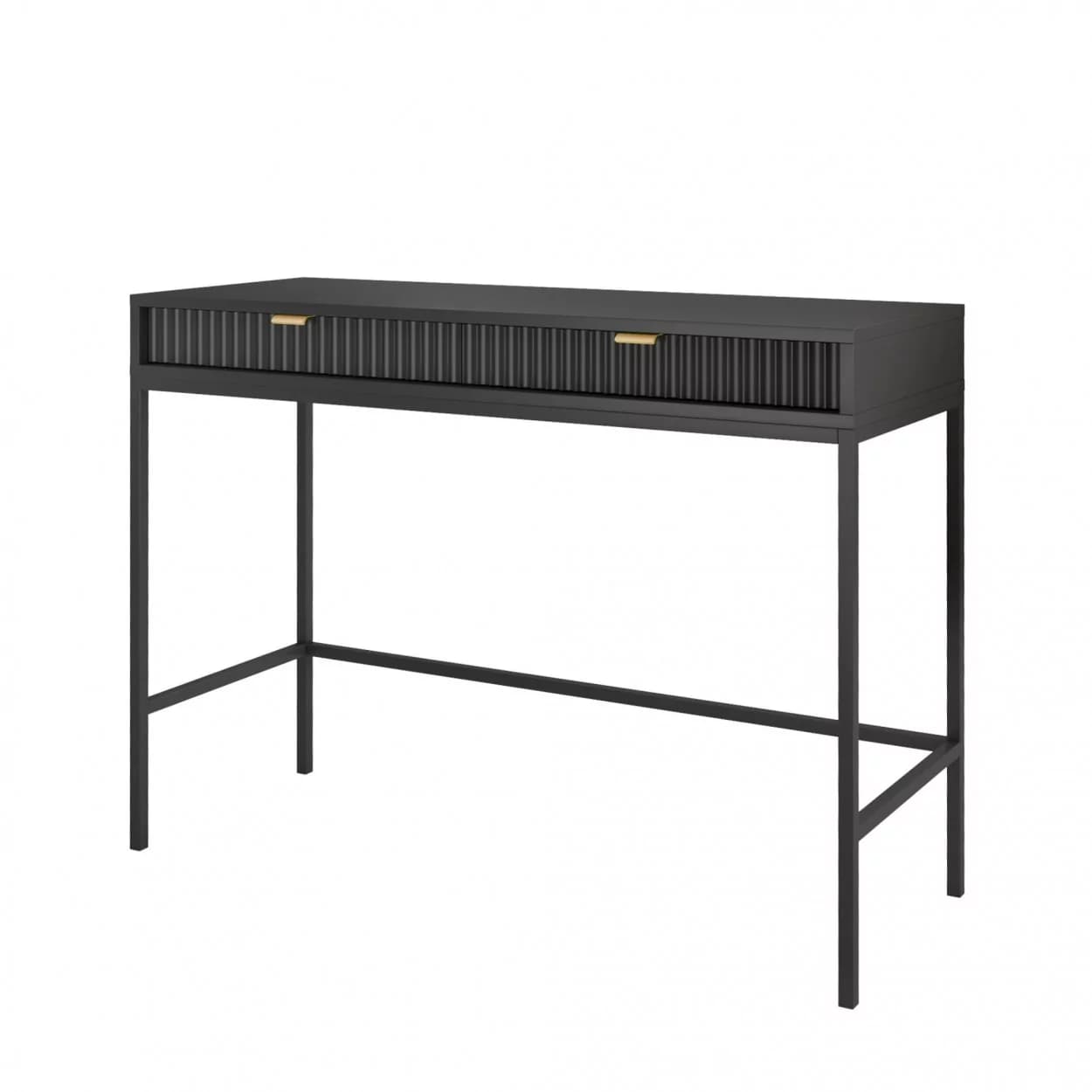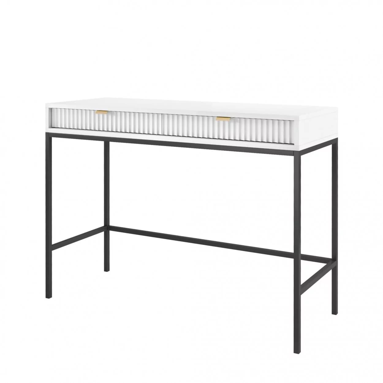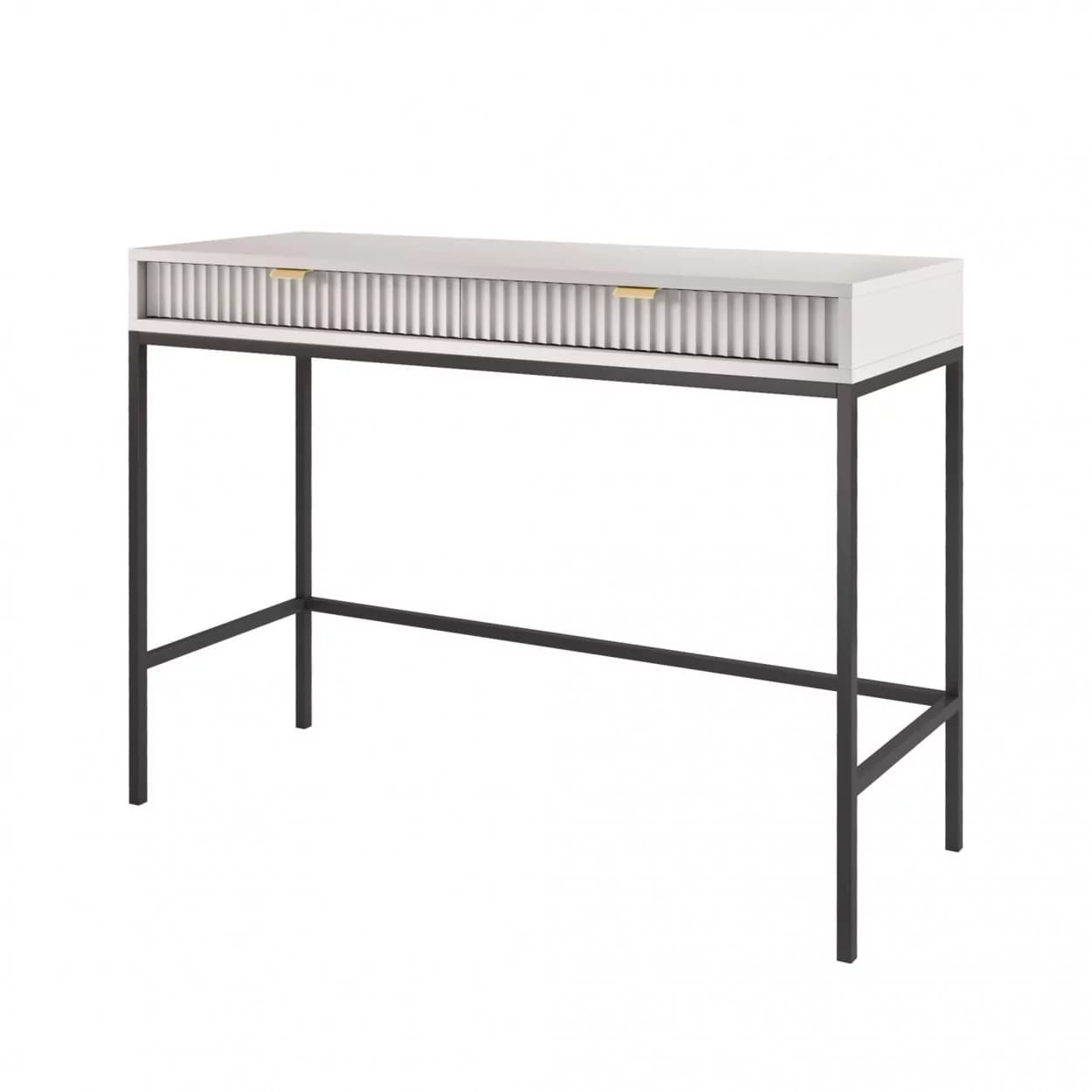 Konsola VESTA dostępna w czterech wariantach kolorystycznych wyróżnia się ryflowanymi frontami i solidnym metalowym stelażem. Wyposażona w dwie pojemne szuflady, łączy elegancję z funkcjonalnością.
