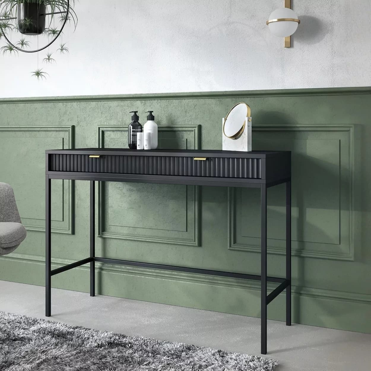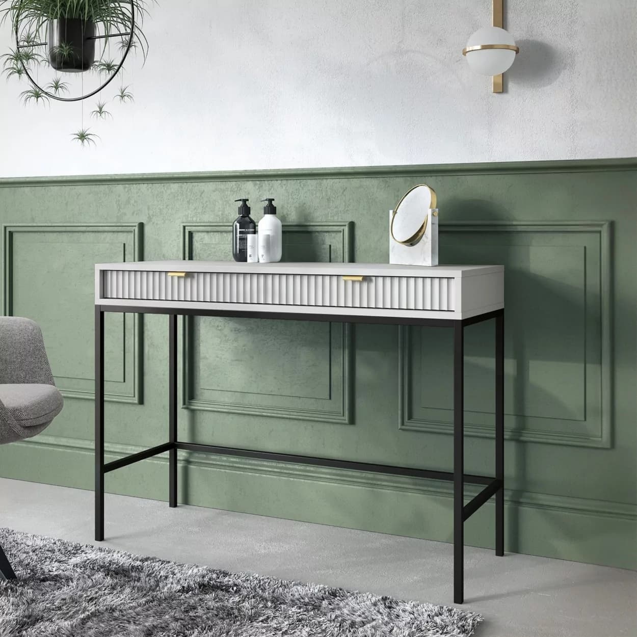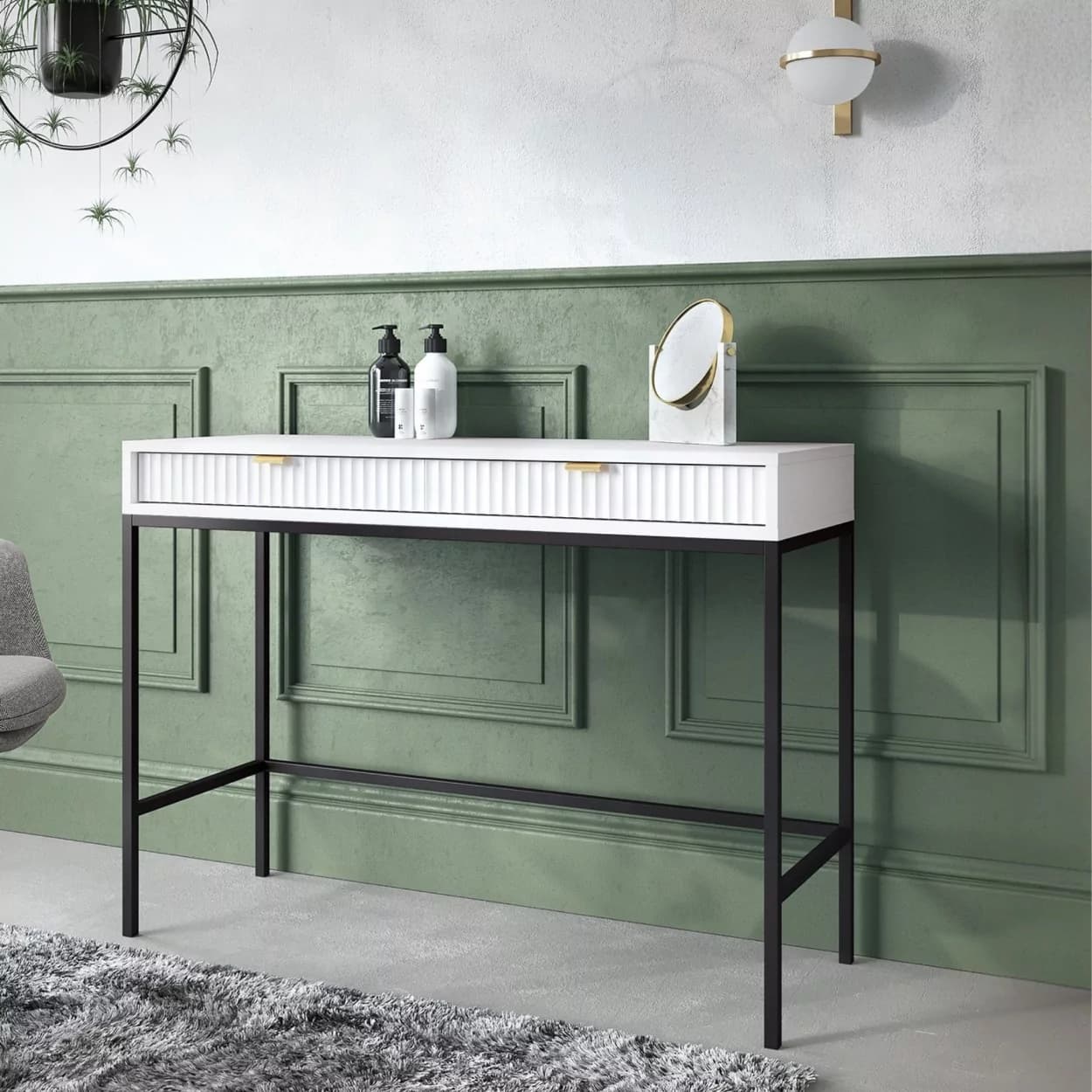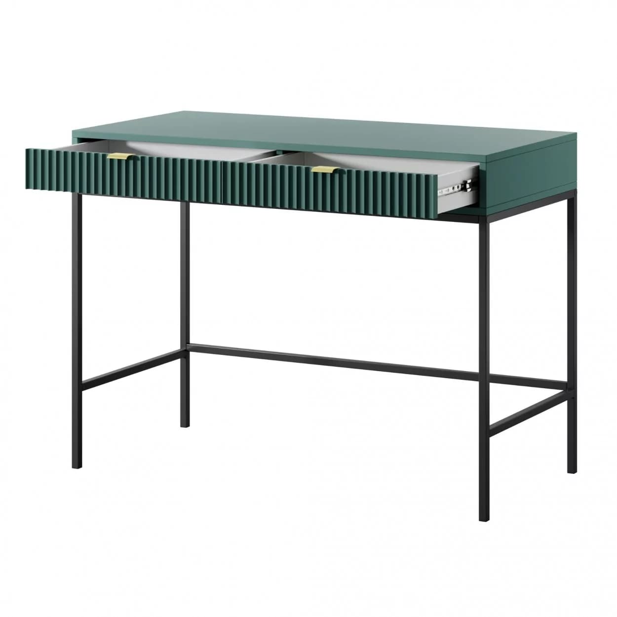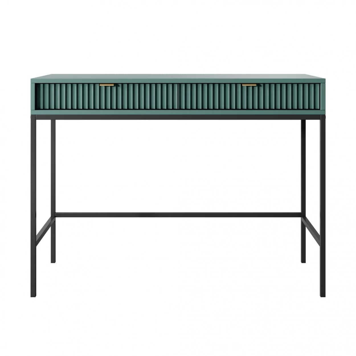 Konsola VESTA dostępna w czterech wariantach kolorystycznych wyróżnia się ryflowanymi frontami i solidnym metalowym stelażem. Wyposażona w dwie pojemne szuflady, łączy elegancję z funkcjonalnością.