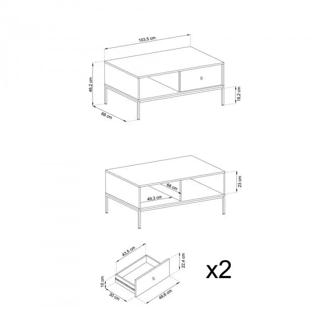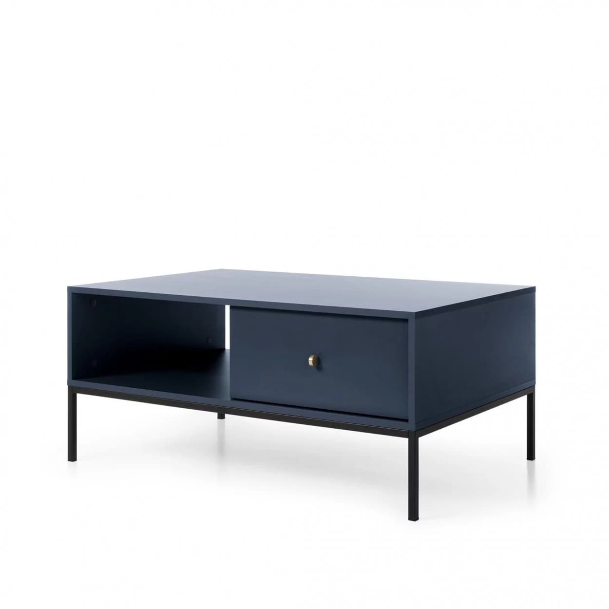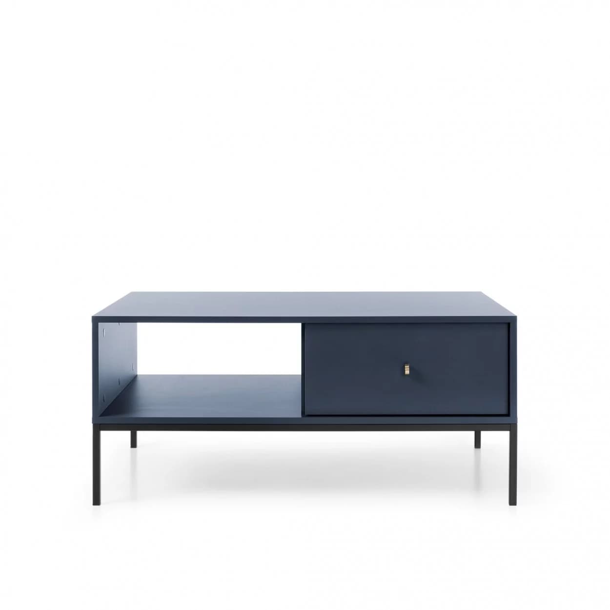 Ława Kawowa AZURE w subtelnym odcieniu granatu, na metalowym stelażu w kolorze czarnym lub złotym. Wyposażona w praktyczną szufladę i złoty uchwyt, łączy funkcjonalność z elegancją.