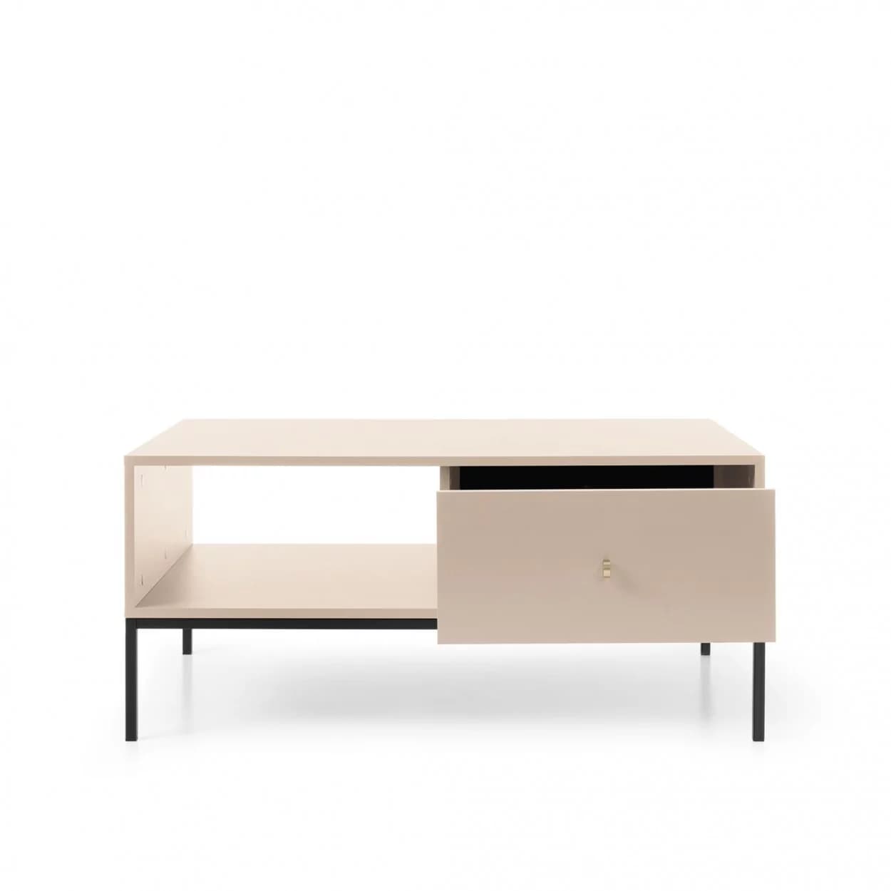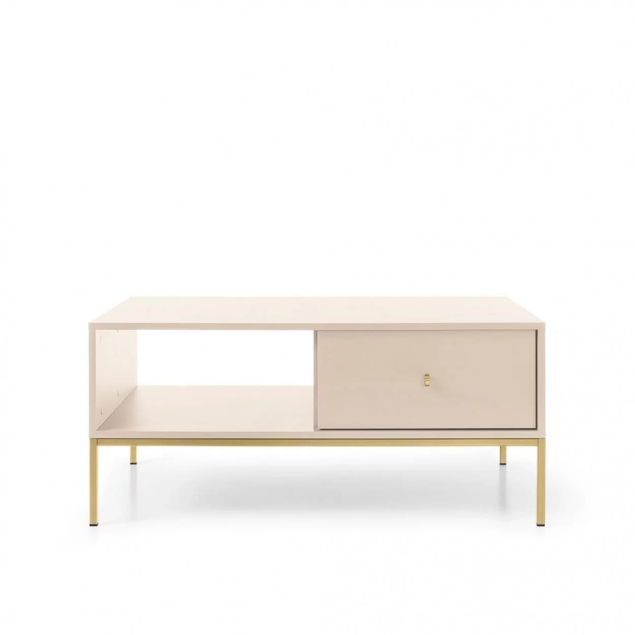 Ława Kawowa TANSY w beżowym kolorze z praktyczną szufladą i metalowym stelażem. Dostępna w dwóch kolorach: czarnym lub złotym, ze złotym uchwytem, który dodaje elegancji.