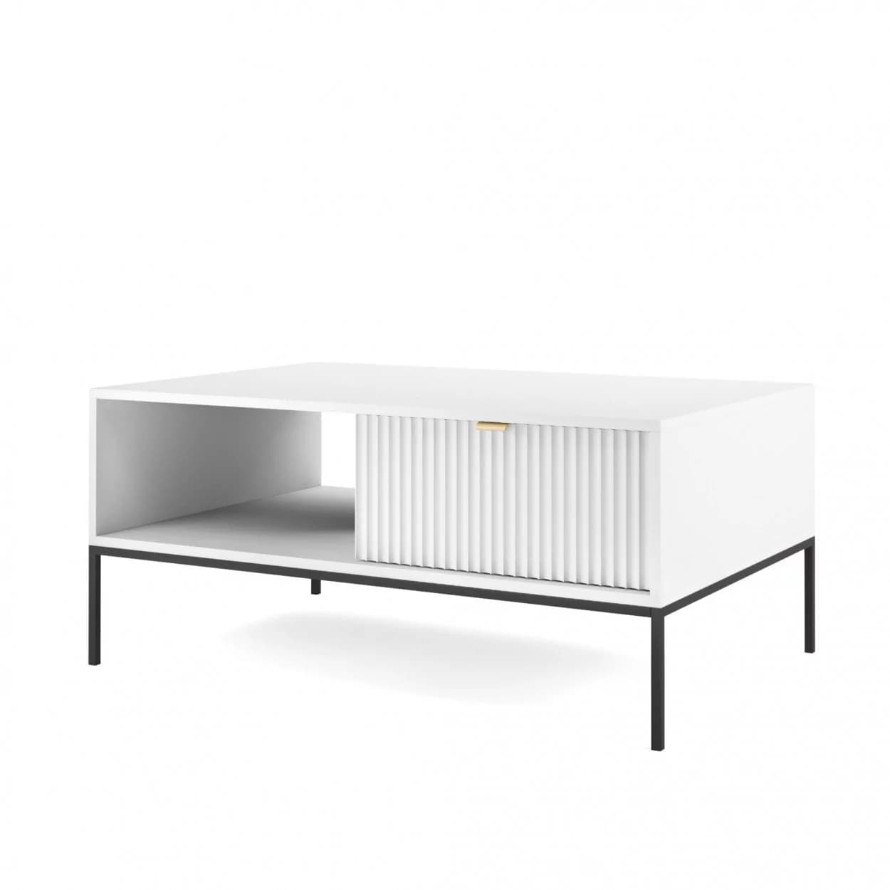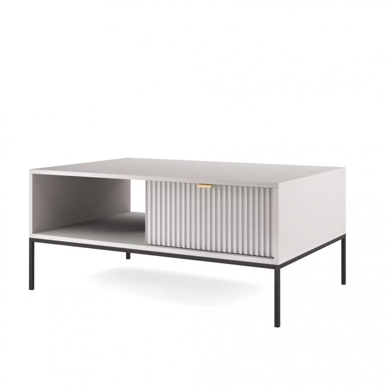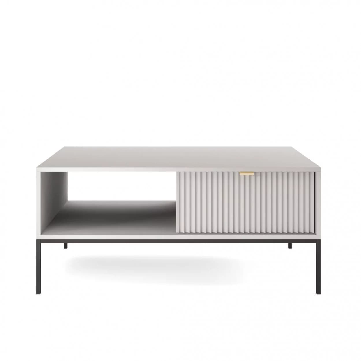 Ława kawowa VESTA dostępna w czterech wariantach kolorystycznych wyróżnia się efektownymi, ryflowanymi frontami oraz solidnym metalowym stelażem. Posiada praktyczną szufladę na drobiazgi, łącząc styl z funkcjonalnością.