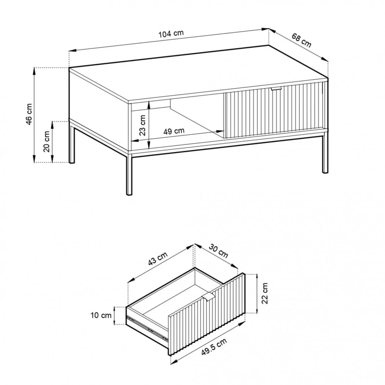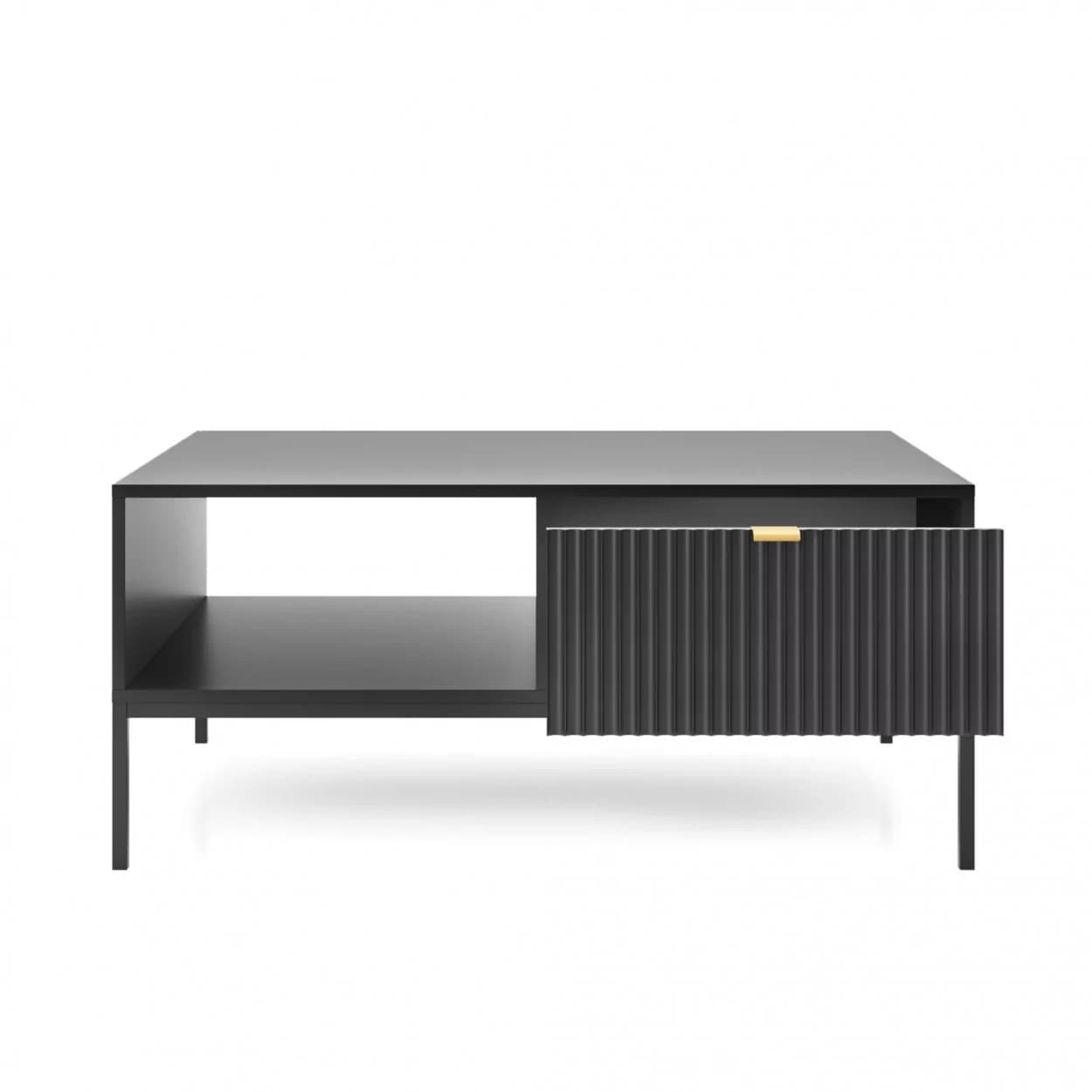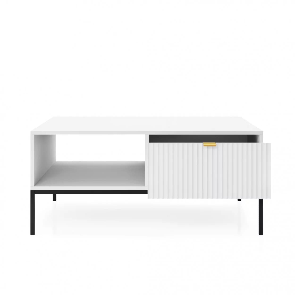 Ława kawowa VESTA dostępna w czterech wariantach kolorystycznych wyróżnia się efektownymi, ryflowanymi frontami oraz solidnym metalowym stelażem. Posiada praktyczną szufladę na drobiazgi, łącząc styl z funkcjonalnością.