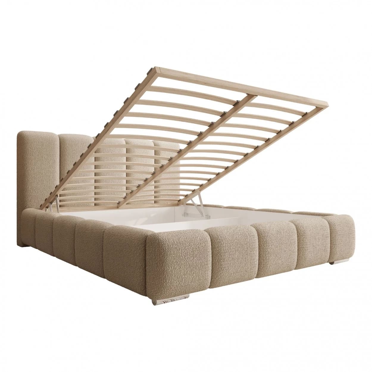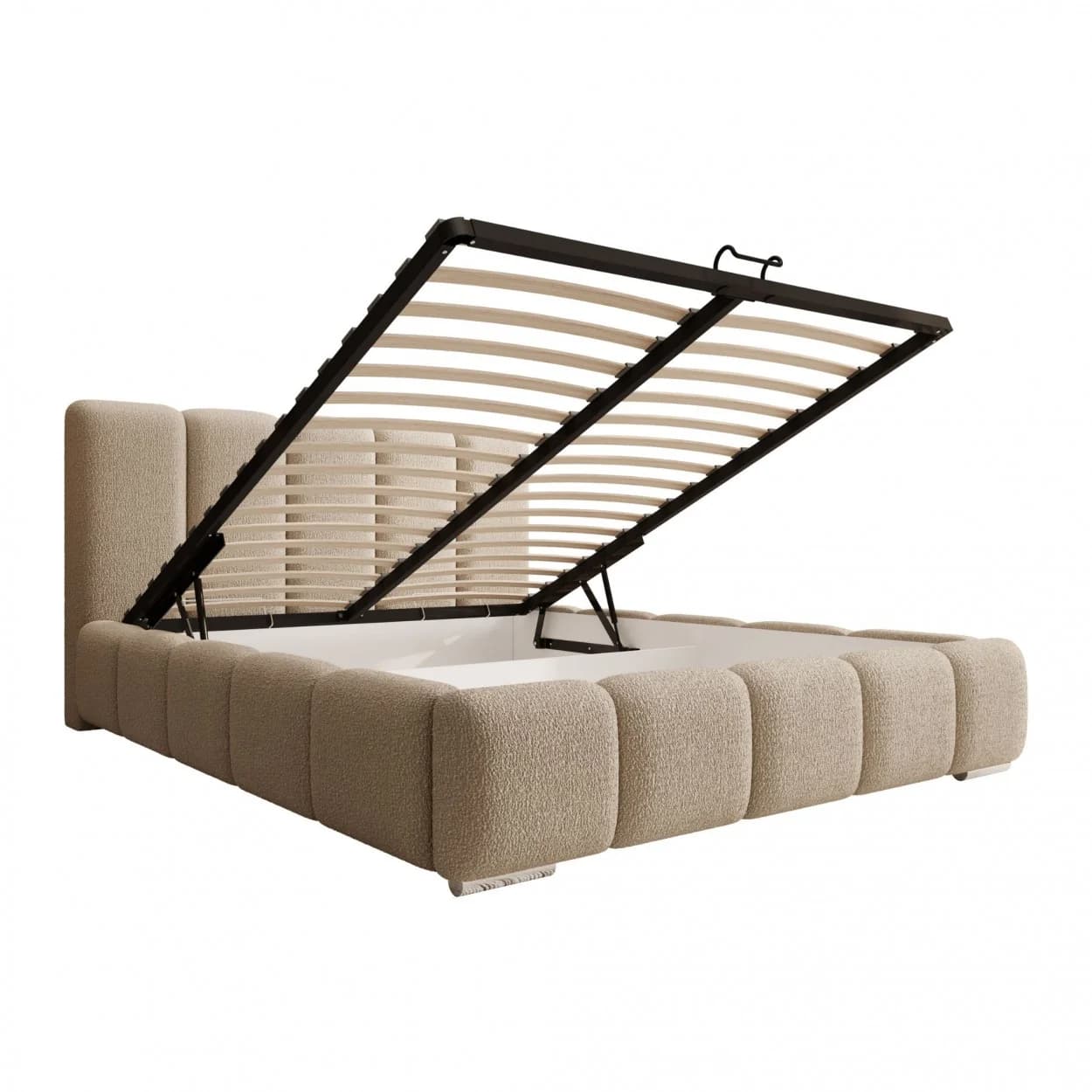 Styl glamour, tapicerka Boucle, chromowane nóżki, pojemnik na pościel z mechanizmem sprężynowym, wysoki zagłówek, komfort i funkcjonalność.