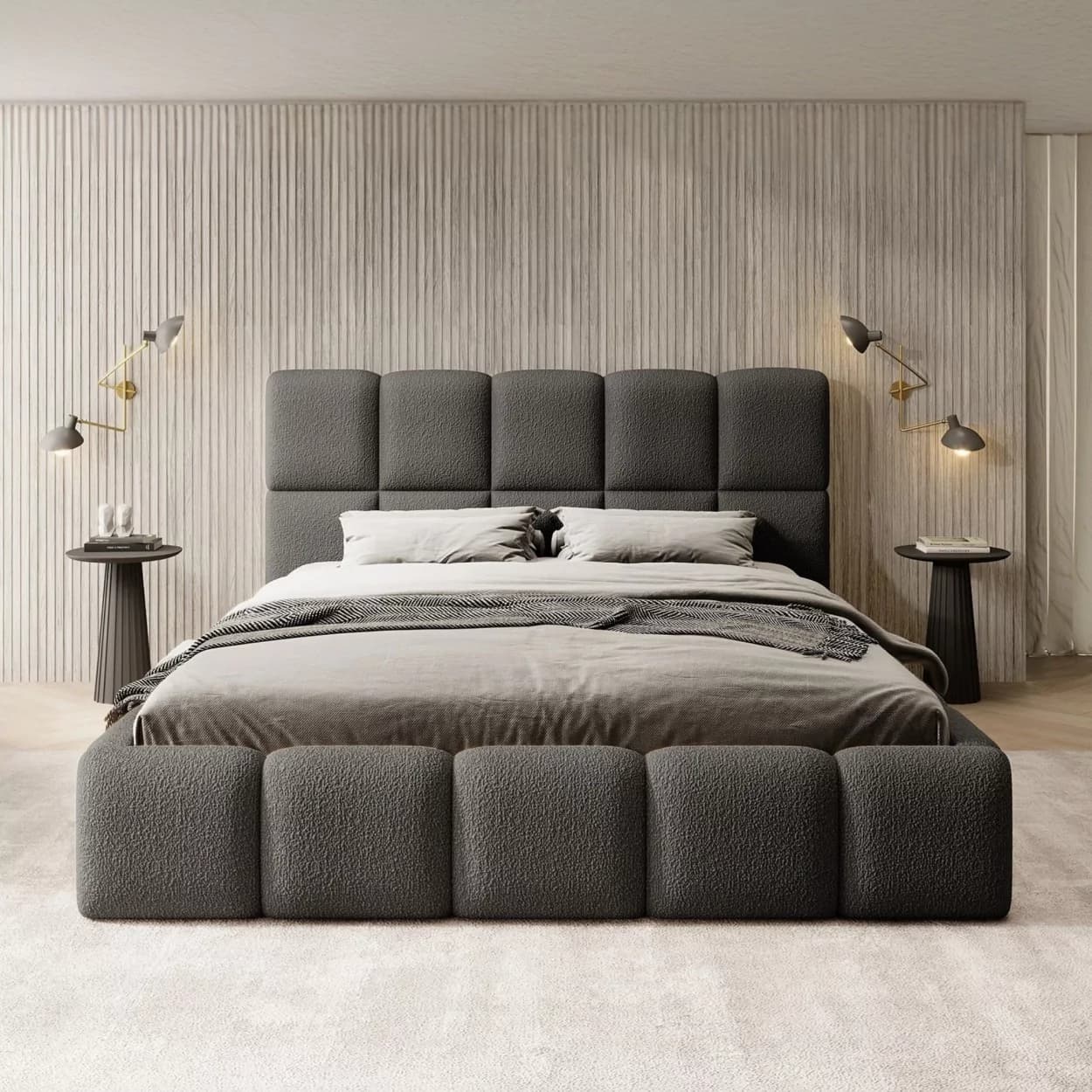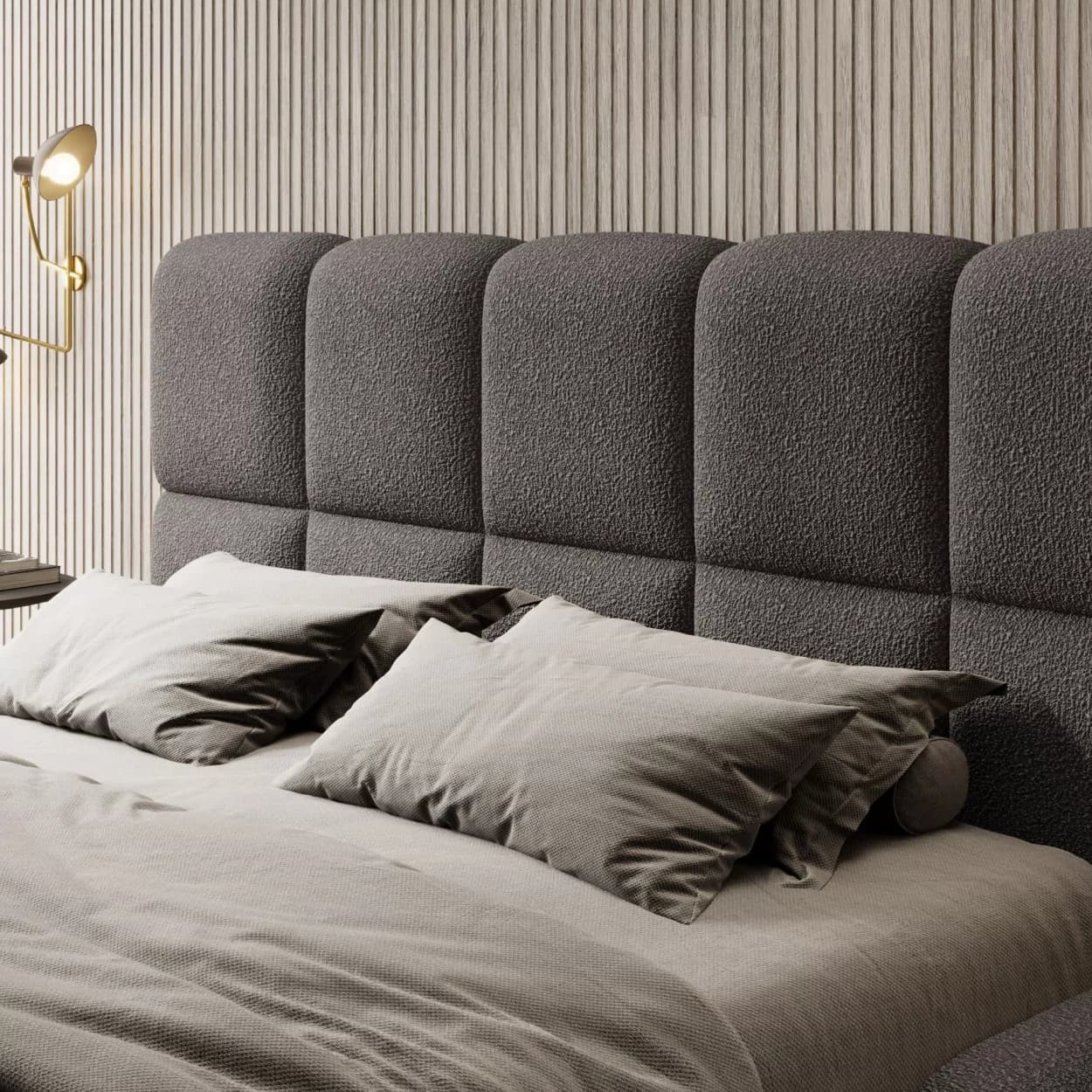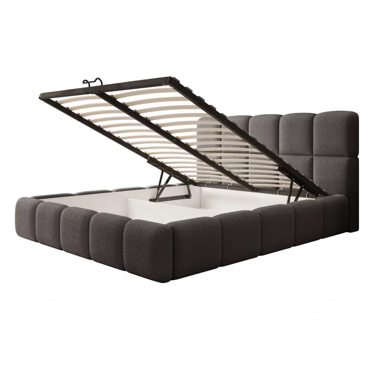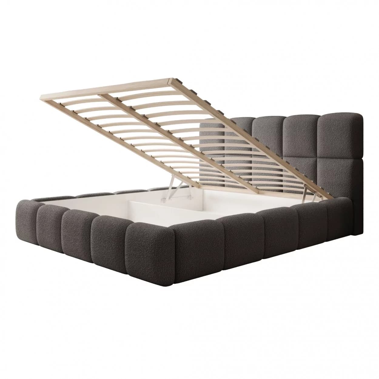 Nowoczesna elegancja, tkanina Boucle, wygodne zagłowie, praktyczny pojemnik, stelaż do wyboru, uniwersalny design, komfort i funkcjonalność.