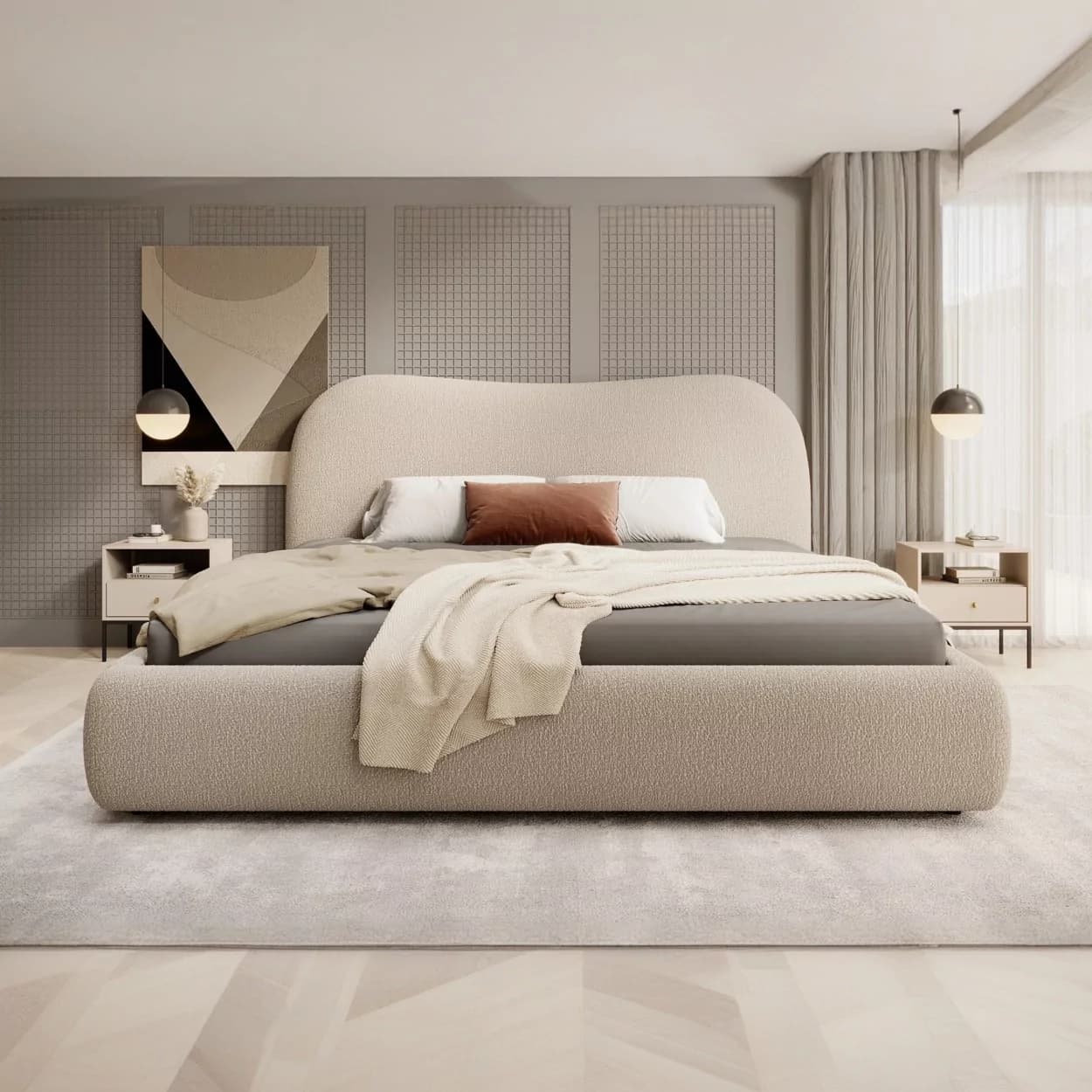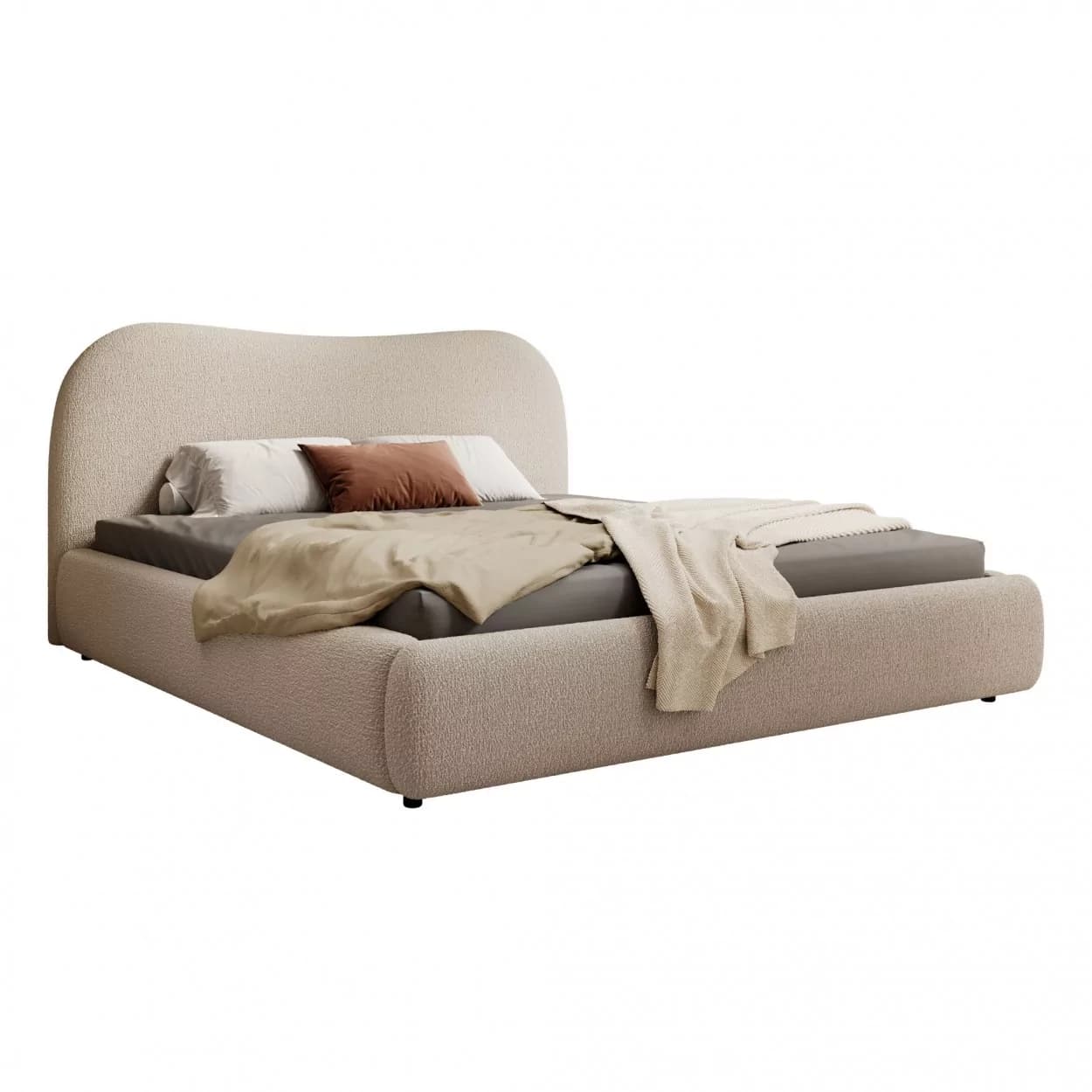 Łóżko SELVIO to połączenie wysokiej estetyki i praktycznych rozwiązań. Jego największym atutem jest subtelnie zaokrąglony, tapicerowany zagłówek, który zapewnia komfort podczas wypoczynku i stanowi dekoracyjny element sypialni. Solidna konstrukcja i charakterystyczna tkanina boucle nadają meblowi wyrazistego stylu i przytulności.