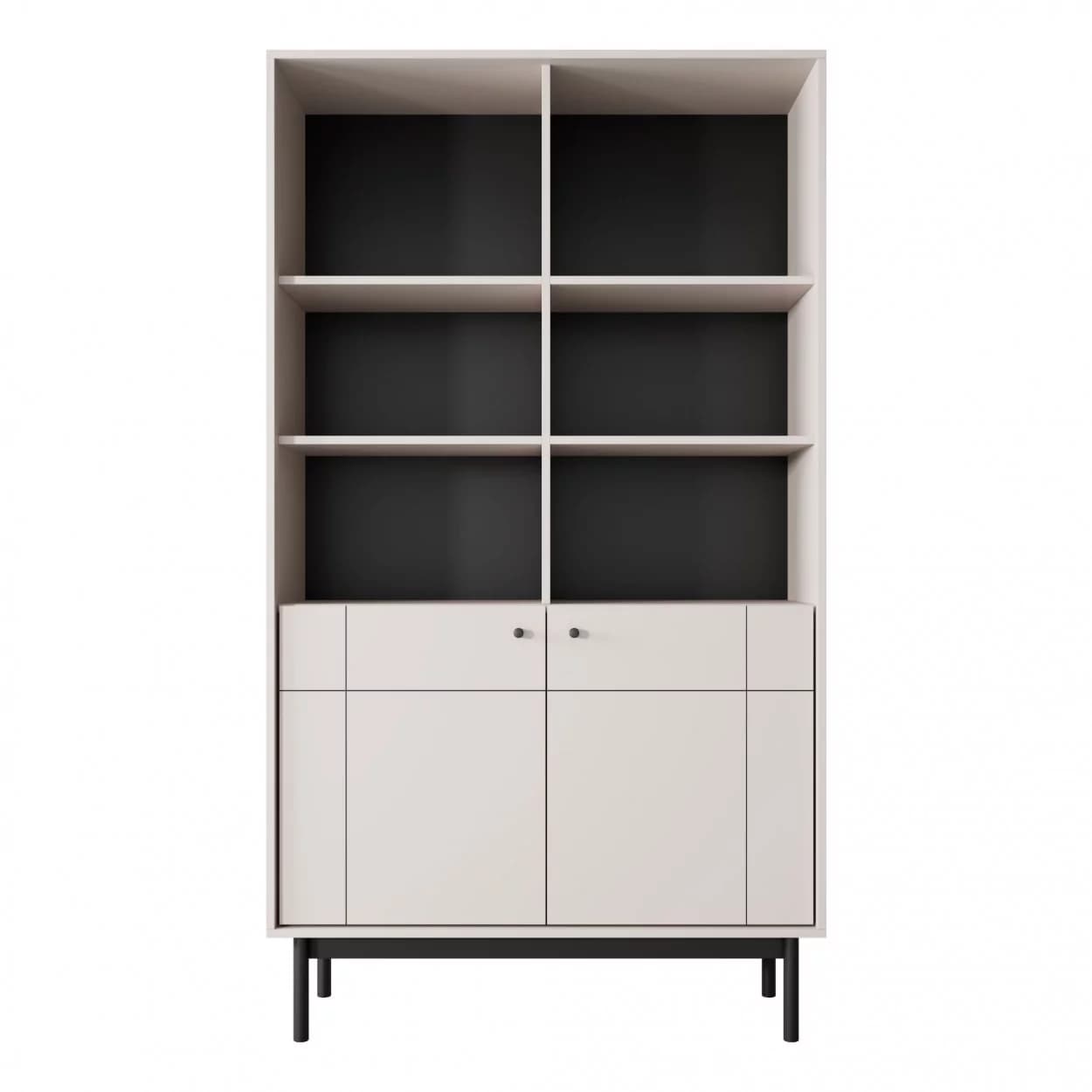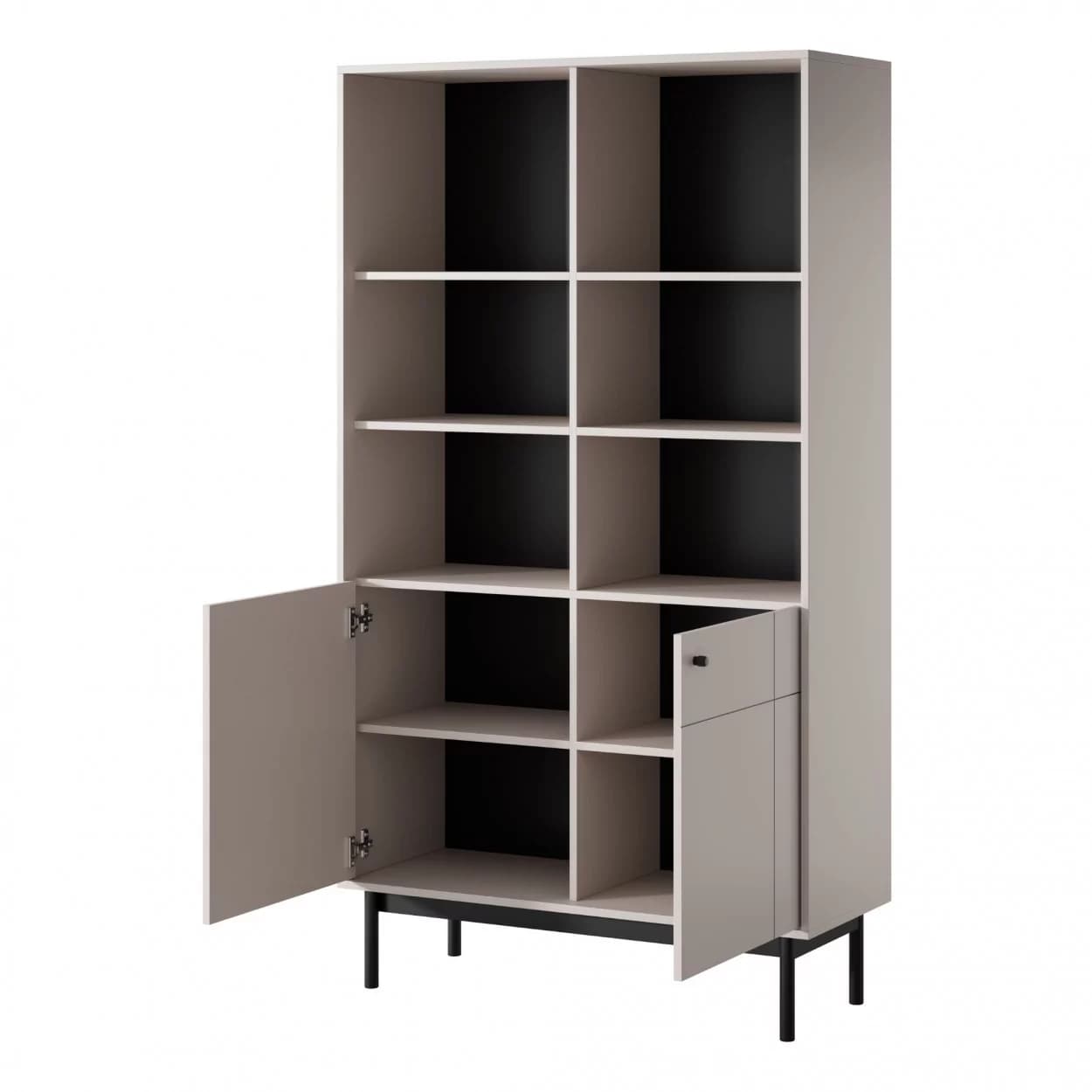 Regał SCALA w kolorze kaszmiru z 8 półkami, czarnymi metalowymi uchwytami i drewnianym stelażem. Funkcjonalny i stylowy – idealny do przechowywania książek i dekoracji.