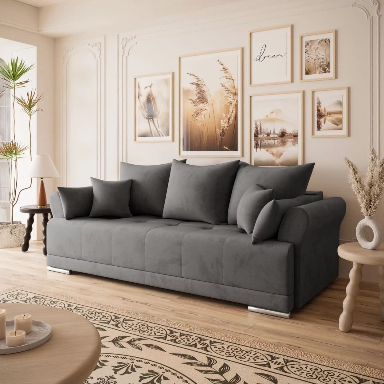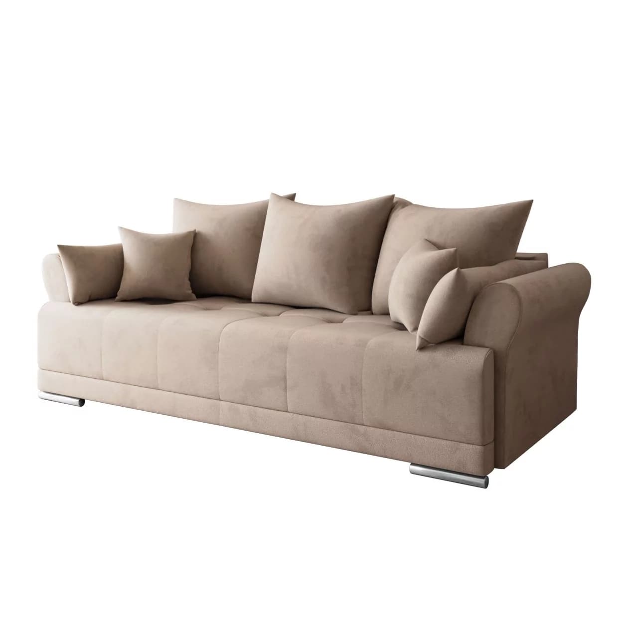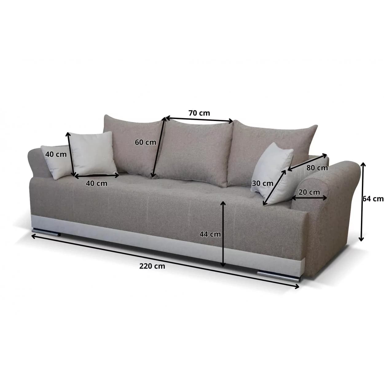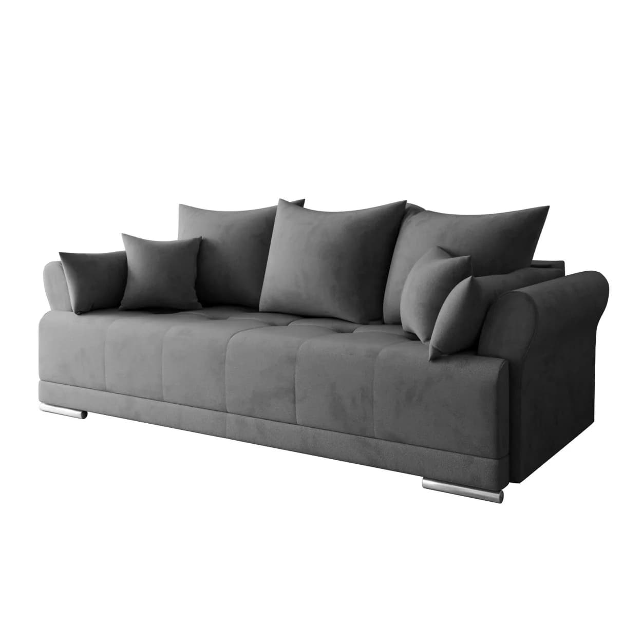 Sofa GRAND to propozycja dla tych, którzy szukają eleganckiego i wygodnego mebla. Wykonana z wysokiej jakości materiałów, oferuje klasyczny design i praktyczne rozwiązania. Jej wszechstronność sprawia, że doskonale wpisuje się w różne wnętrza. Komfort użytkowania, możliwość spania oraz funkcjonalny schowek na pościel to cechy, które wyróżniają ten mebel. Oparcie wypełnione pianką oraz siedzisko z kombinacji sprężyn bonellowych i pianki dostarczają przyjemnego doświadczenia. Chromowane nóżki dodają delikatnego wykończenia, a solidna konstrukcja z drewniana zapewnia trwałość. To sofa, która jest estetyczna oraz funkcjonalna równocześnie, pozostawiając swobodę w personalizacji wnętrza.