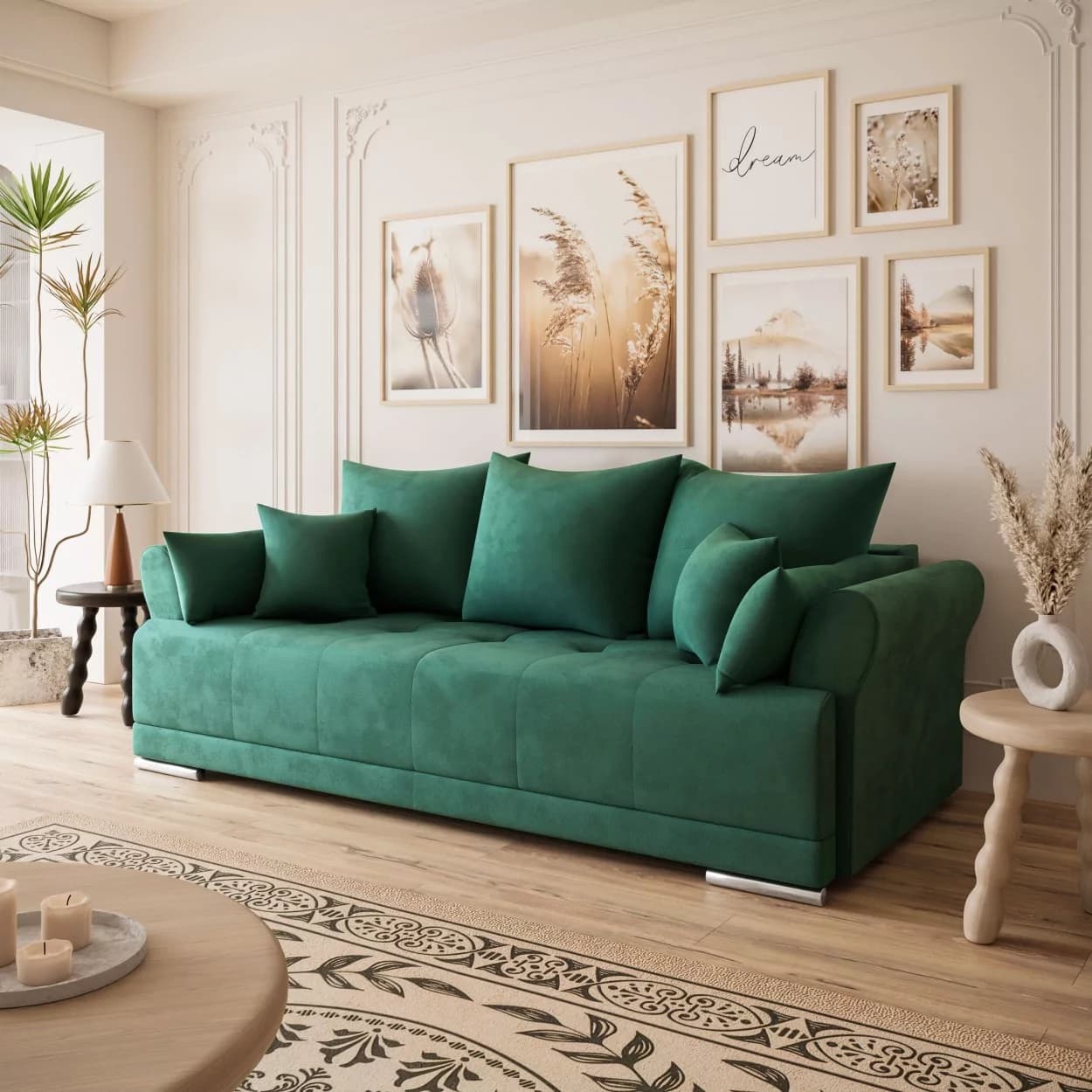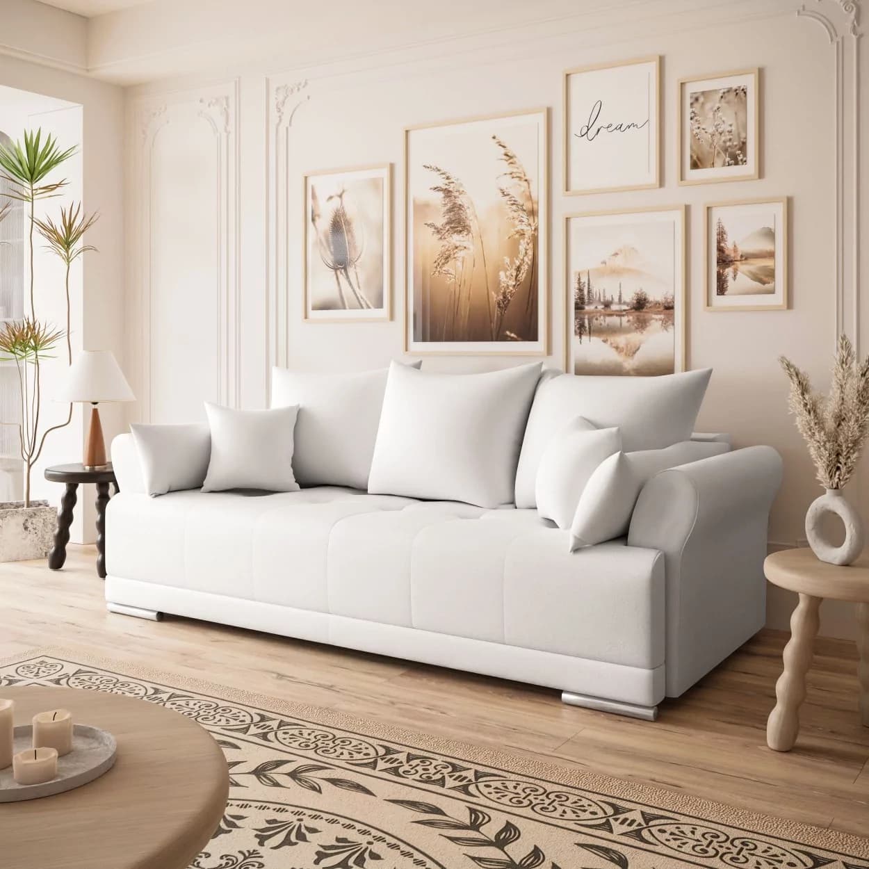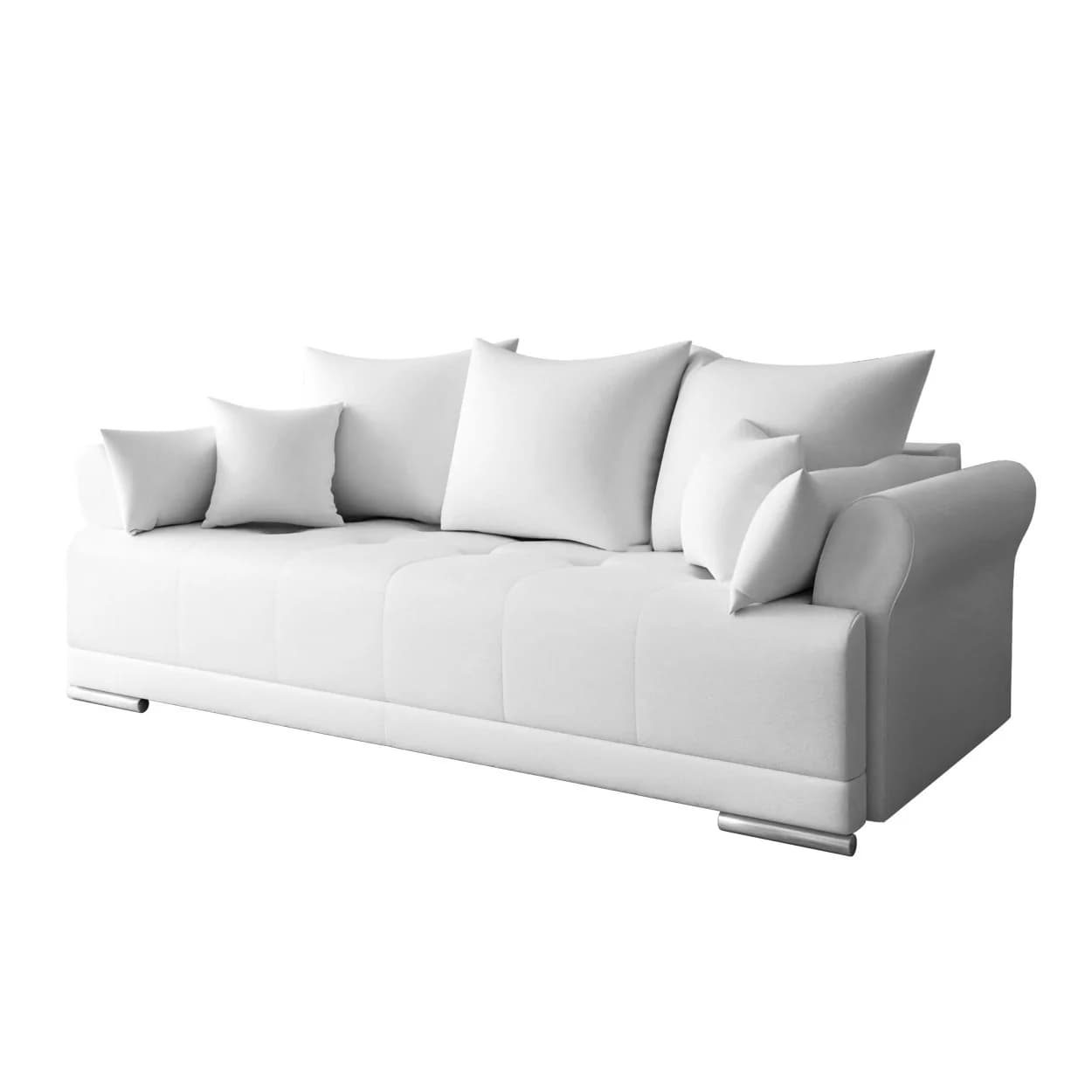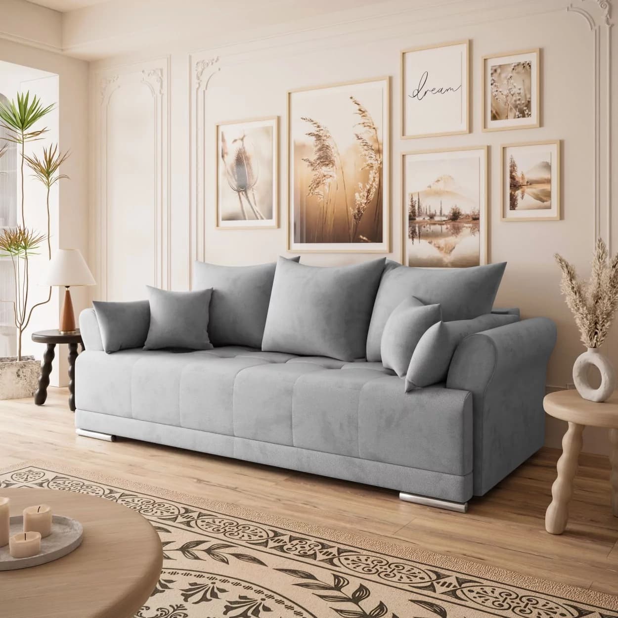Sofa GRAND to propozycja dla tych, którzy szukają eleganckiego i wygodnego mebla. Wykonana z wysokiej jakości materiałów, oferuje klasyczny design i praktyczne rozwiązania. Jej wszechstronność sprawia, że doskonale wpisuje się w różne wnętrza. Komfort użytkowania, możliwość spania oraz funkcjonalny schowek na pościel to cechy, które wyróżniają ten mebel. Oparcie wypełnione pianką oraz siedzisko z kombinacji sprężyn bonellowych i pianki dostarczają przyjemnego doświadczenia. Chromowane nóżki dodają delikatnego wykończenia, a solidna konstrukcja z drewniana zapewnia trwałość. To sofa, która jest estetyczna oraz funkcjonalna równocześnie, pozostawiając swobodę w personalizacji wnętrza.