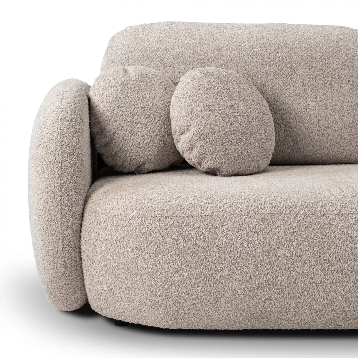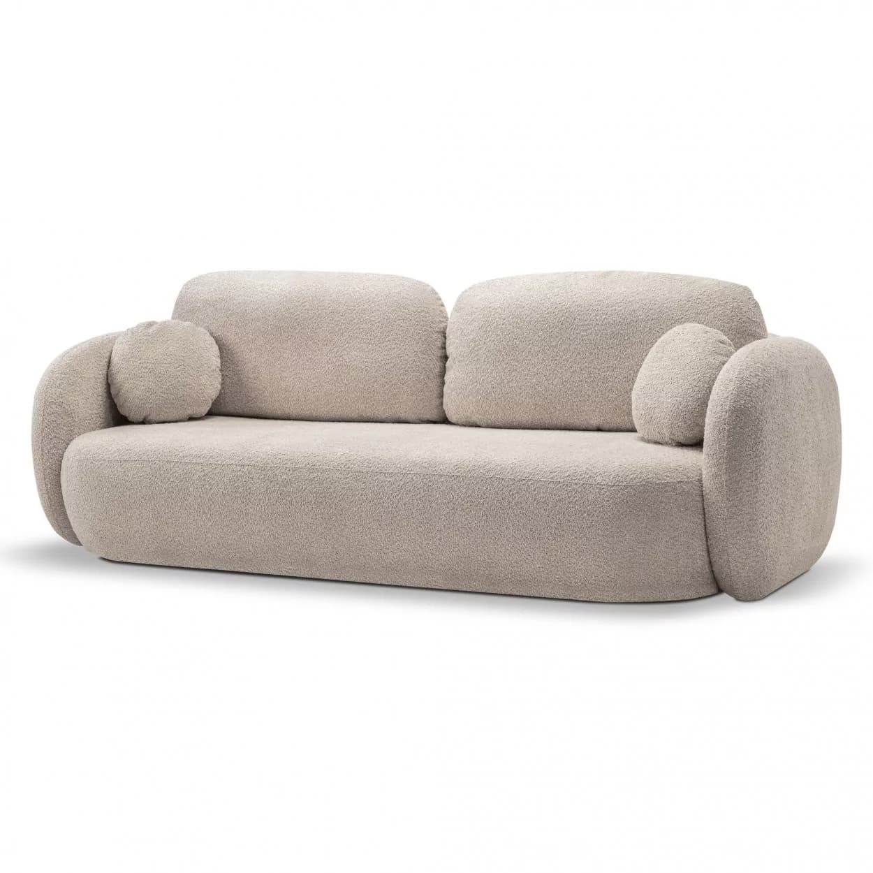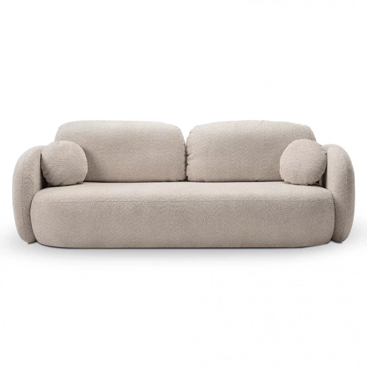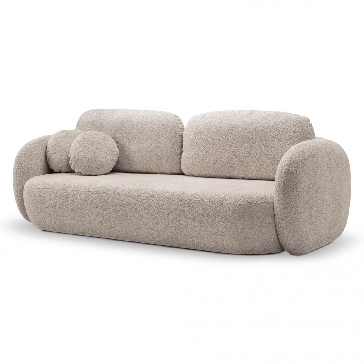 Kanapa VELO to stylowy mebel z tkaniny boucle ABRIAMO, wyposażony w funkcję spania i pojemnik na pościel. Jej obła forma i nowoczesny design sprawiają, że idealnie sprawdzi się w każdym wnętrzu, łącząc wygodę z elegancją.