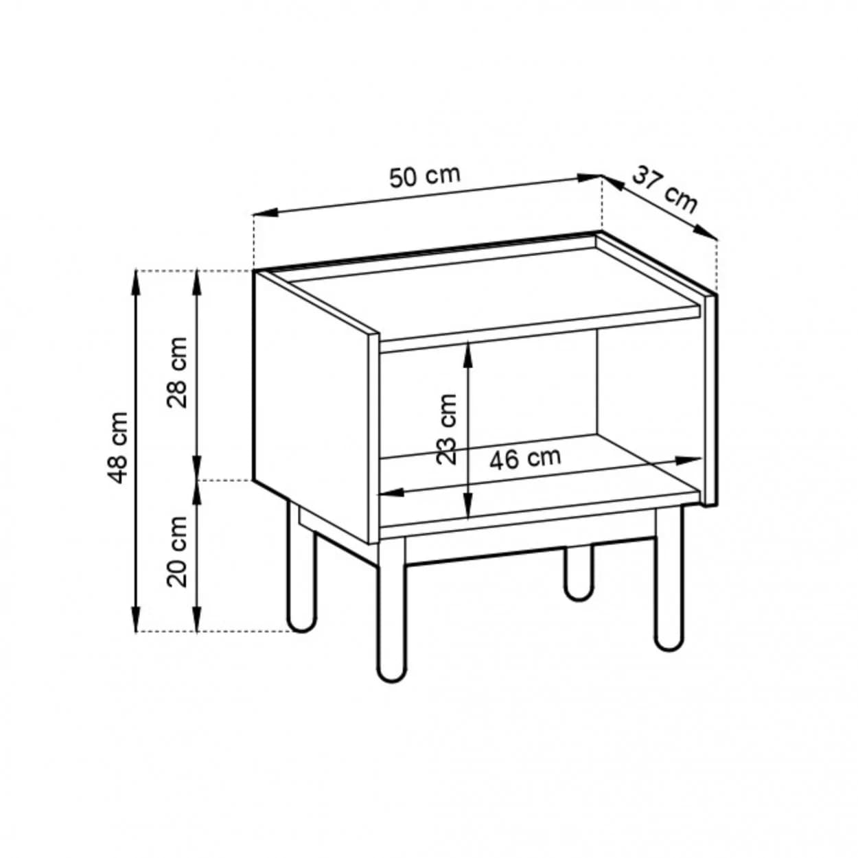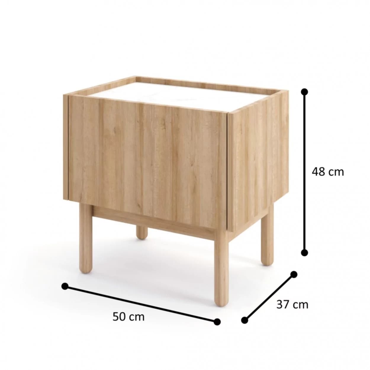 Stolik nocny FRISK w kolorze Dąb Riviera / Marmur Bianco z bezuchwytowym otwieraniem i wpuszczonym blatem to minimalistyczny, stylowy dodatek do sypialni.