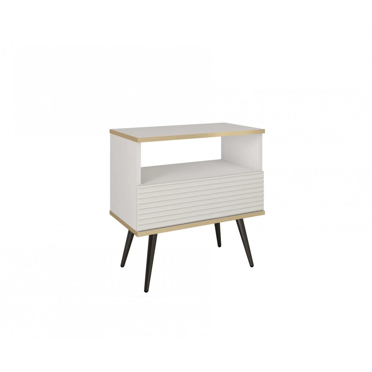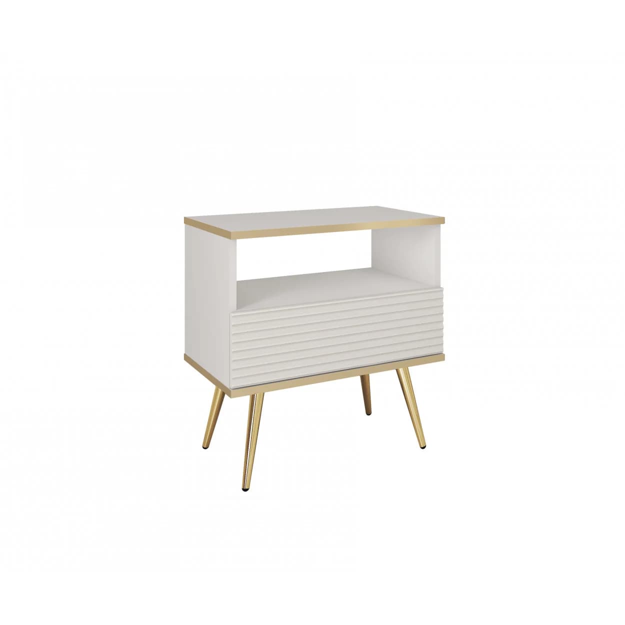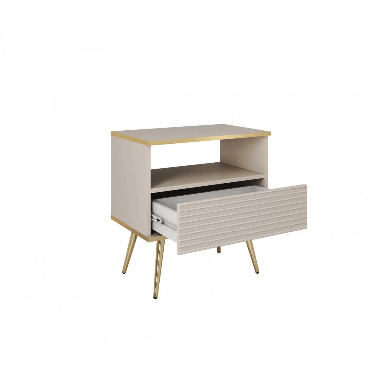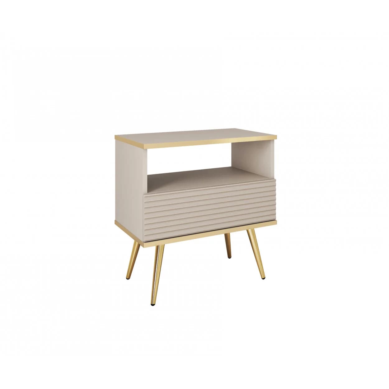 Stolik nocny Mavi łączy elegancję z funkcjonalnością. Ryflowany front, złote akcenty i bezuchwytowy system otwierania tworzą nowoczesny, spójny z kolekcją design.