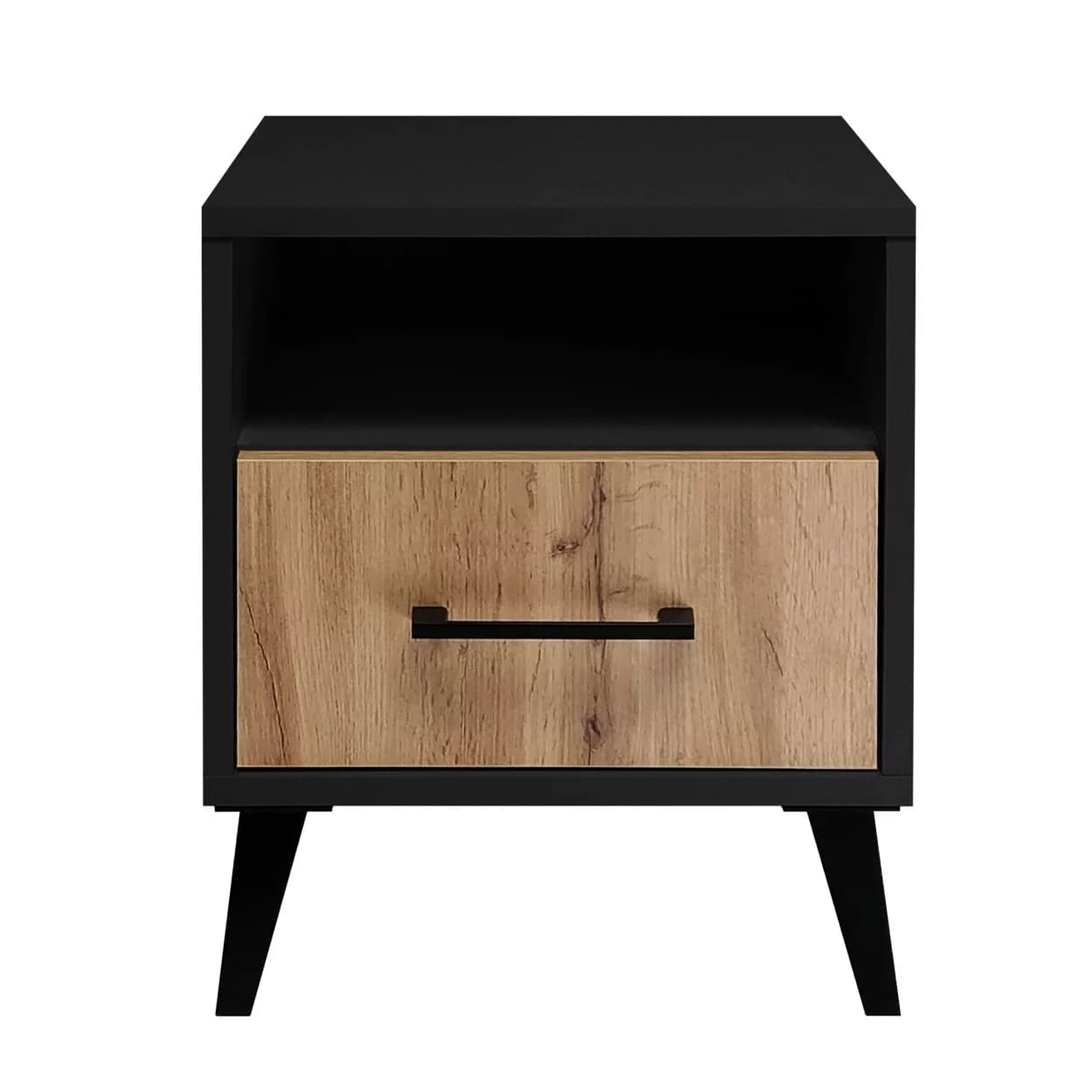 Stolik nocny MODIV VI w kolorze Czarny Mat z frontem dąb wotan to elegancki i funkcjonalny mebel z pojemną szufladą, półką oraz automatycznym oświetleniem LED. Idealny do nowoczesnej sypialni.