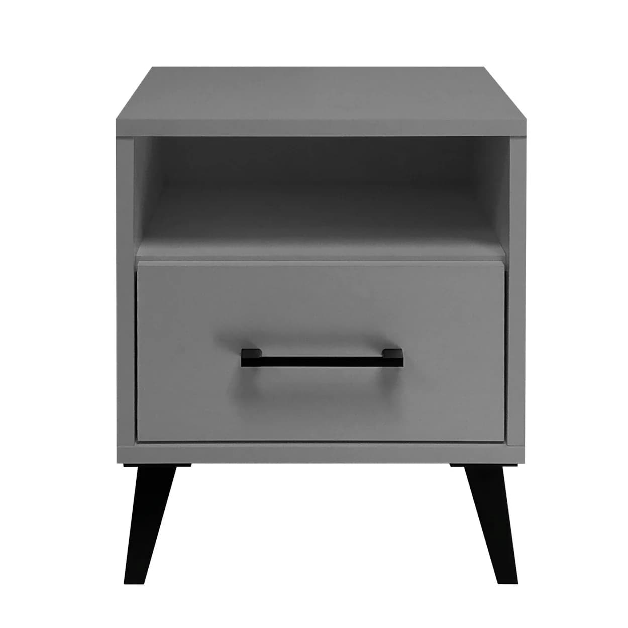 Stolik nocny MODIV VII w kolorze antracytowym to praktyczny i stylowy mebel z pojemną szufladą, półką oraz automatycznym oświetleniem LED. Idealny do nowoczesnych sypialni.