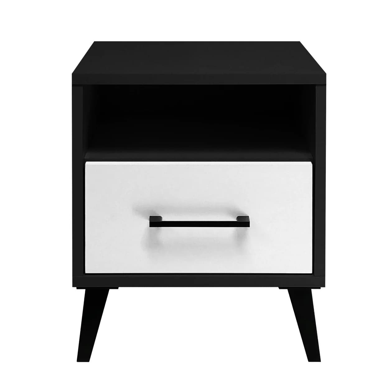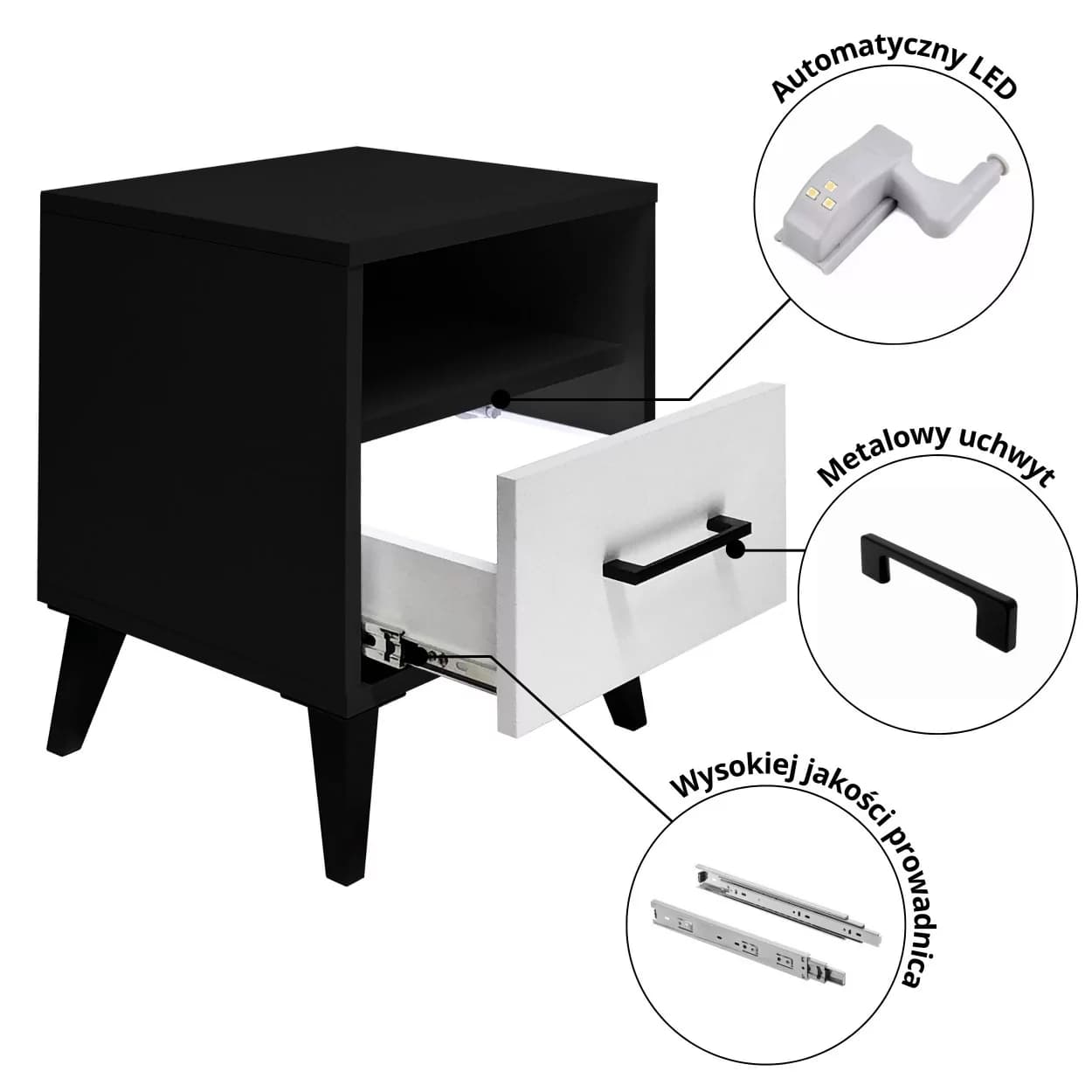Stolik nocny MODIV X to nowoczesny i funkcjonalny mebel w stylowym połączeniu czerni i bieli. Pojemna szuflada, półka i automatyczne oświetlenie LED zapewniają komfort i praktyczność w sypialni.
