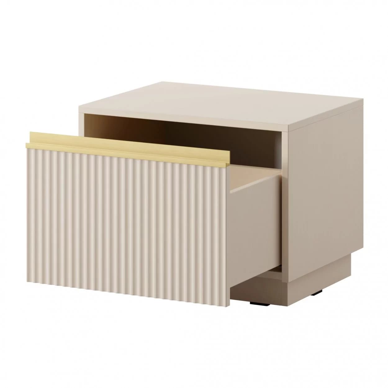 Stolik nocny SHINE w kolorze beż piaskowy zachwyca frezowanym frontem i złotym uchwytem listwowym. Na cokole z pojemną, cichą szufladą — praktyczny i elegancki dodatek do sypialni.