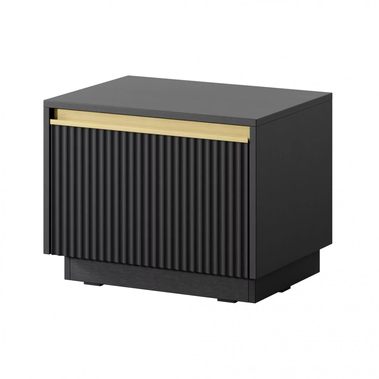 Stolik nocny SHINE w klasycznej czerni z frezowanym frontem i złotym, aluminiowym uchwytem. Elegancki i funkcjonalny.