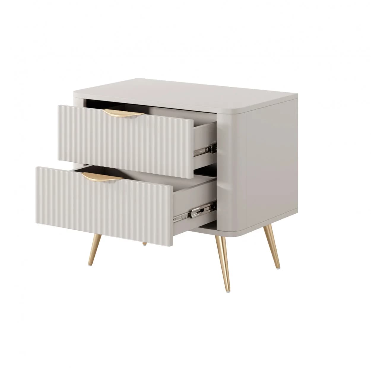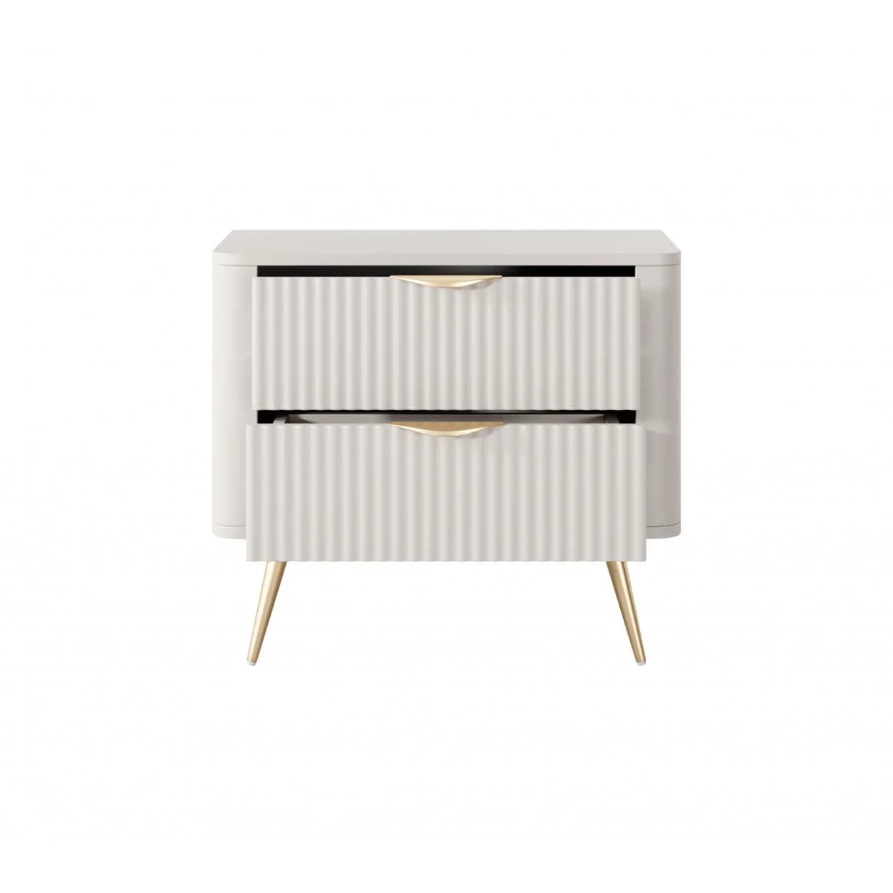Szafka nocna Aurora Nude to elegancki dodatek do sypialni. Dwie pojemne szuflady, ryflowane fronty i złote akcenty sprawiają, że mebel doskonale łączy funkcjonalność z wyrafinowanym stylem glamour.