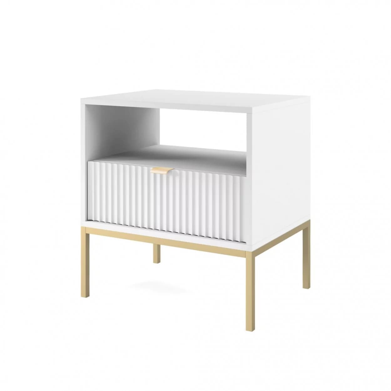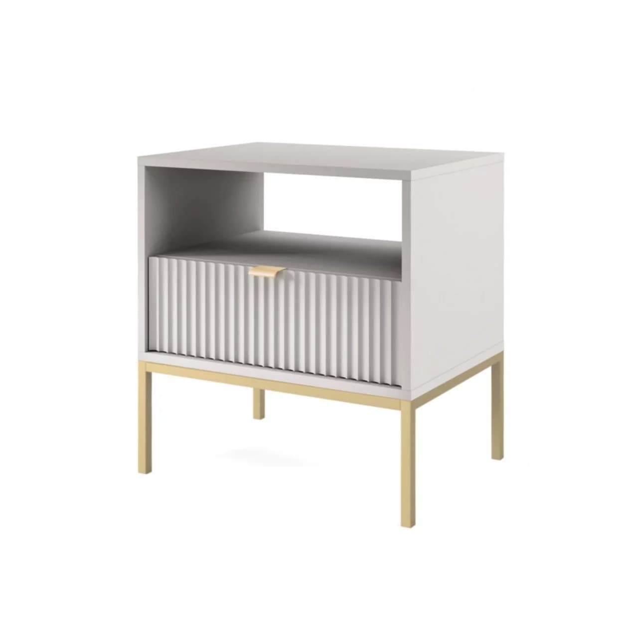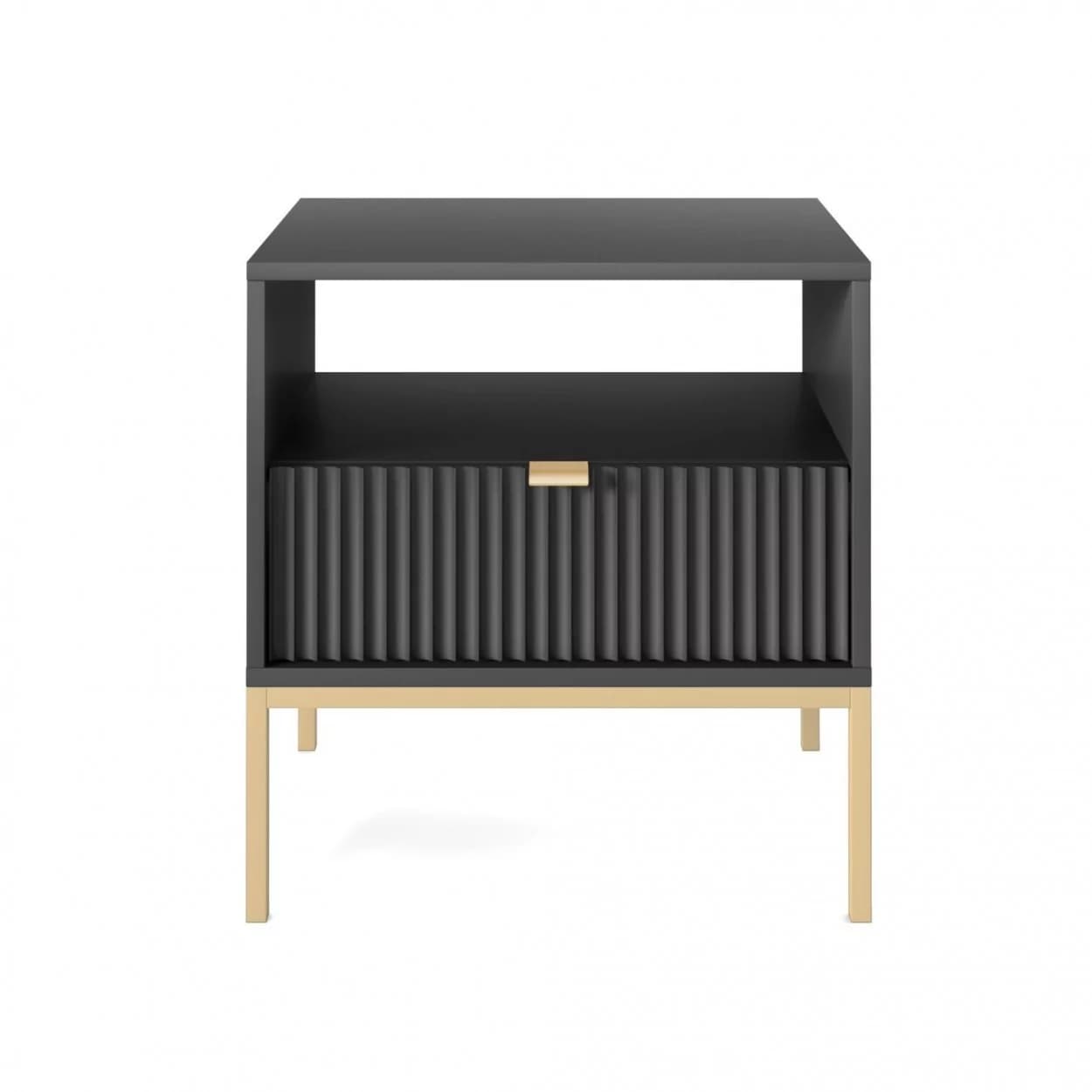 Szafka Nocna VESTA GOLD dostępna w czterech wariantach kolorystycznych, z eleganckimi ryflowanymi frontami i złotym stelażem. Posiada praktyczną szufladę i złote uchwyty, które dodają blasku i szyku.