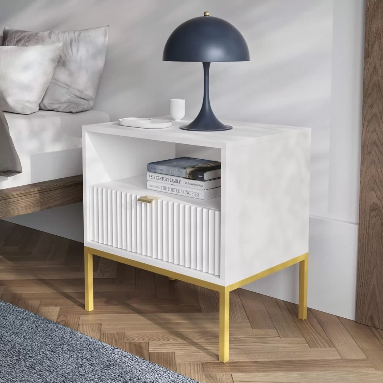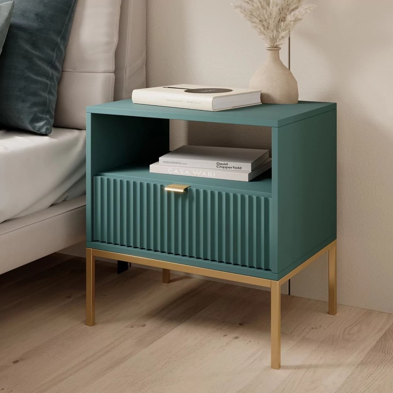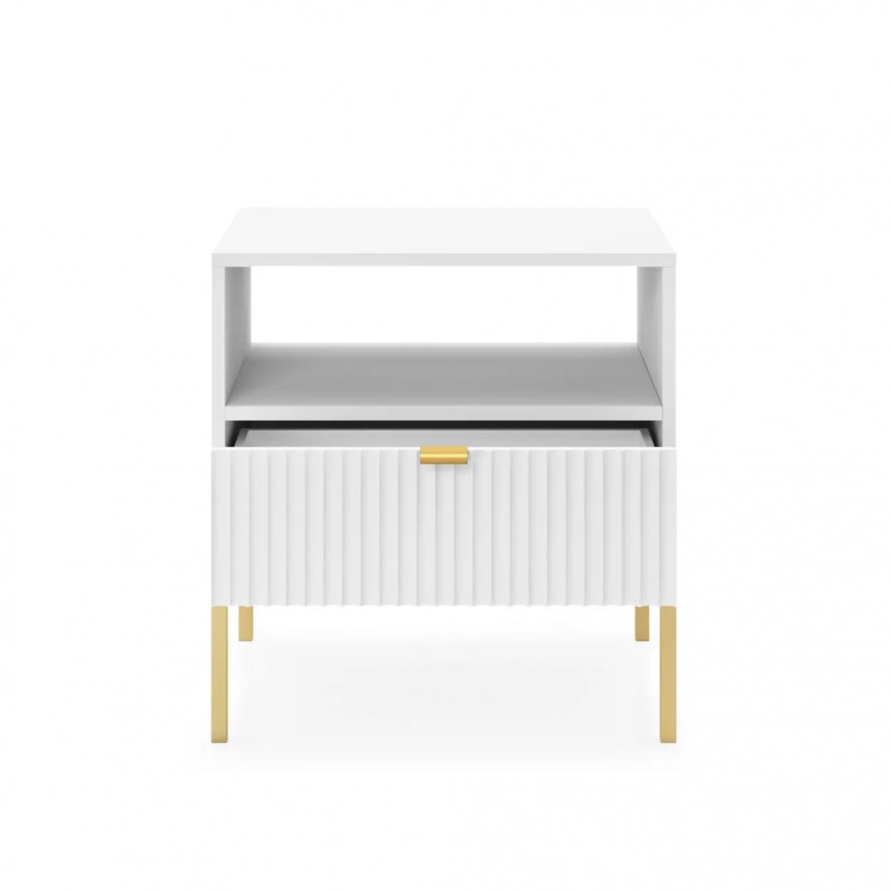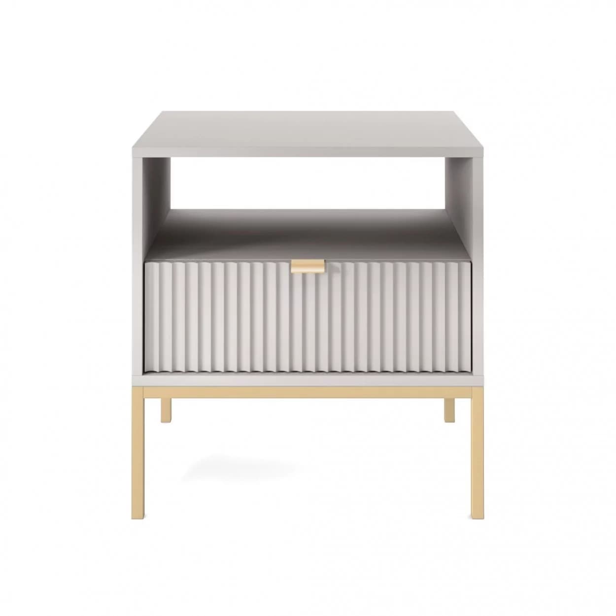 Szafka Nocna VESTA GOLD dostępna w czterech wariantach kolorystycznych, z eleganckimi ryflowanymi frontami i złotym stelażem. Posiada praktyczną szufladę i złote uchwyty, które dodają blasku i szyku.