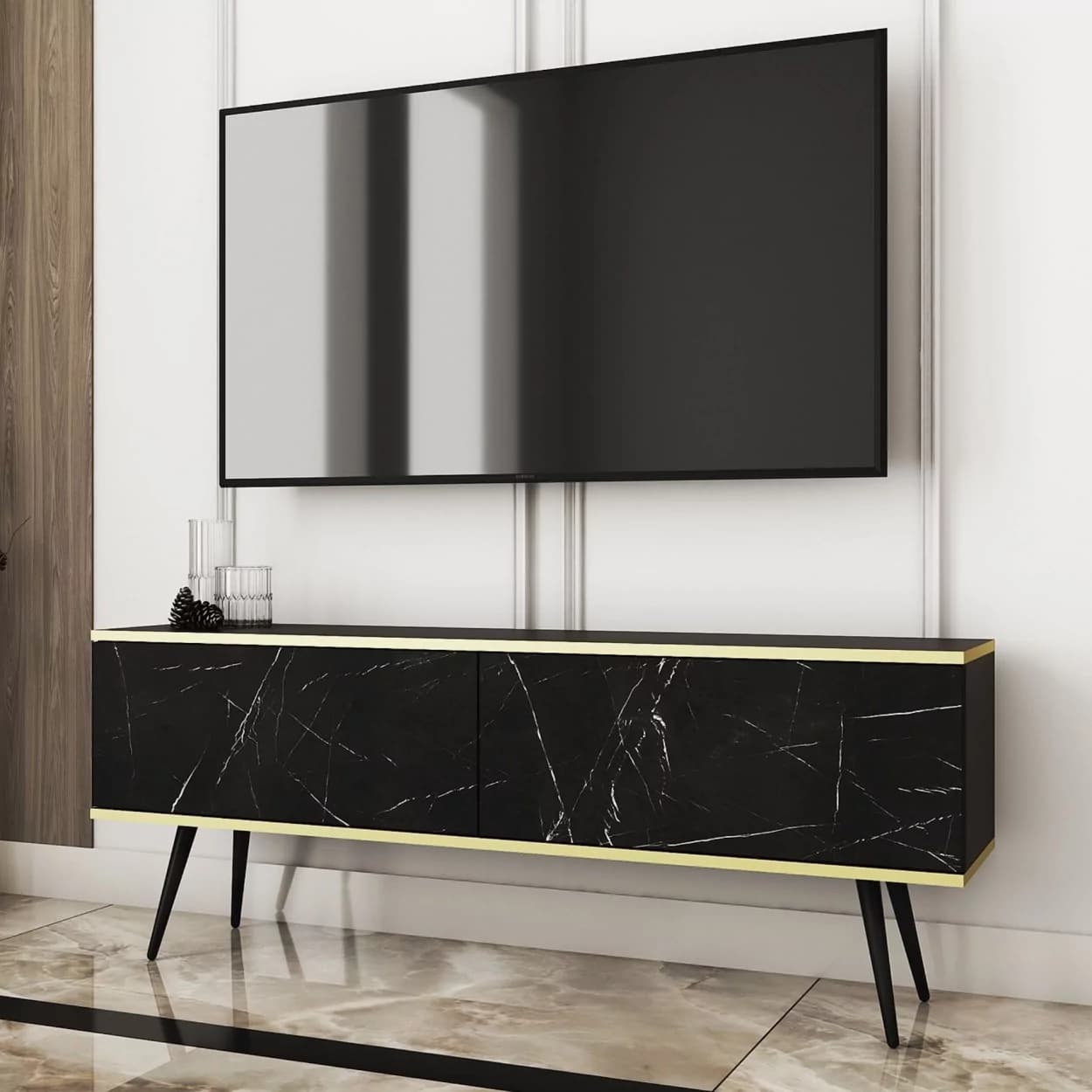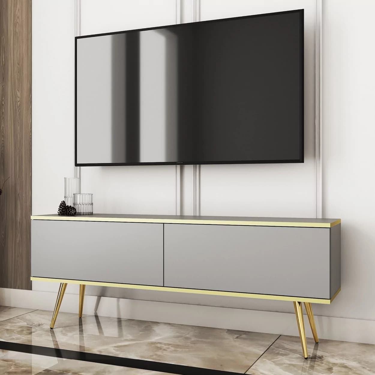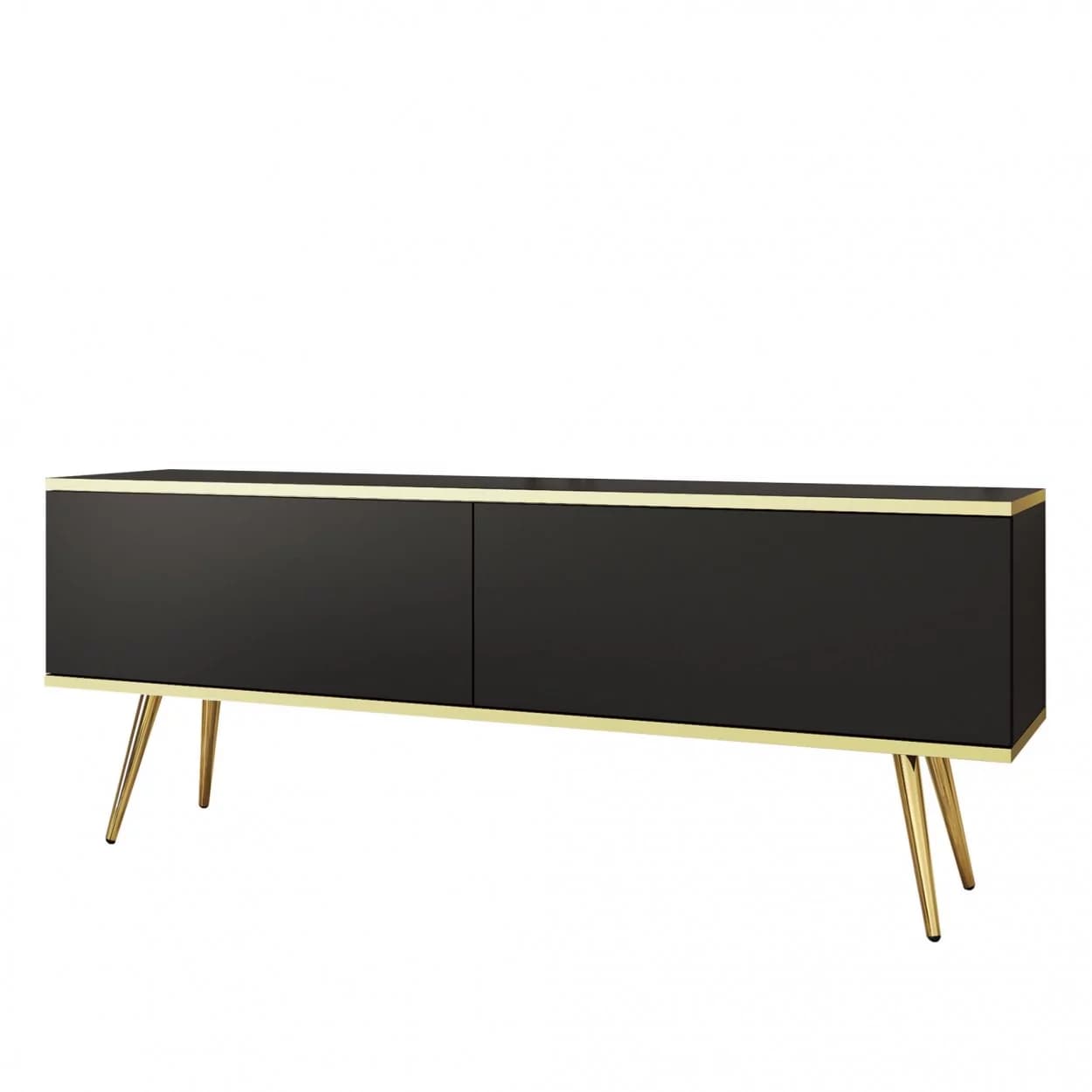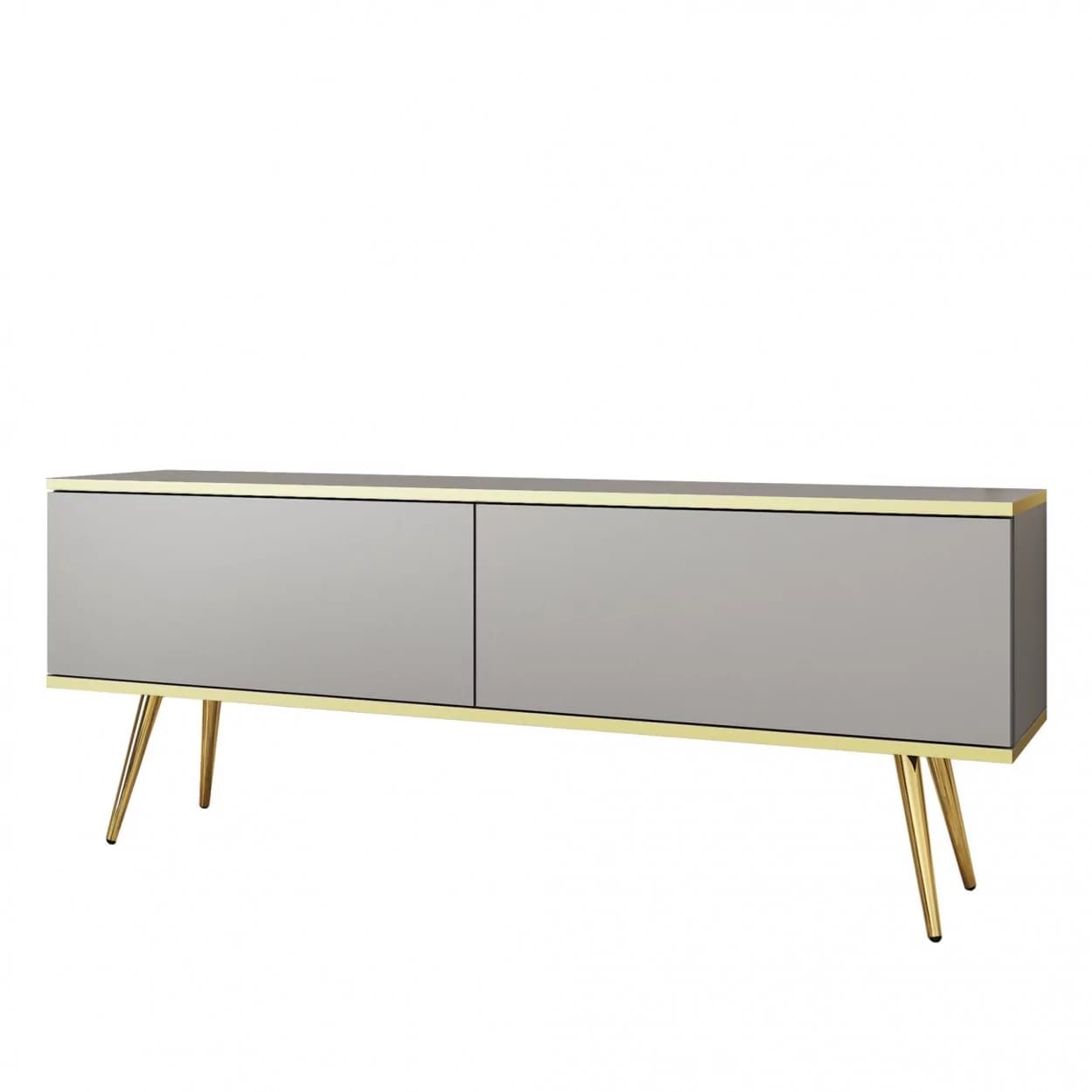 Szafka RTV LORI łączy nowoczesny design z funkcjonalnością. Dostępna w pięciu kolorach: czarnym, białym, beżowym, szarym i marmurze, z opcją złotych lub czarnych nóżek. Eleganckie złote listwy oraz bezuchwytowy system otwierania z matowym frontem opadającym do dołu zapewniają wygodę i styl. Idealna do nowoczesnych salonów, łącząc estetykę z praktycznymi rozwiązaniami.