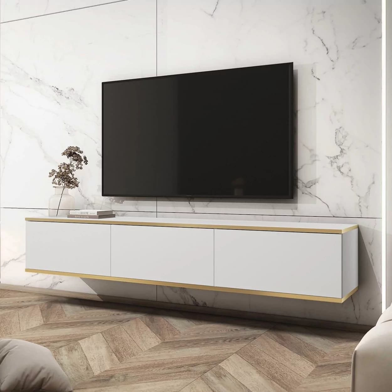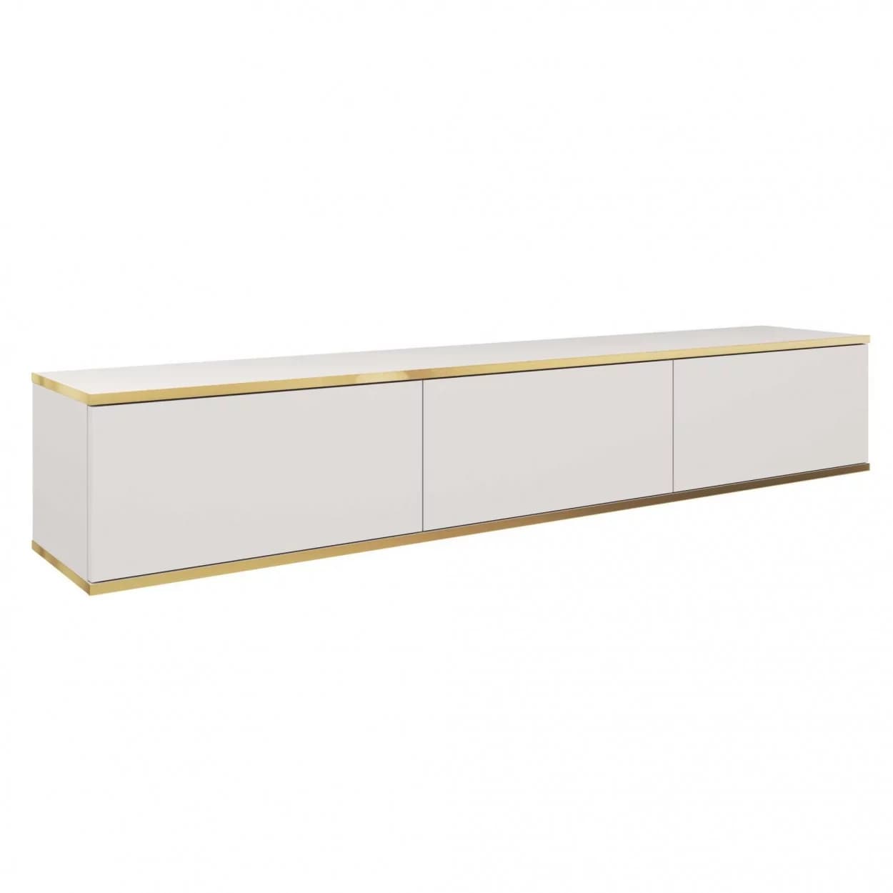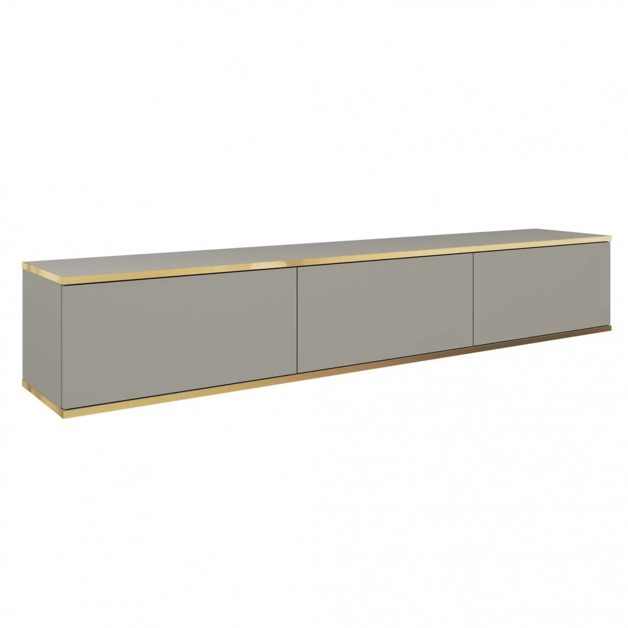 Szafka RTV OLYMP XL (175 cm) dostępna w pięciu kolorach: czarnym, białym, beżowym, marmurowym i szarym. Nowoczesny, podwieszany mebel z bezuchwytowym frontem i eleganckimi złotymi listwami. Styl i funkcjonalność w jednym!