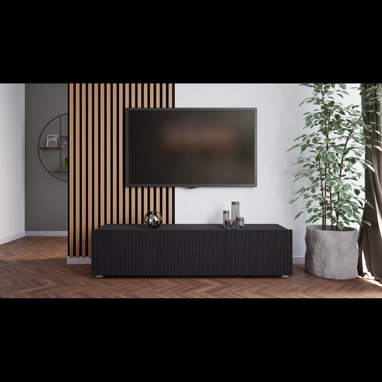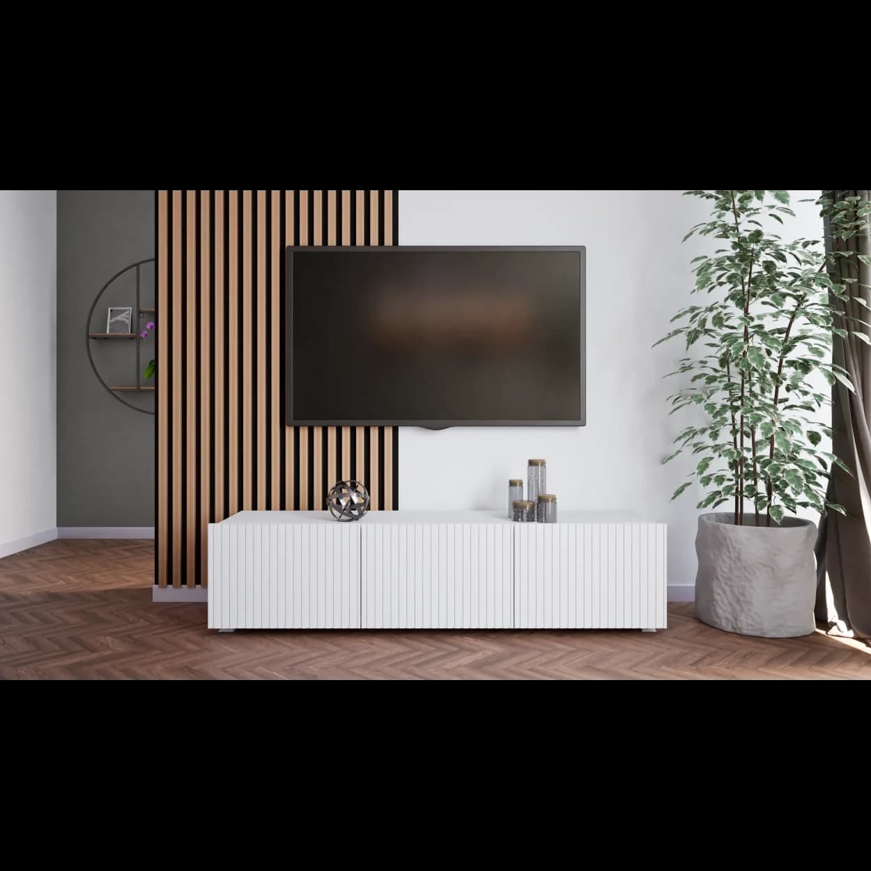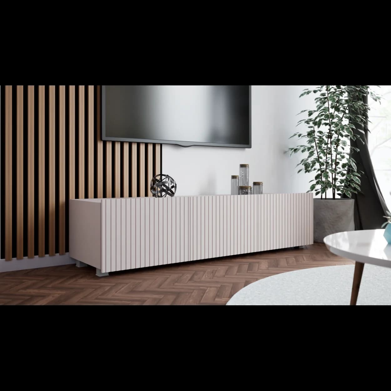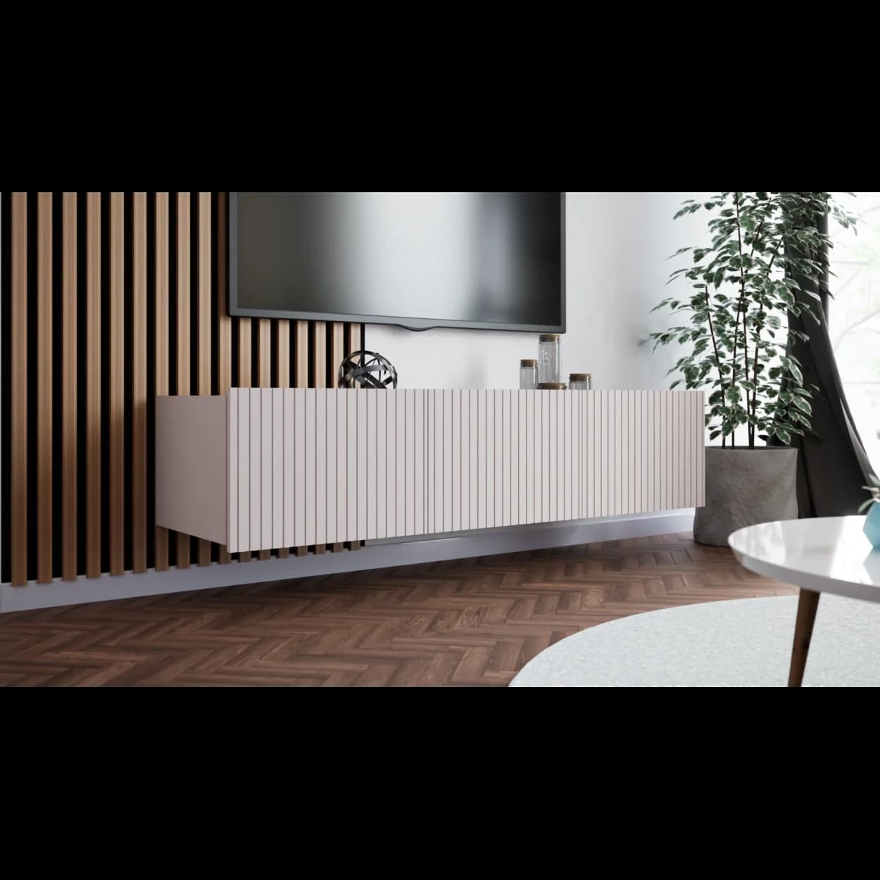 RYFLO 150 to większa wersja nowoczesnej szafki RTV z charakterystycznymi ryflowanymi frontami. Dostępna w trzech stylowych kolorach: biały mat, kaszmir i czarny mat. Może być montowana jako mebel stojący lub wiszący, zapewniając elastyczność aranżacyjną.
