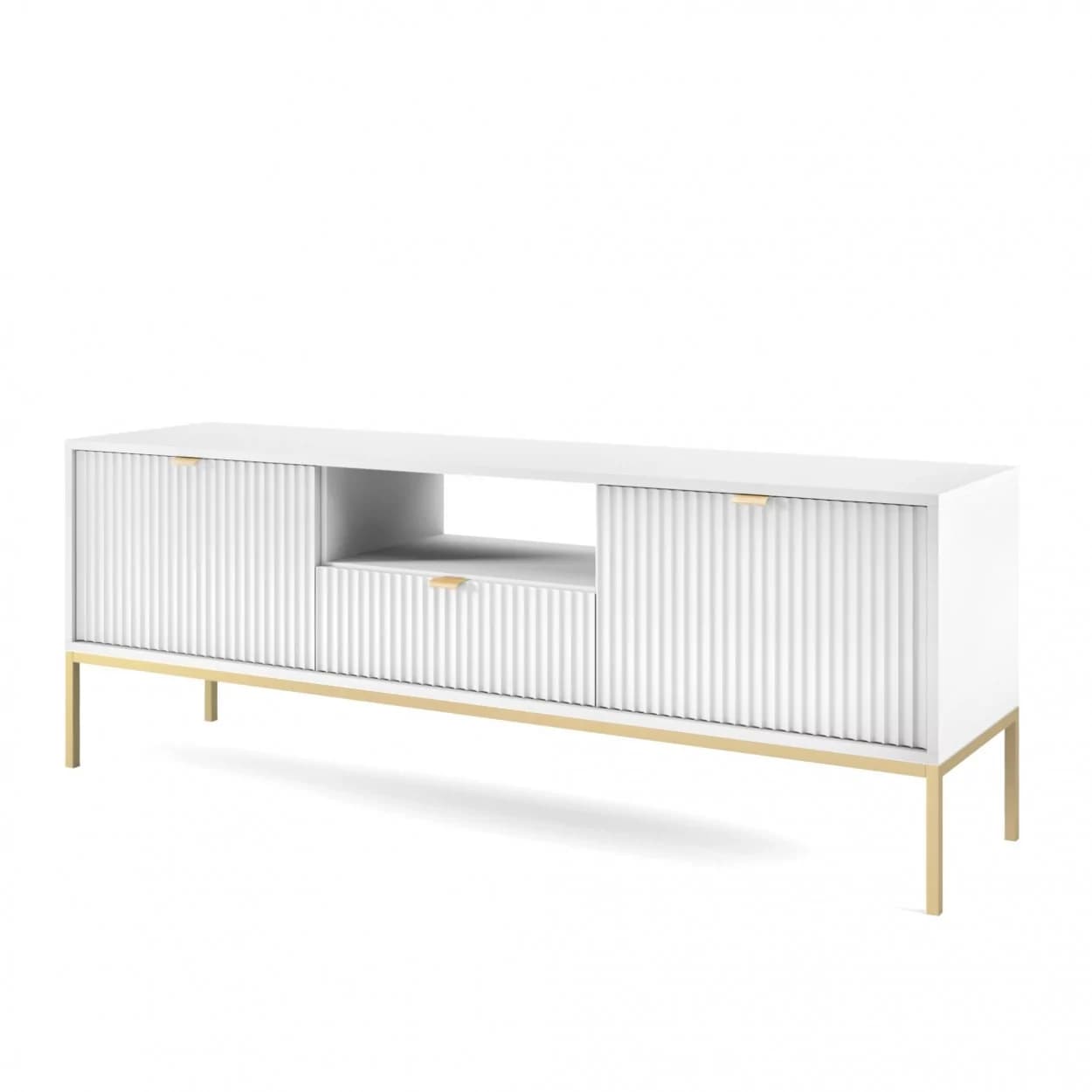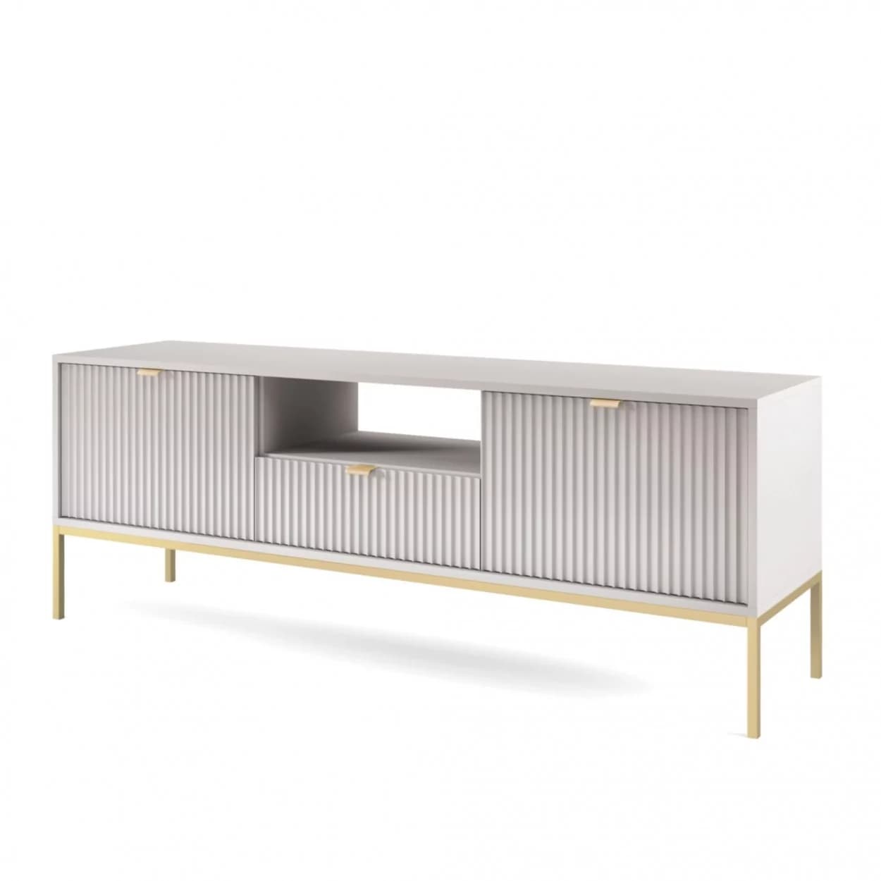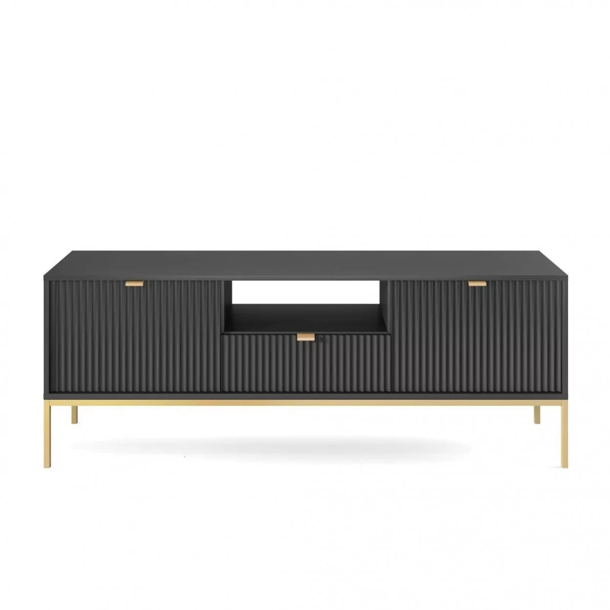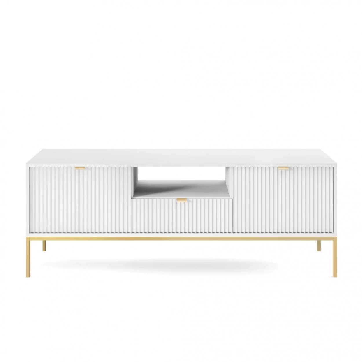 Szafka RTV VESTA GOLD dostępna w czterech wariantach kolorystycznych łączy eleganckie ryflowane fronty z nowoczesnym designem. Osadzona na złotym stelażu, wyposażona w środkową szufladę i złote uchwyty, łączy styl i funkcjonalność.
