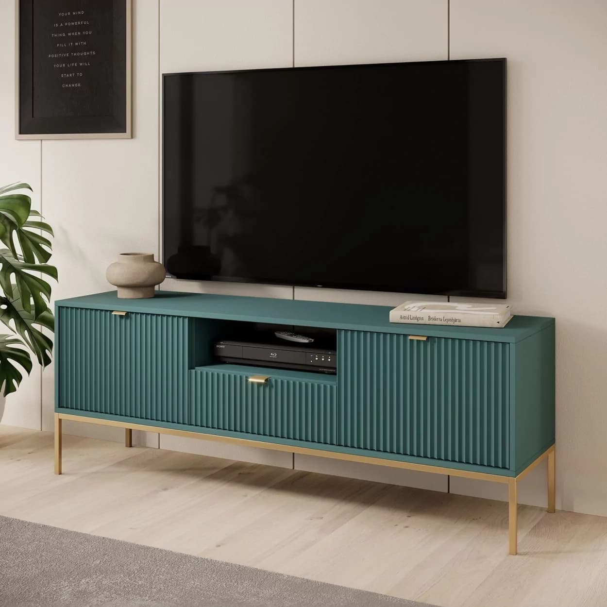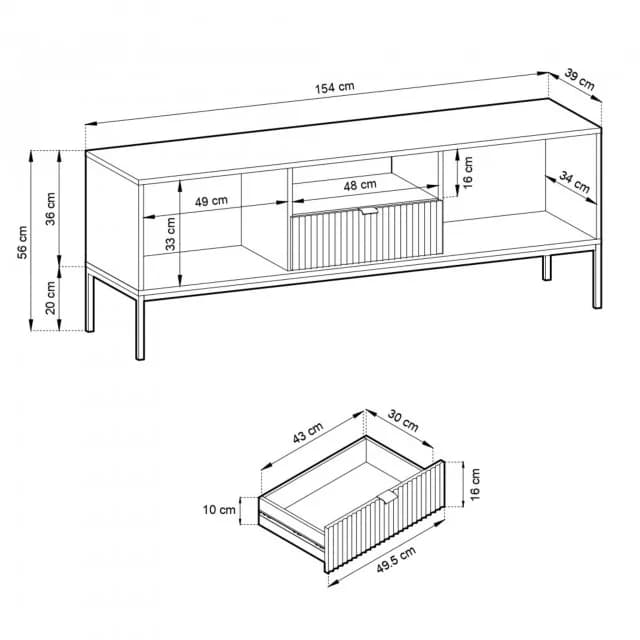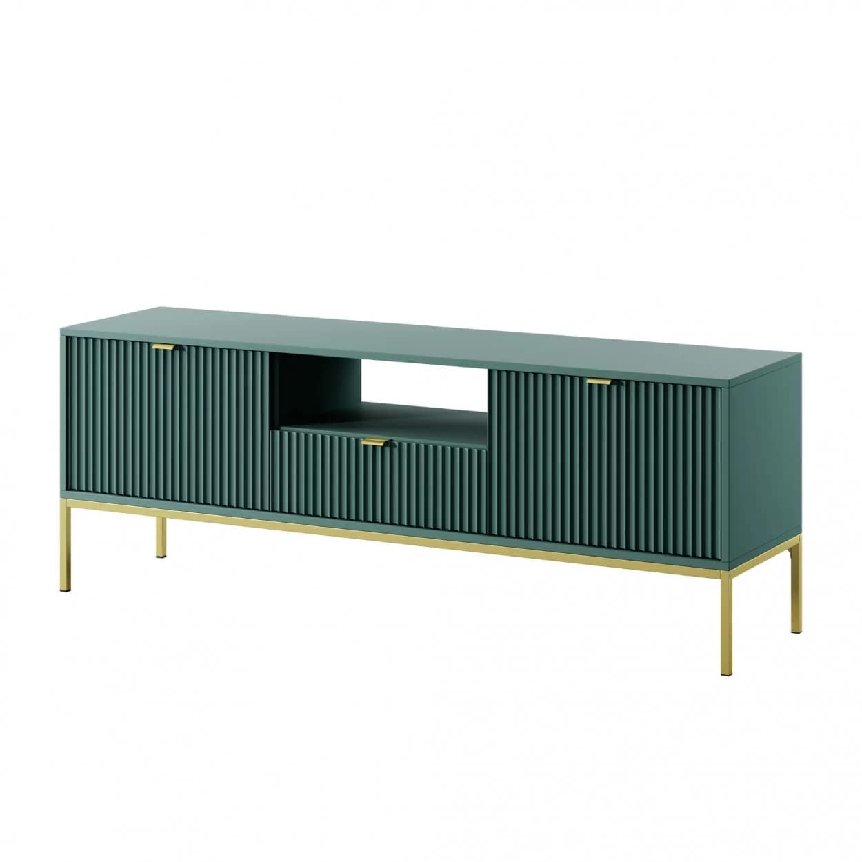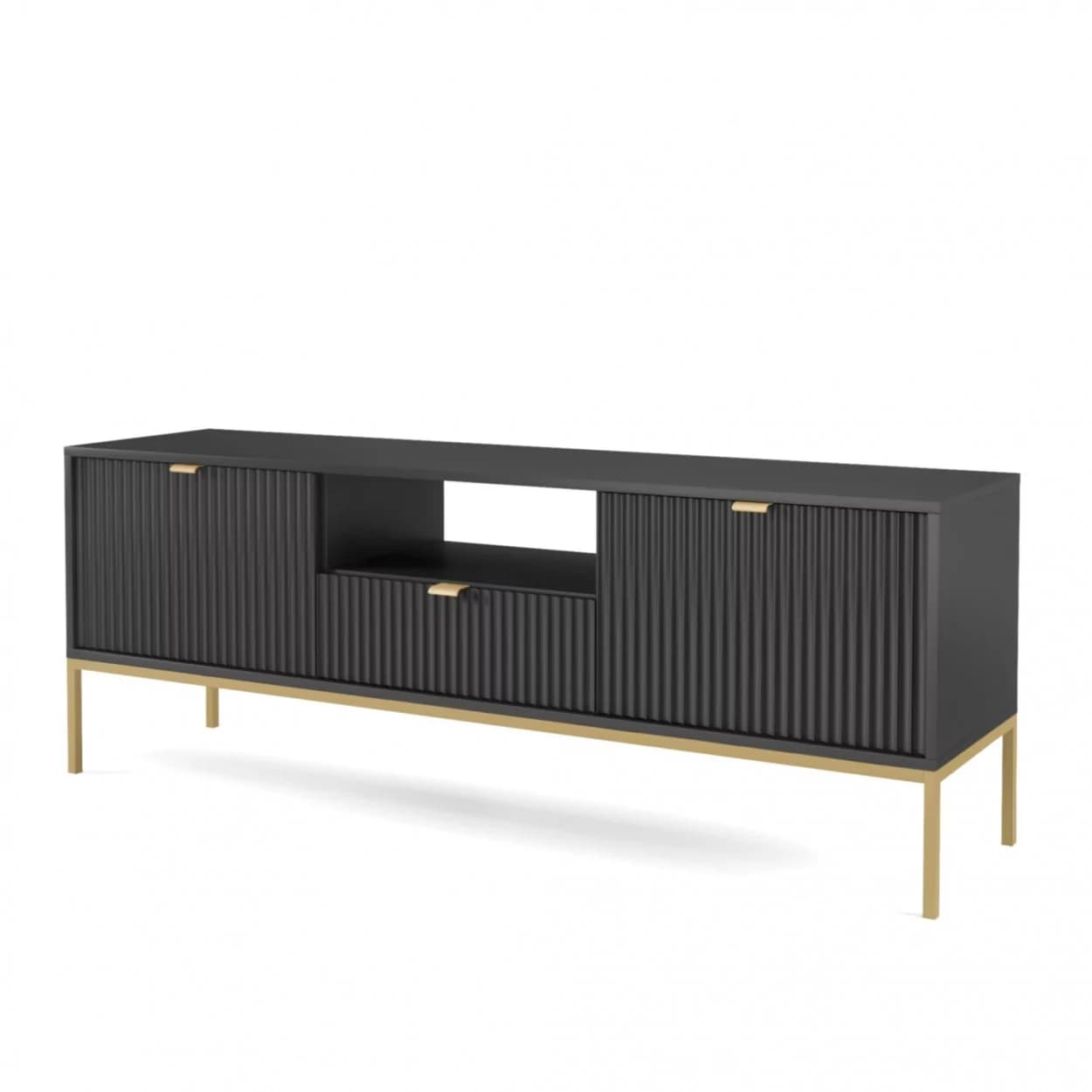 Szafka RTV VESTA GOLD dostępna w czterech wariantach kolorystycznych łączy eleganckie ryflowane fronty z nowoczesnym designem. Osadzona na złotym stelażu, wyposażona w środkową szufladę i złote uchwyty, łączy styl i funkcjonalność.