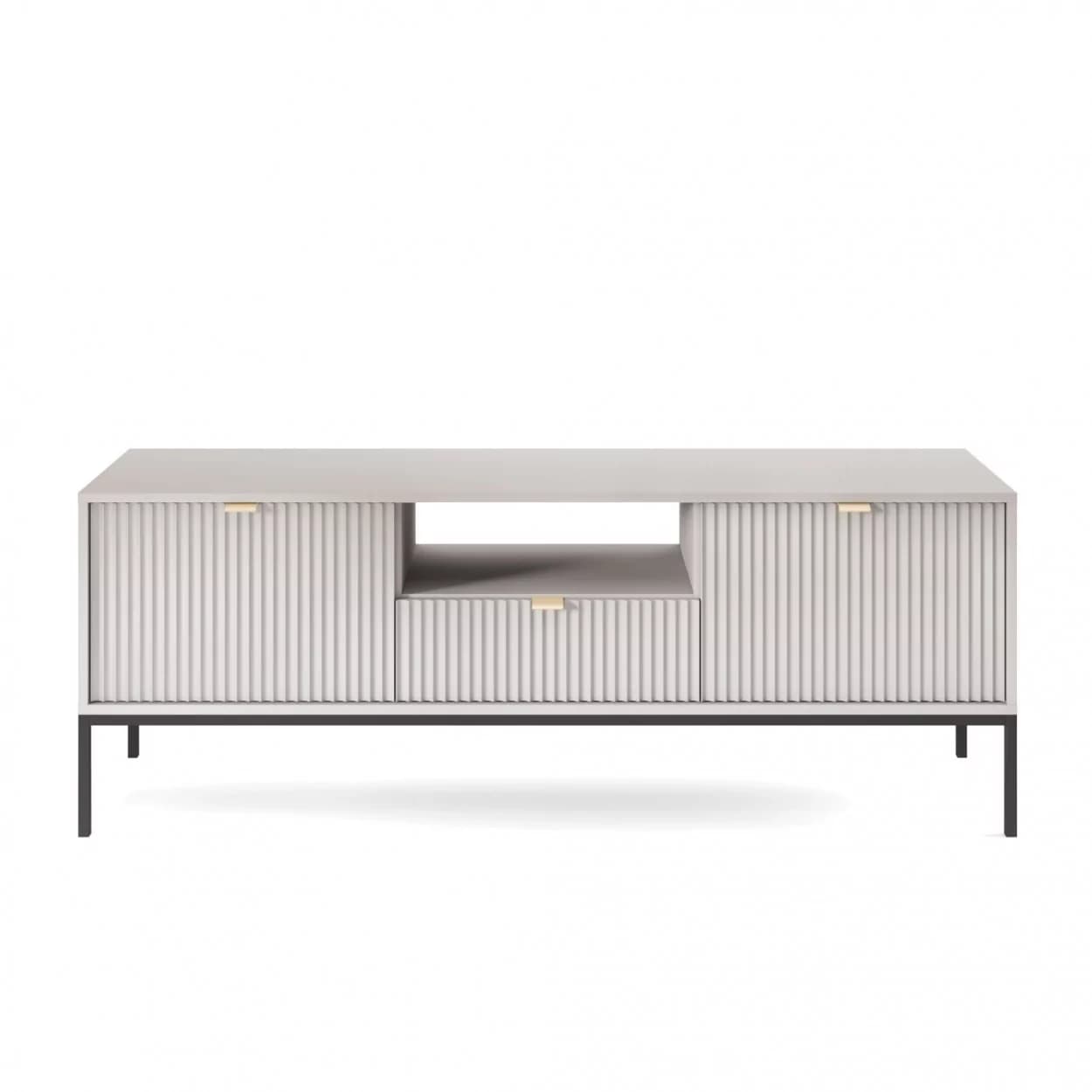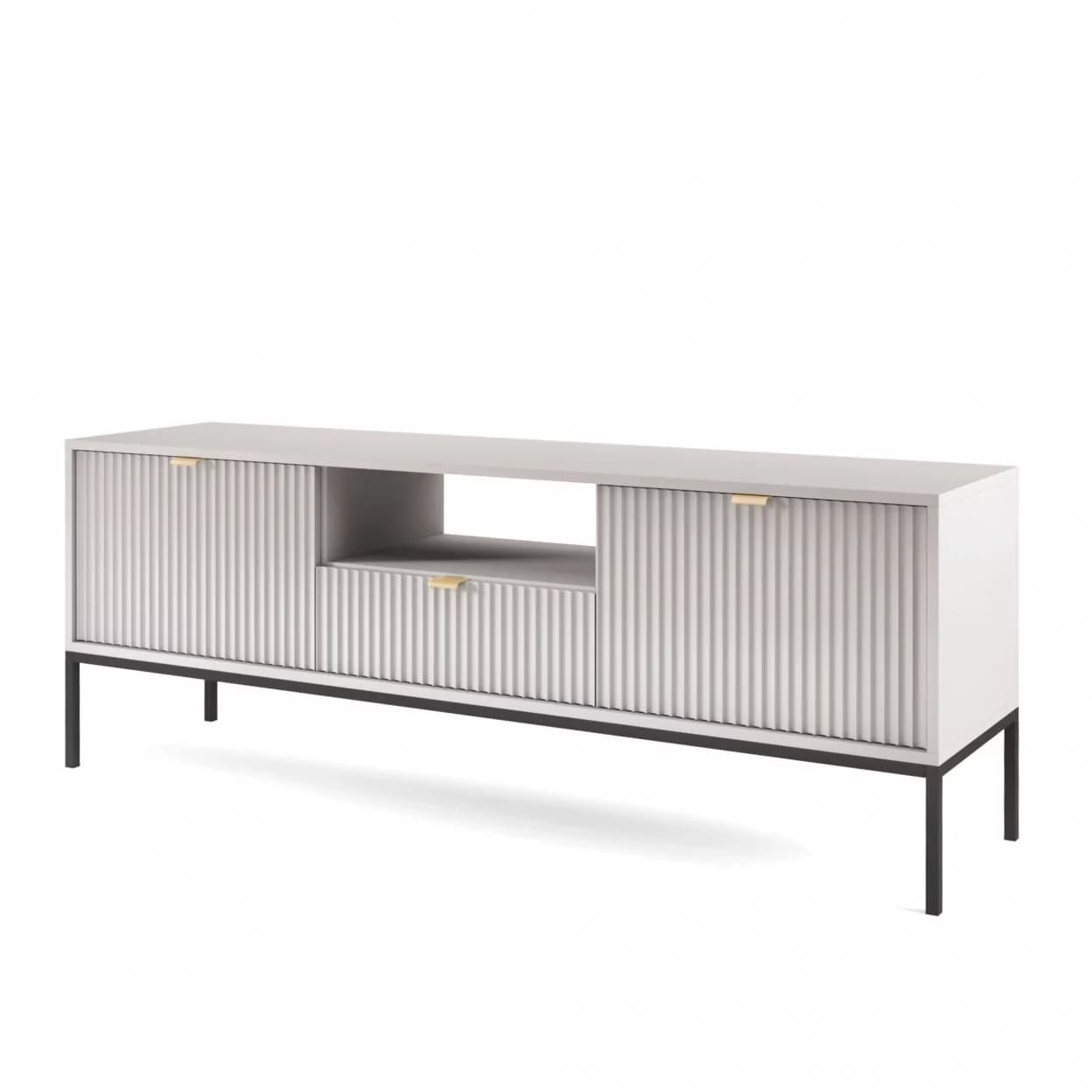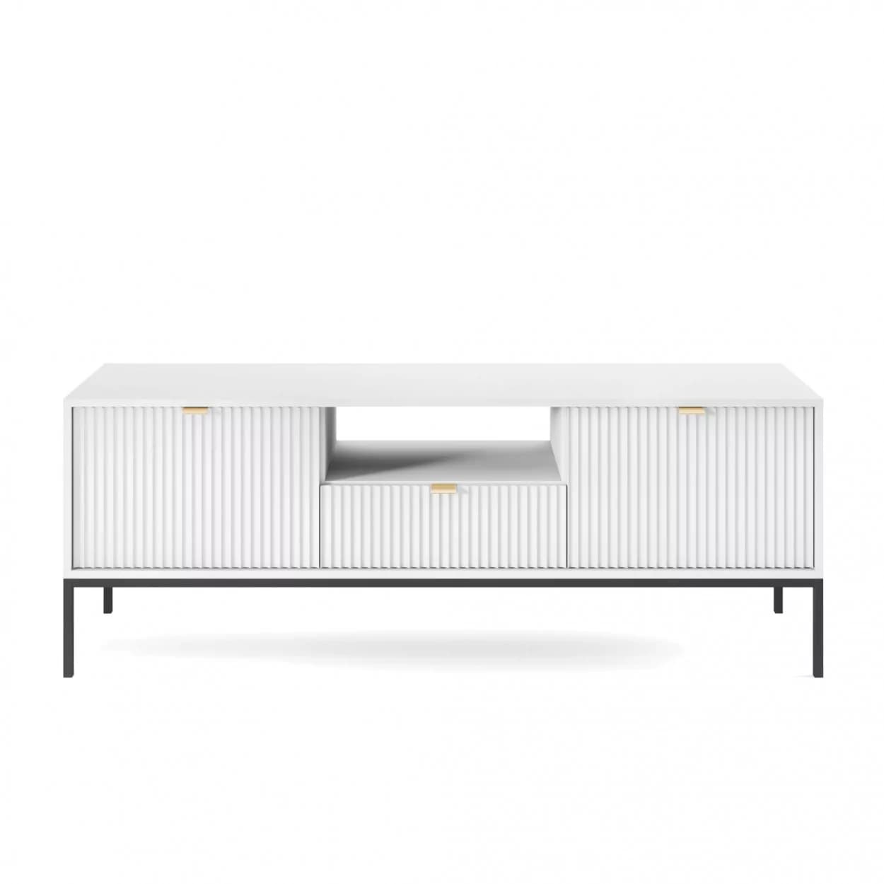 Szafka RTV VESTA dostępna w czterech wariantach kolorystycznych, wyróżnia się charakterystycznymi, ryflowanymi frontami oraz solidnym metalowym stelażem. Wyposażona w przestronne szafki, łączy nowoczesny design z funkcjonalnością.