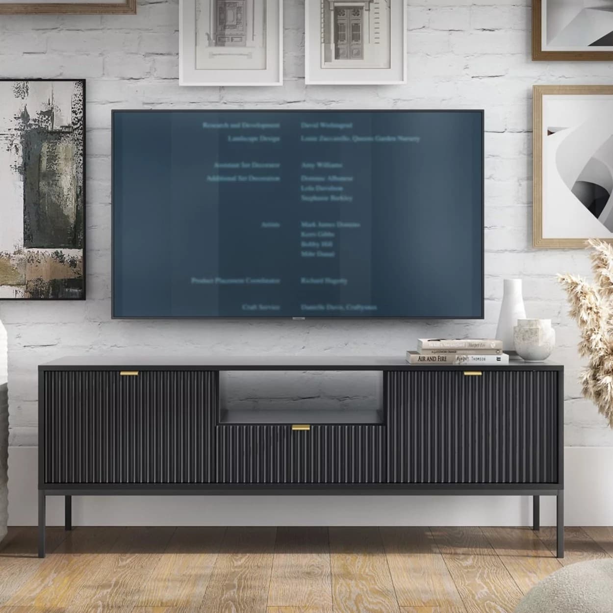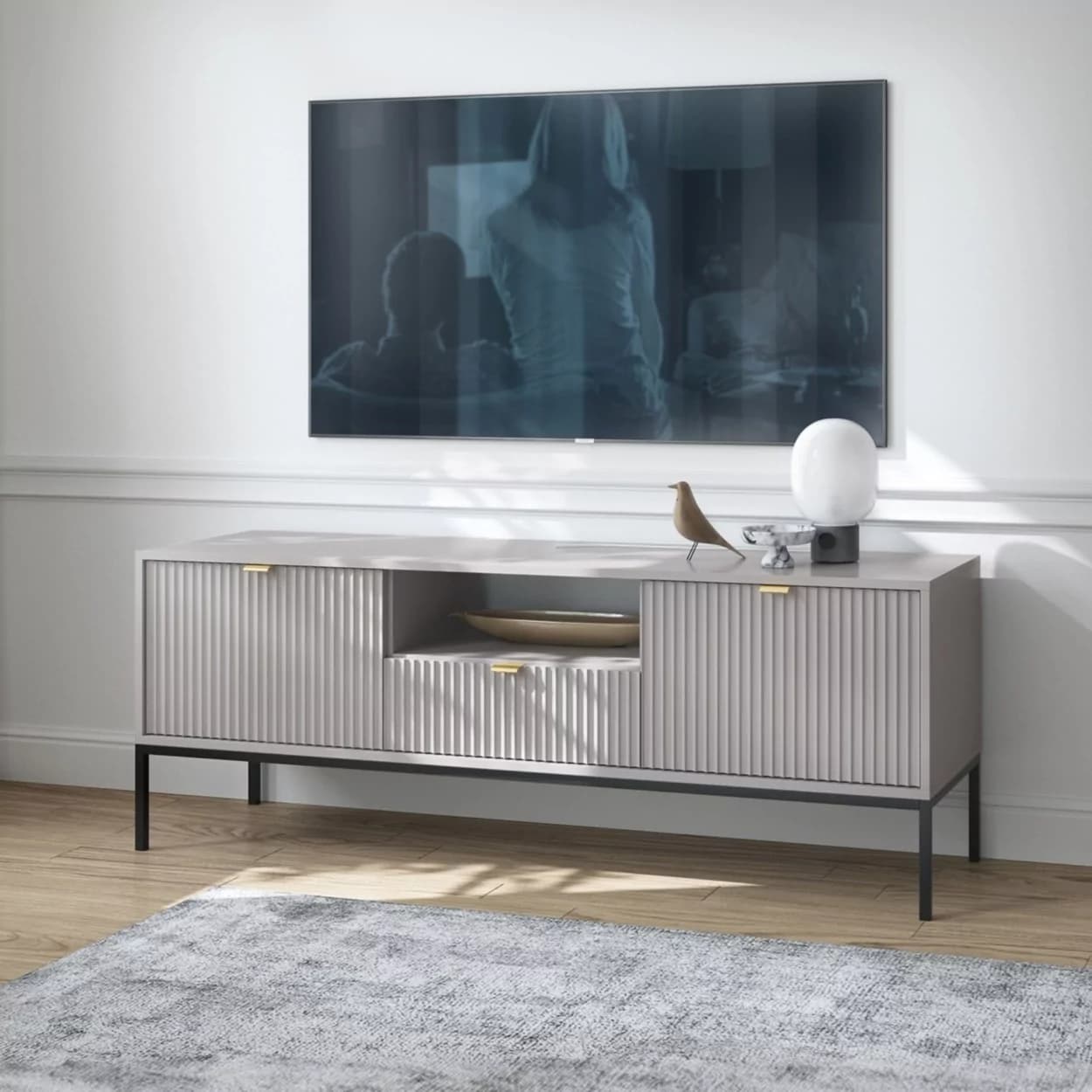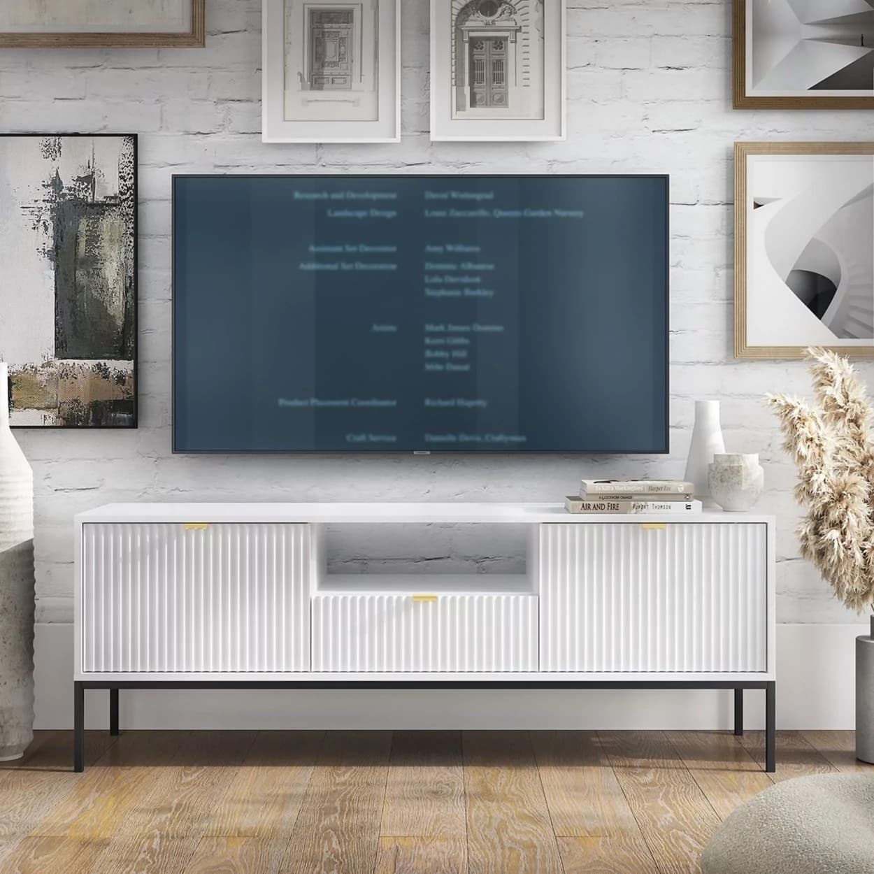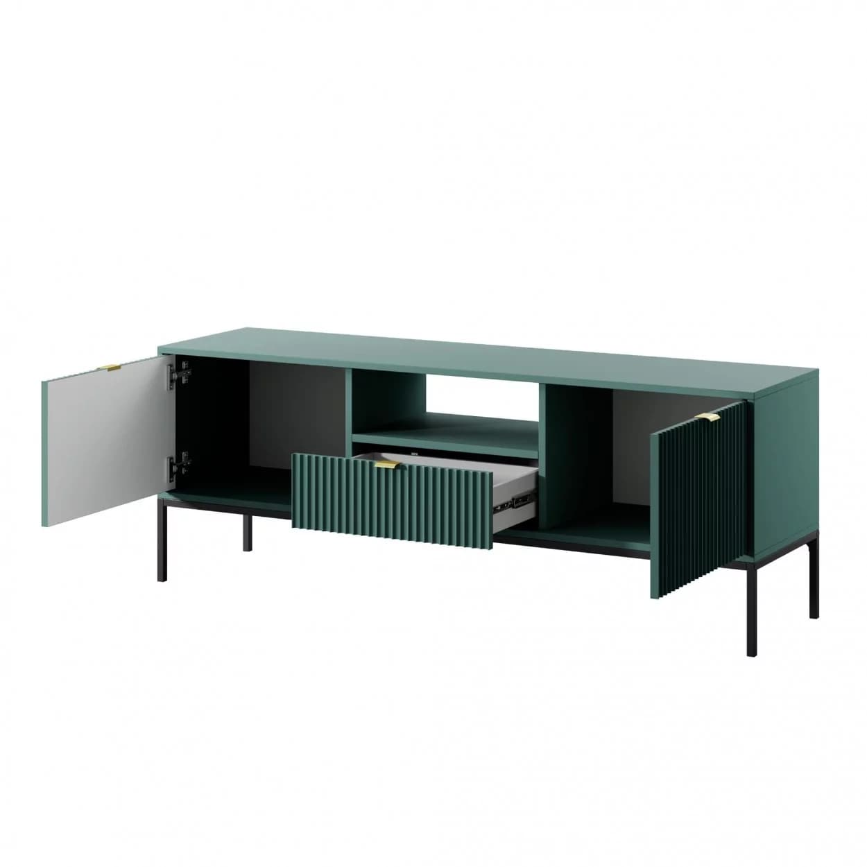 Szafka RTV VESTA dostępna w czterech wariantach kolorystycznych, wyróżnia się charakterystycznymi, ryflowanymi frontami oraz solidnym metalowym stelażem. Wyposażona w przestronne szafki, łączy nowoczesny design z funkcjonalnością.