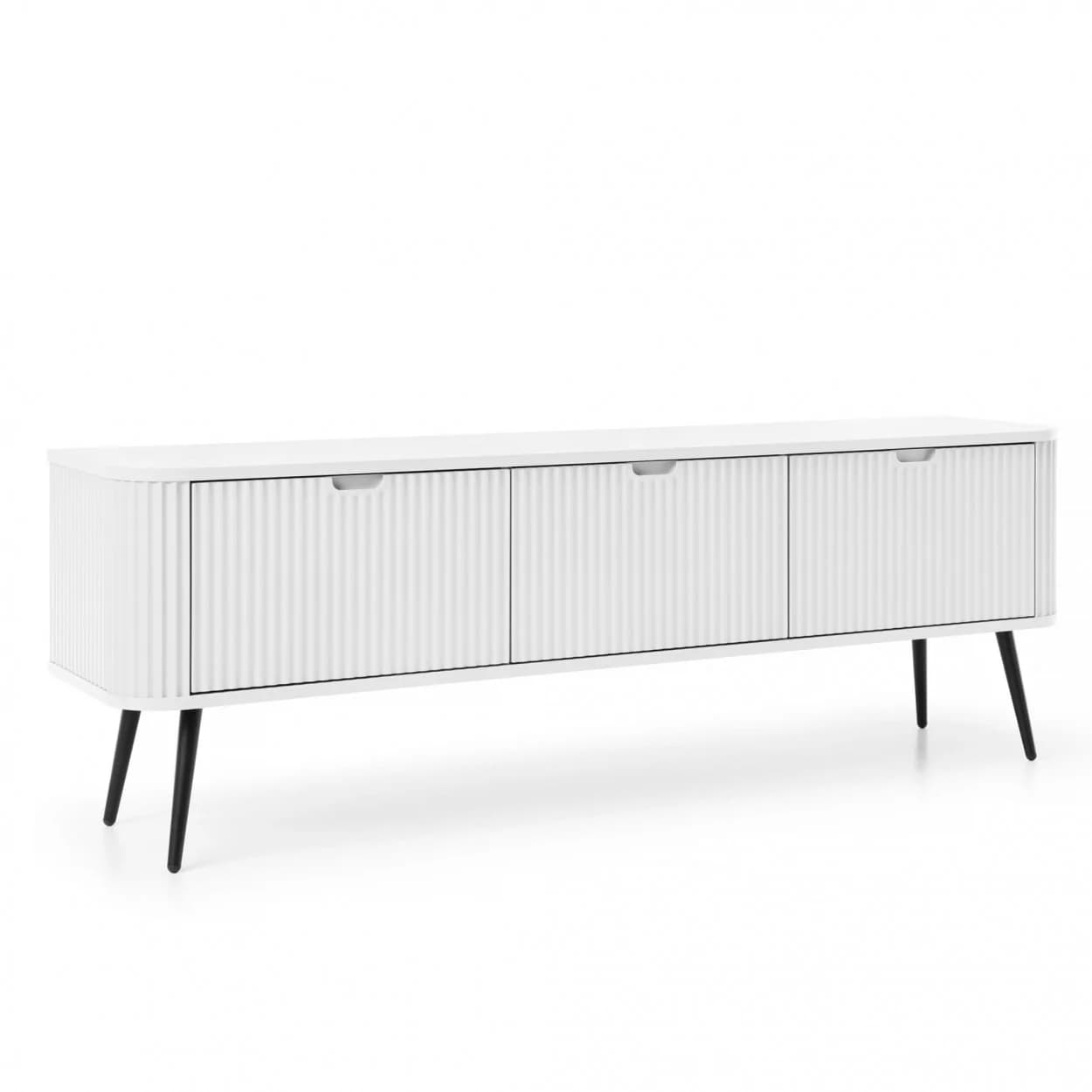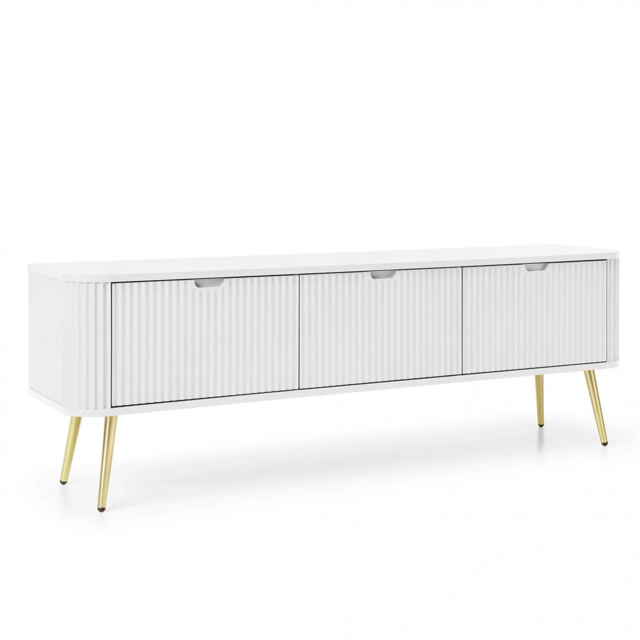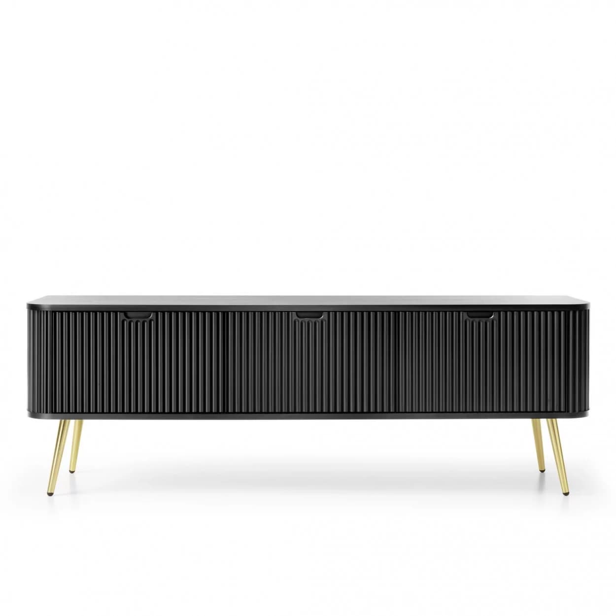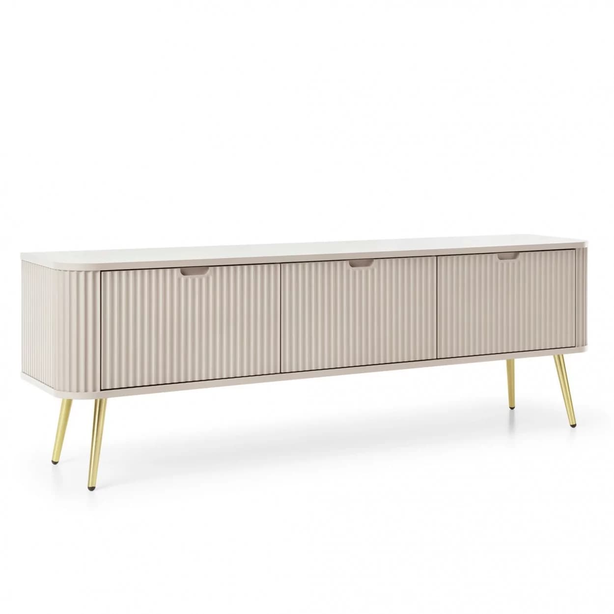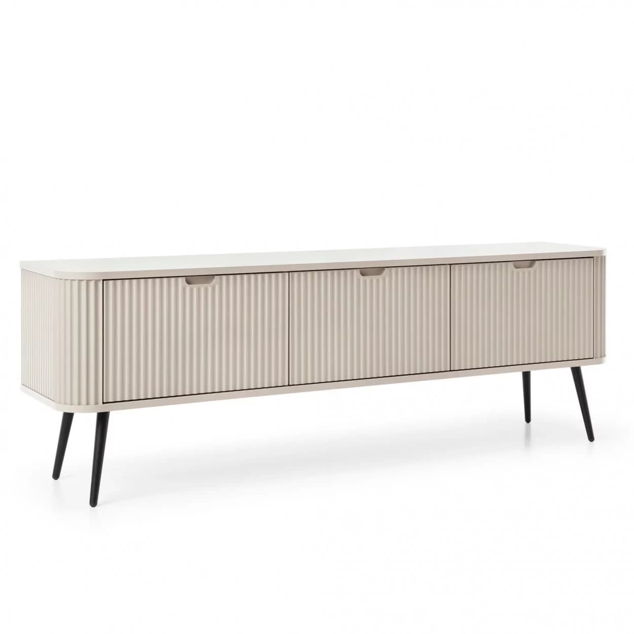 Szafka RTV ZOYA trzydrzwiowa to elegancki mebel z ryflowanym frontem i zaokrąglonymi bokami. Nowoczesny design, trzy kolory i metalowe nóżki w złotym lub czarnym wykończeniu.