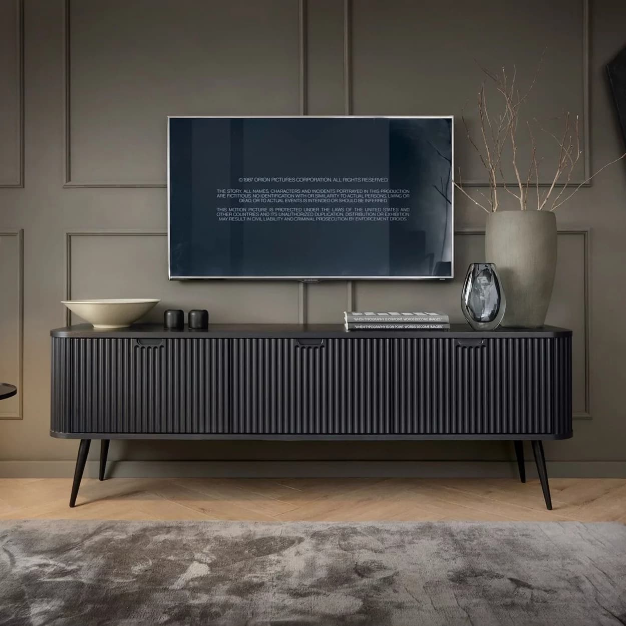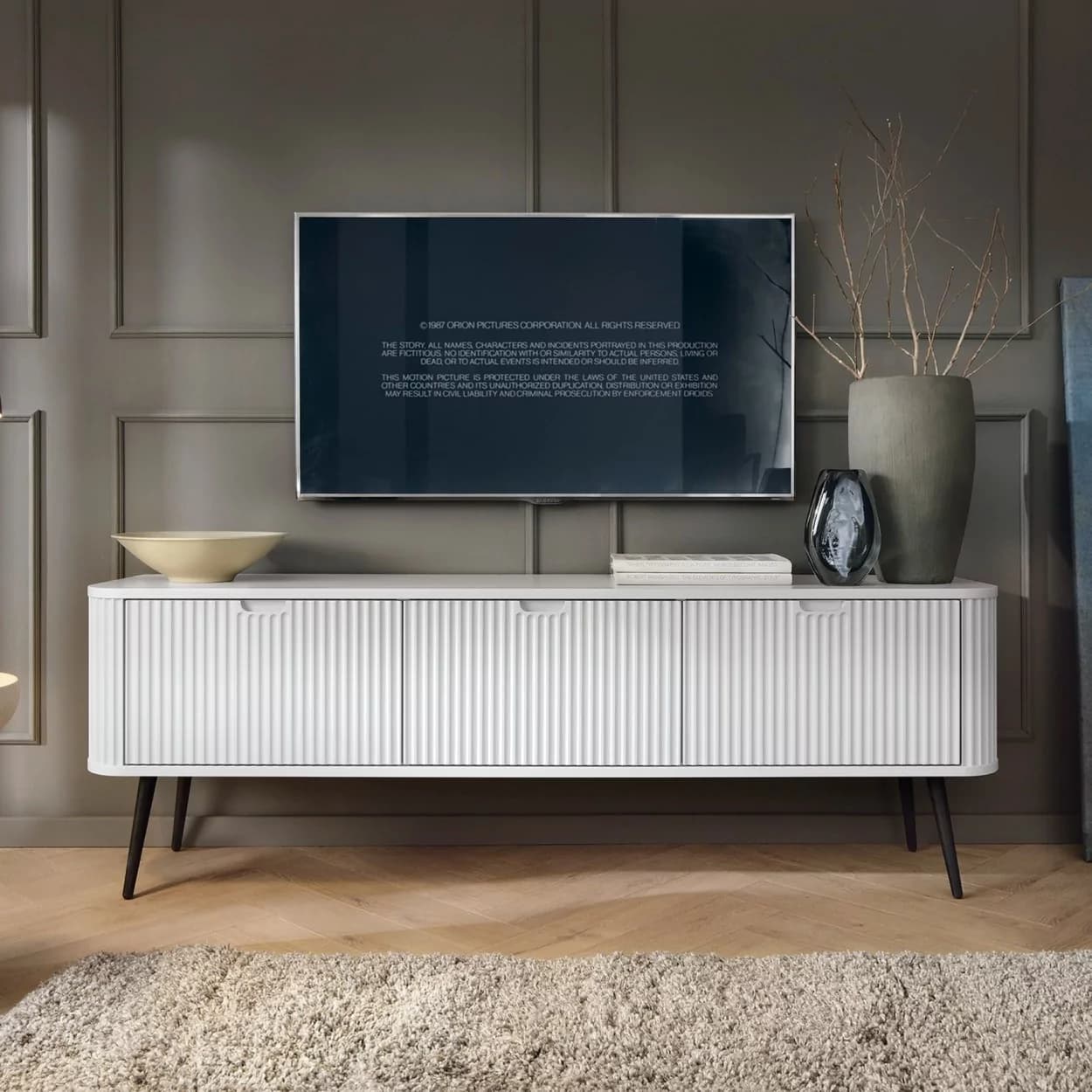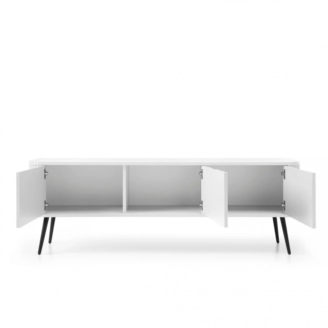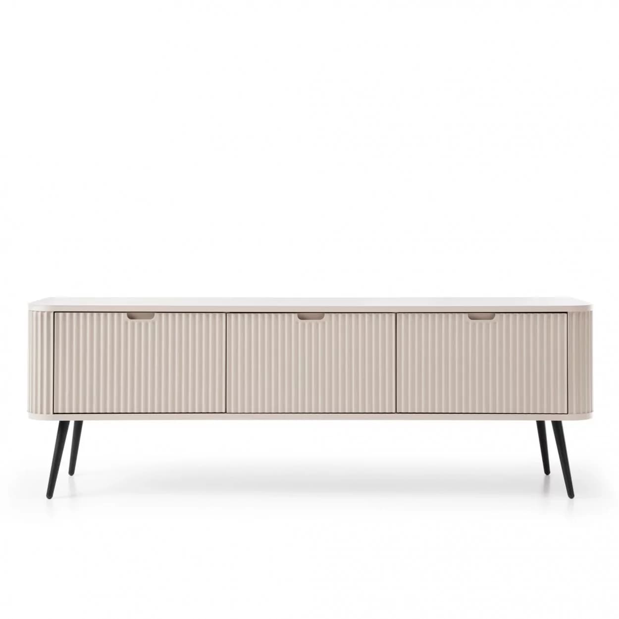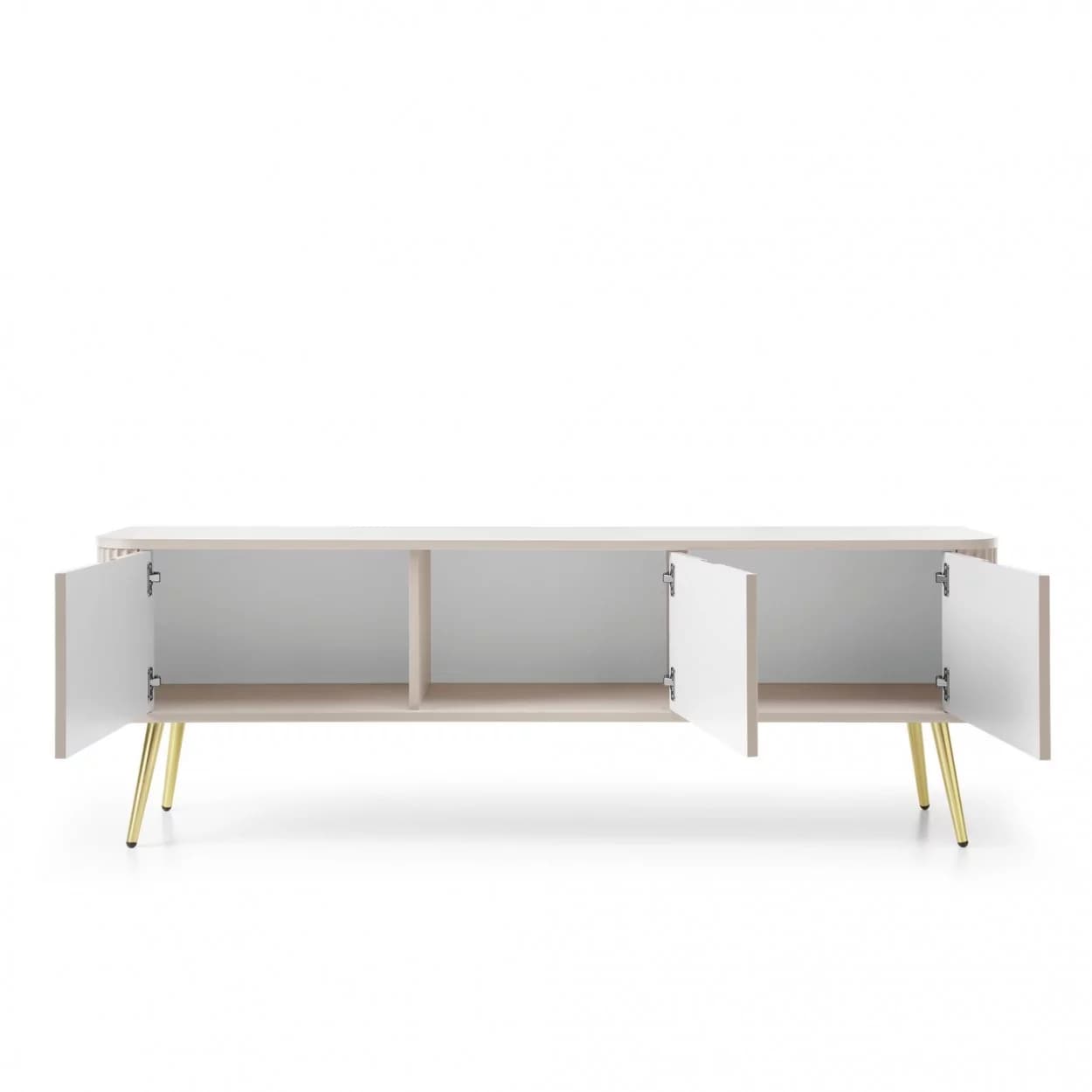Szafka RTV ZOYA trzydrzwiowa to elegancki mebel z ryflowanym frontem i zaokrąglonymi bokami. Nowoczesny design, trzy kolory i metalowe nóżki w złotym lub czarnym wykończeniu.