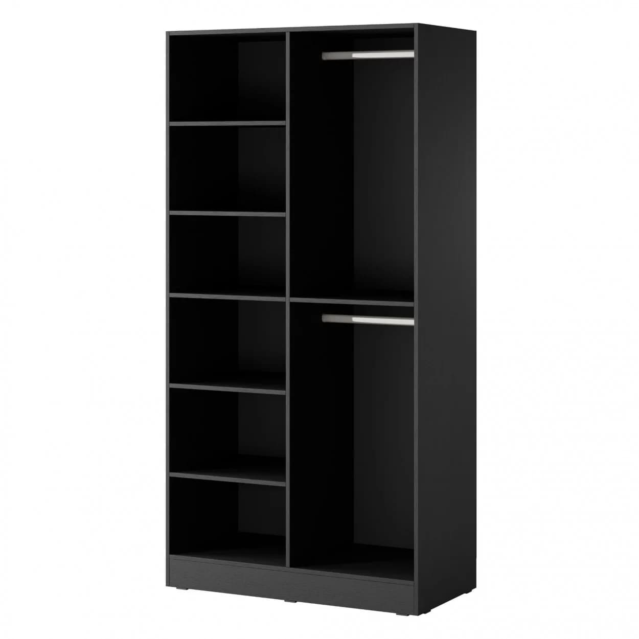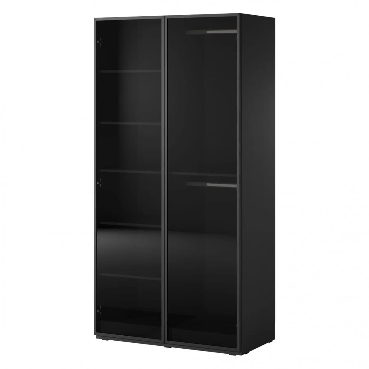 Szafa dwudrzwiowa NOOK w eleganckim czarnym kolorze z luksusowym frontem z przyciemnianego szkła Antisol. Stylowa i funkcjonalna.