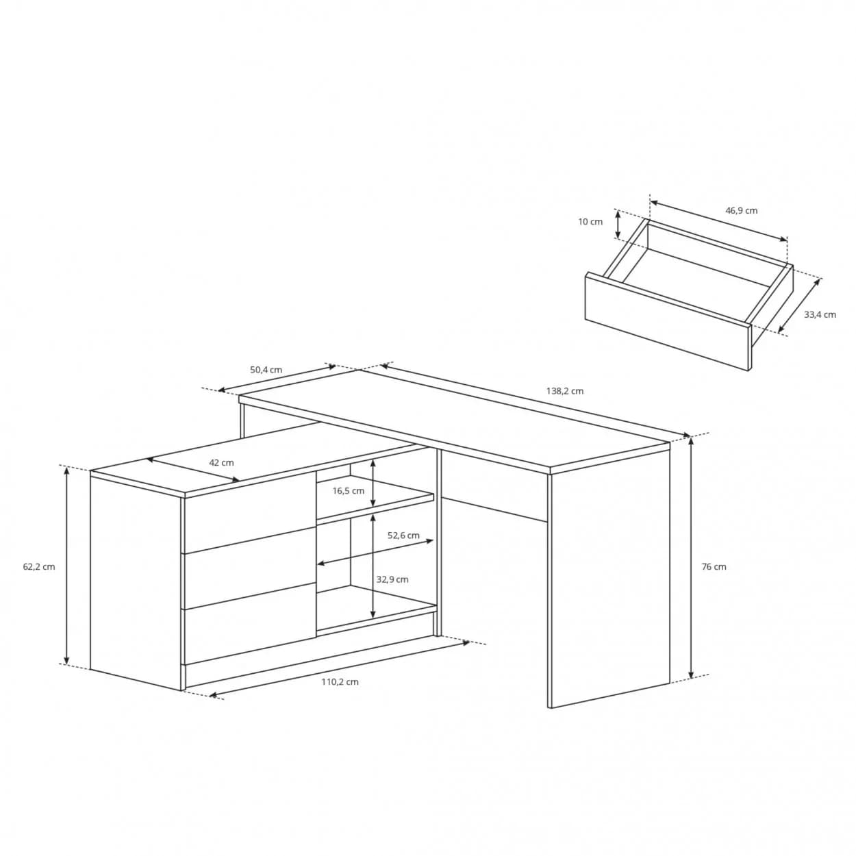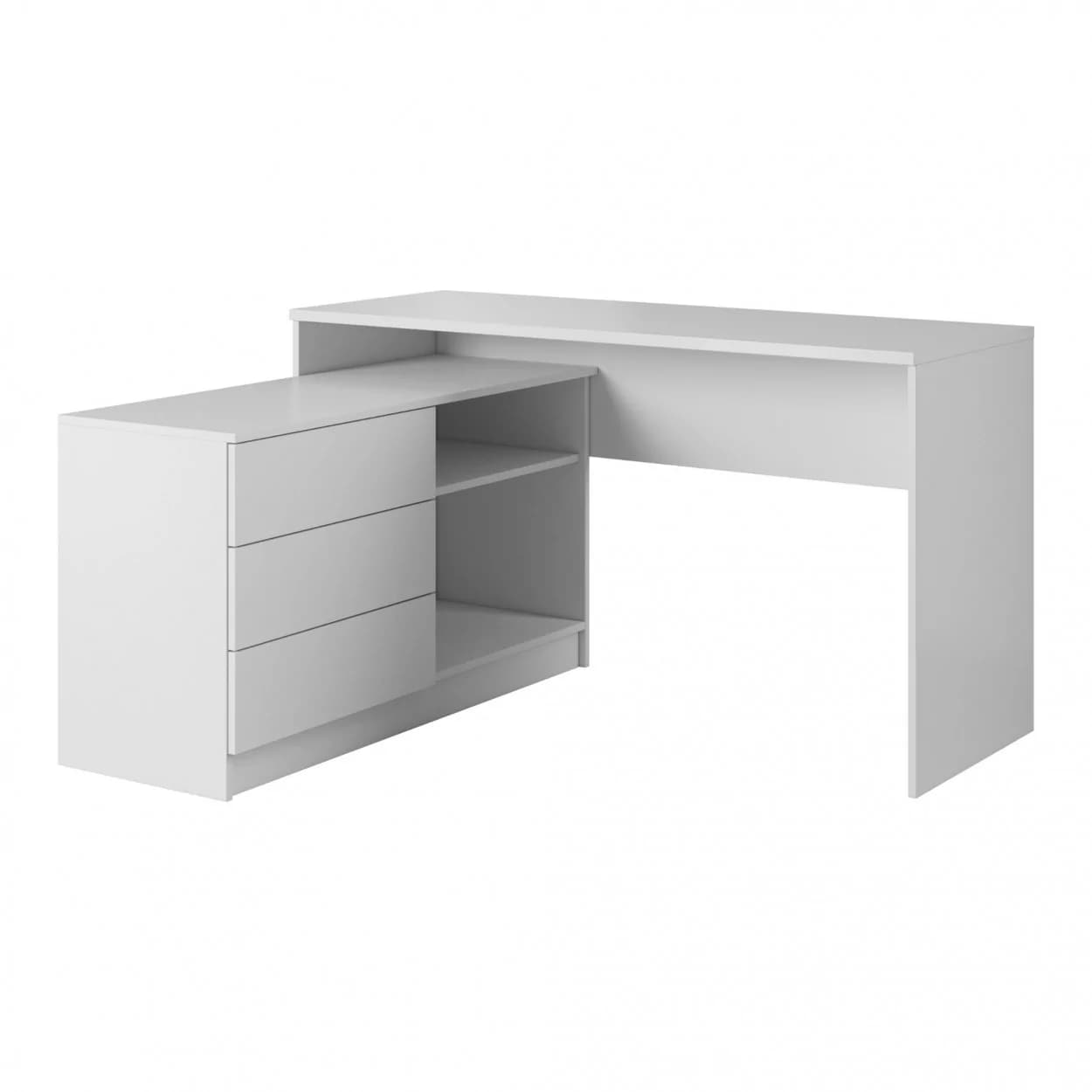 NEO to narożne biurko w białym macie, które łączy styl i funkcjonalność. Trzy szuflady, półki i system push-to-open tworzą nowoczesne, praktyczne miejsce do pracy lub nauki.