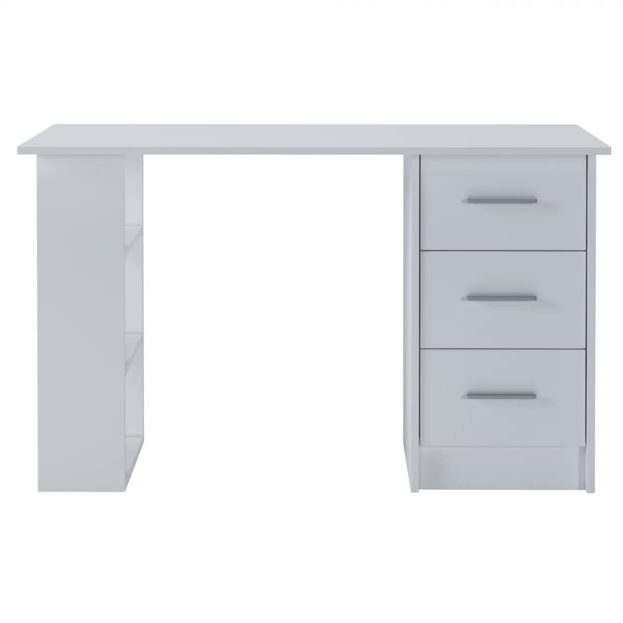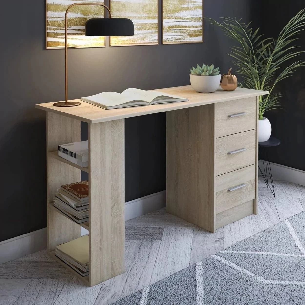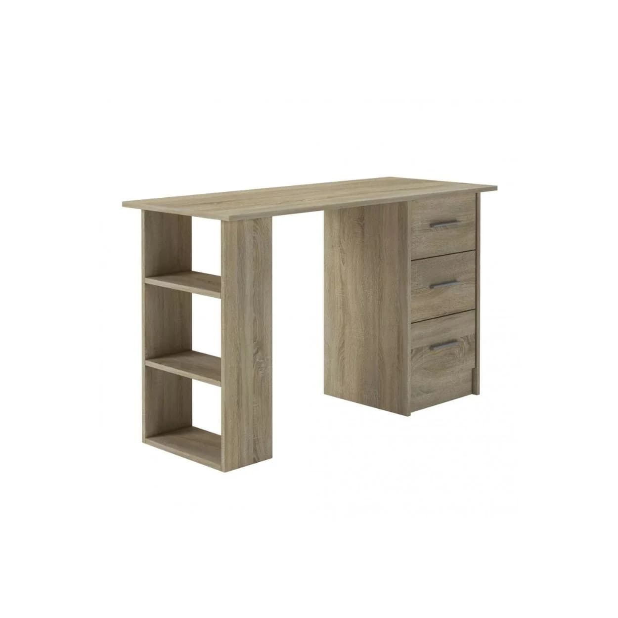 Funkcjonalne biurko SMART z trzema szufladami i półkami, dostępne w kolorze biały mat lub dąb sonoma – idealne do nauki, pracy i codziennego użytku.